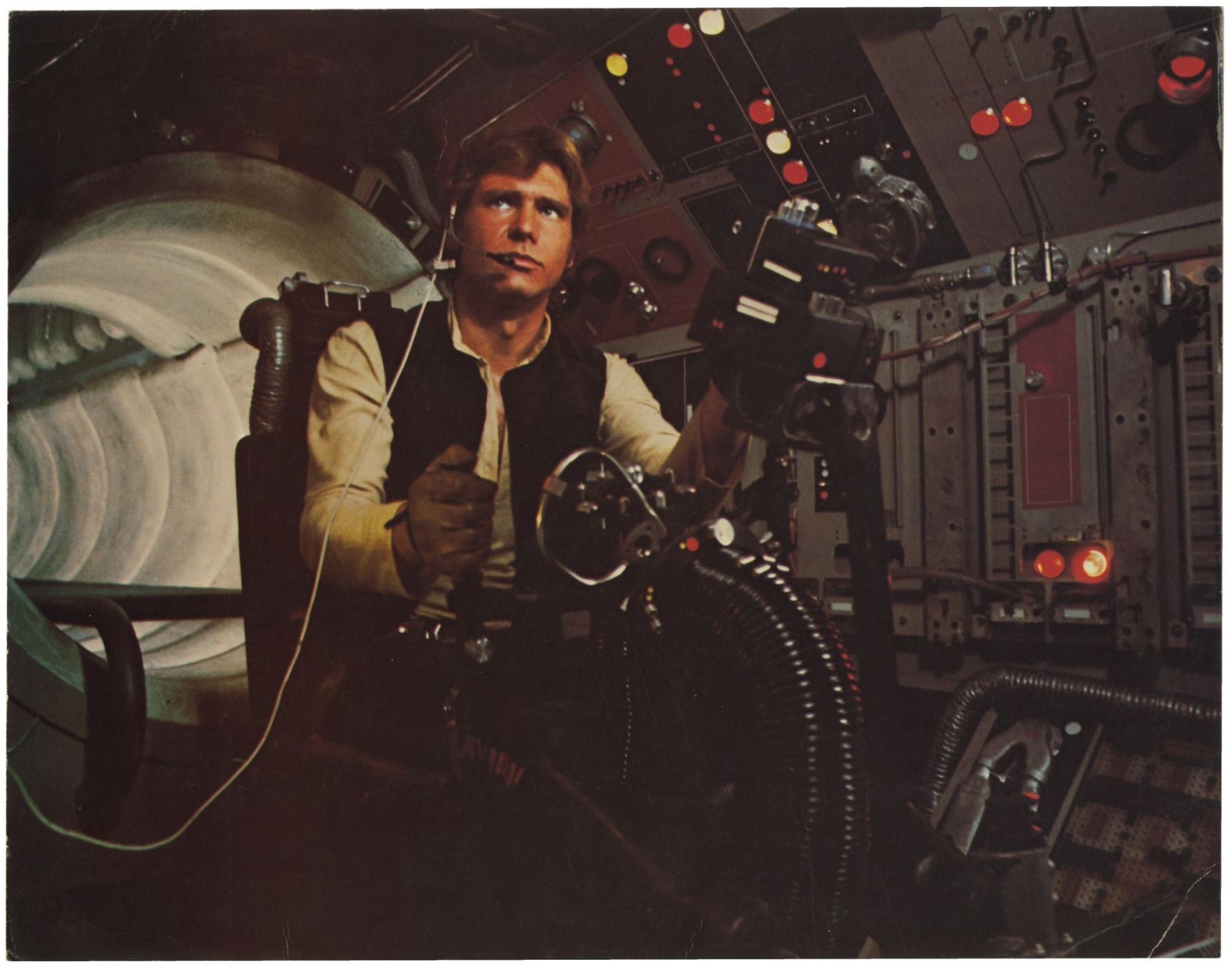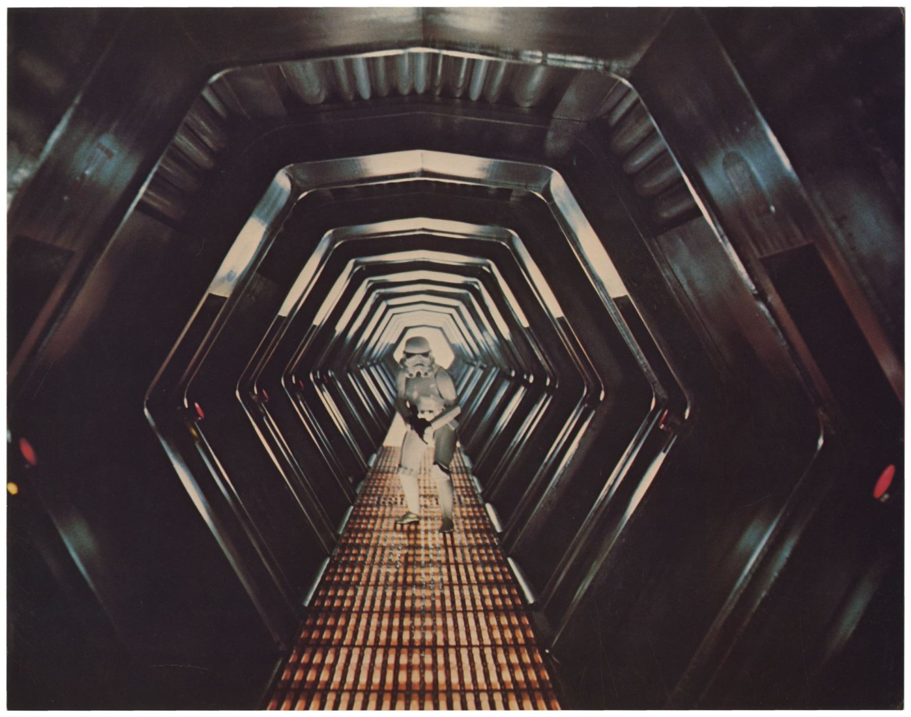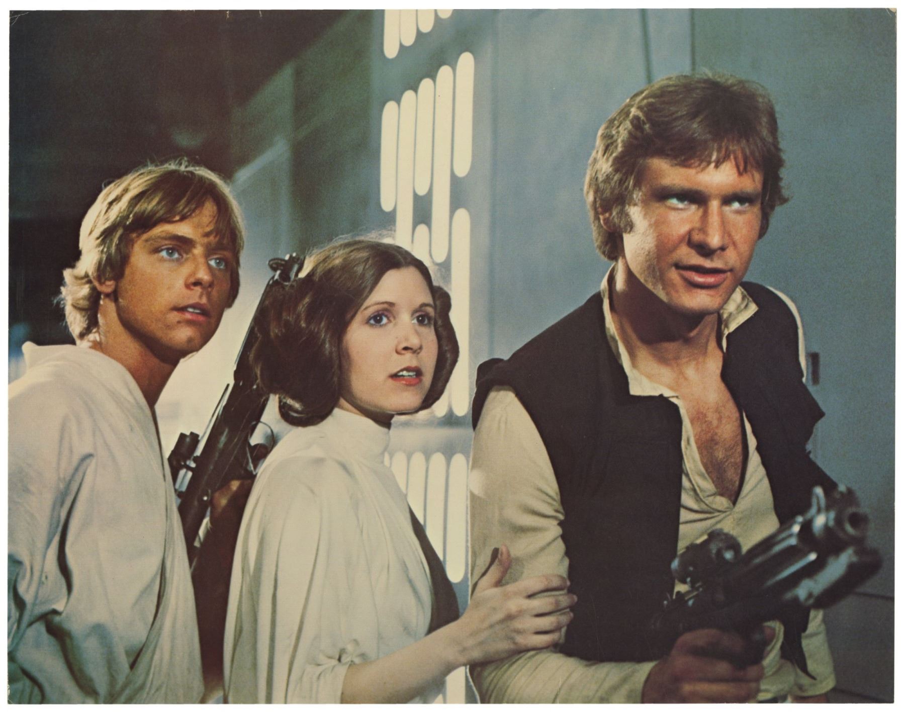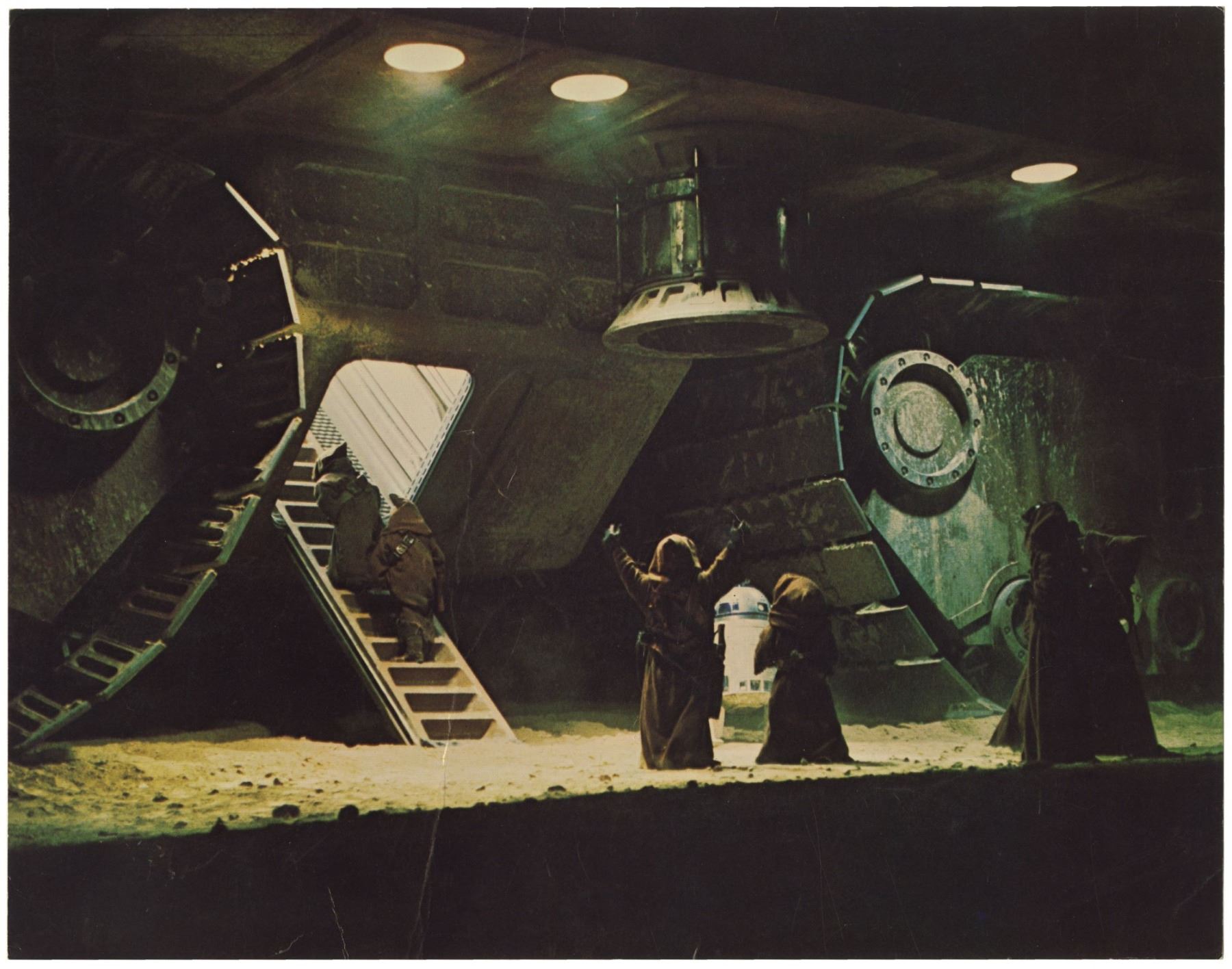 (20th Century Fox, 1977) A very rare set of (7) "borderless" lobby cards created for the original theatrical release of "Star Wars". These lobby cards lack the National Screen Service information seen on the more common cards, and these lobby cards are believed to have been printed by the Studio rather than by the NSS. The copyright information for the film is listed on the reverse of the cards which allows for larger images on the front. Measuring 11"x14", these lobby cards are in good condition with some creases and small scratches throughout from use, yellowing to the back sides from age, and some edge wear. The image of R2D2 and the sandpeople has the most yellowing on the back side.