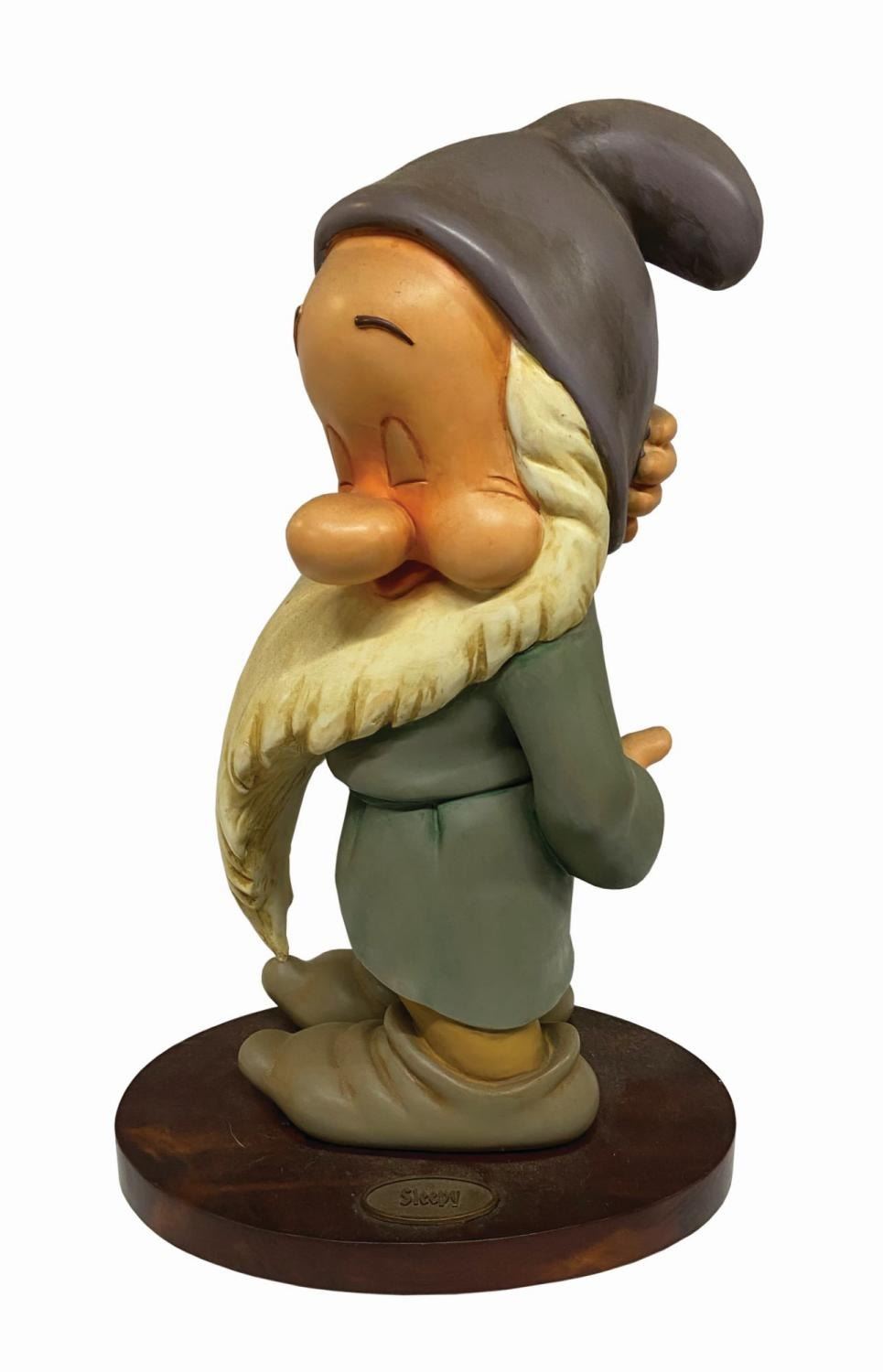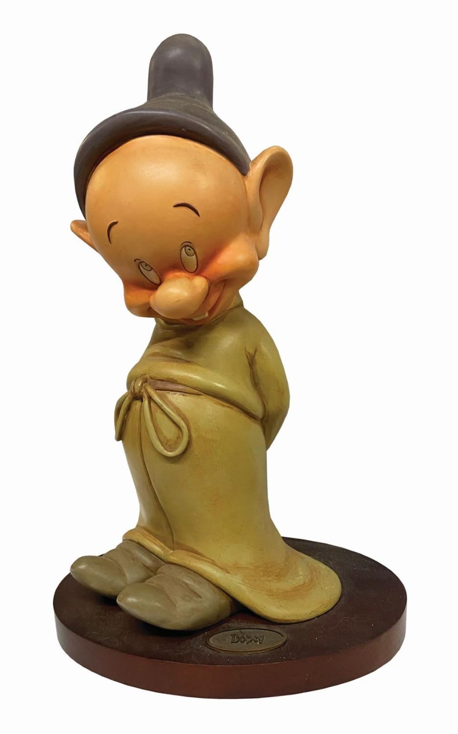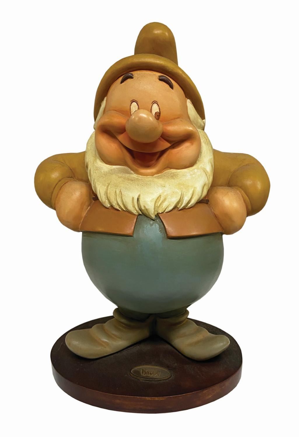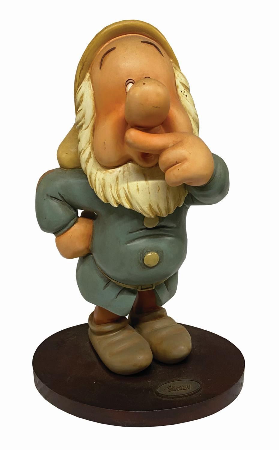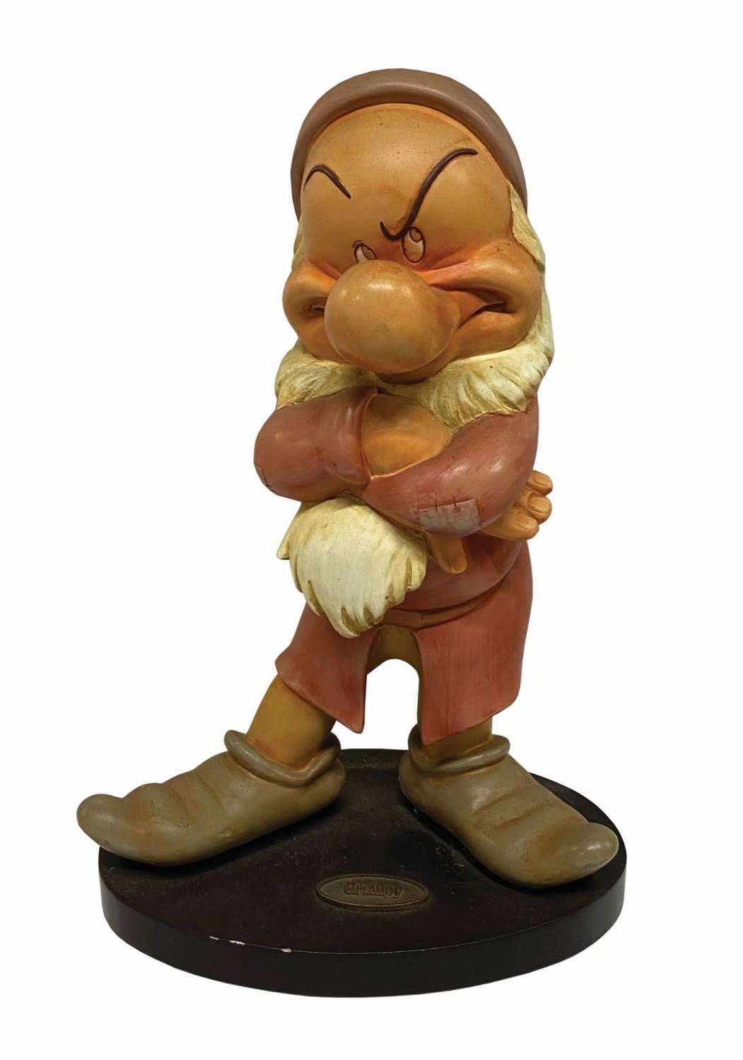 (Disney, c.2005) A collection of figures featuring all seven dwarfs in the style of Disney artist and illustrator, Gustaf Tenggren, created by Kevin Kidney and Jody Daily. Artists Kevin Kidney and Jody Daily beautifully capture Tenggren's version of the dwarfs in these resin figures, each on an individual polished wood base. With the bases included, each figure stands between 12" to 12.75" tall. The condition is good, with some spots of surface wear including paint loss and minor chipping to the base.