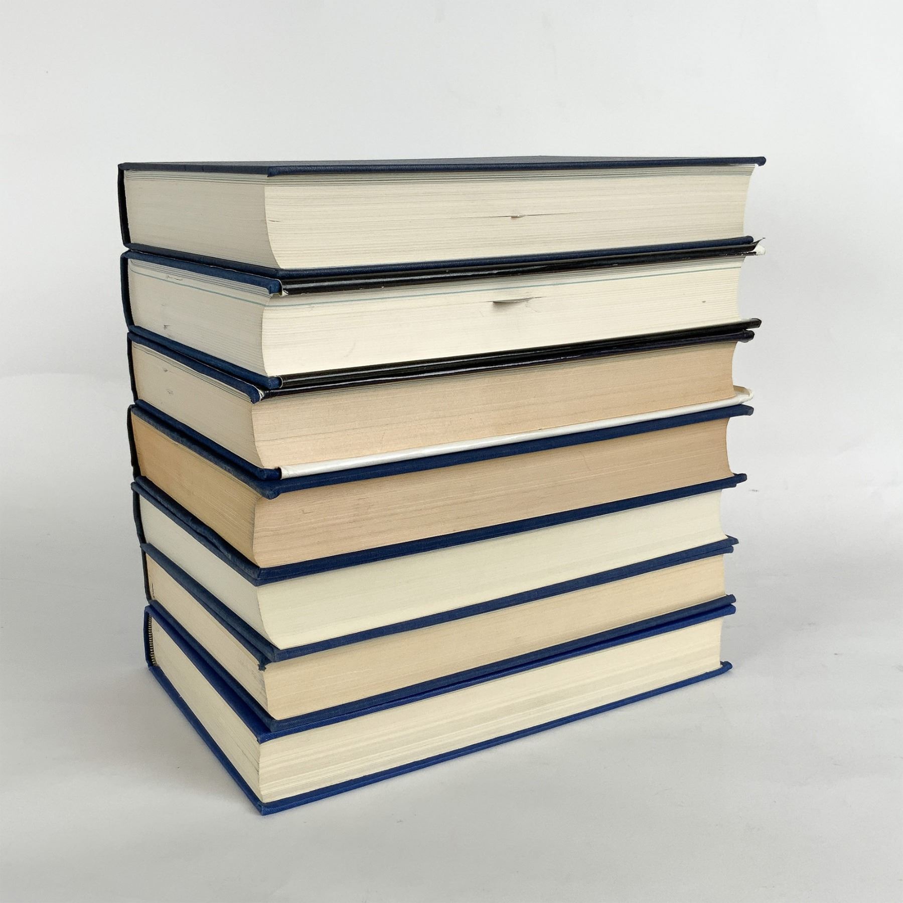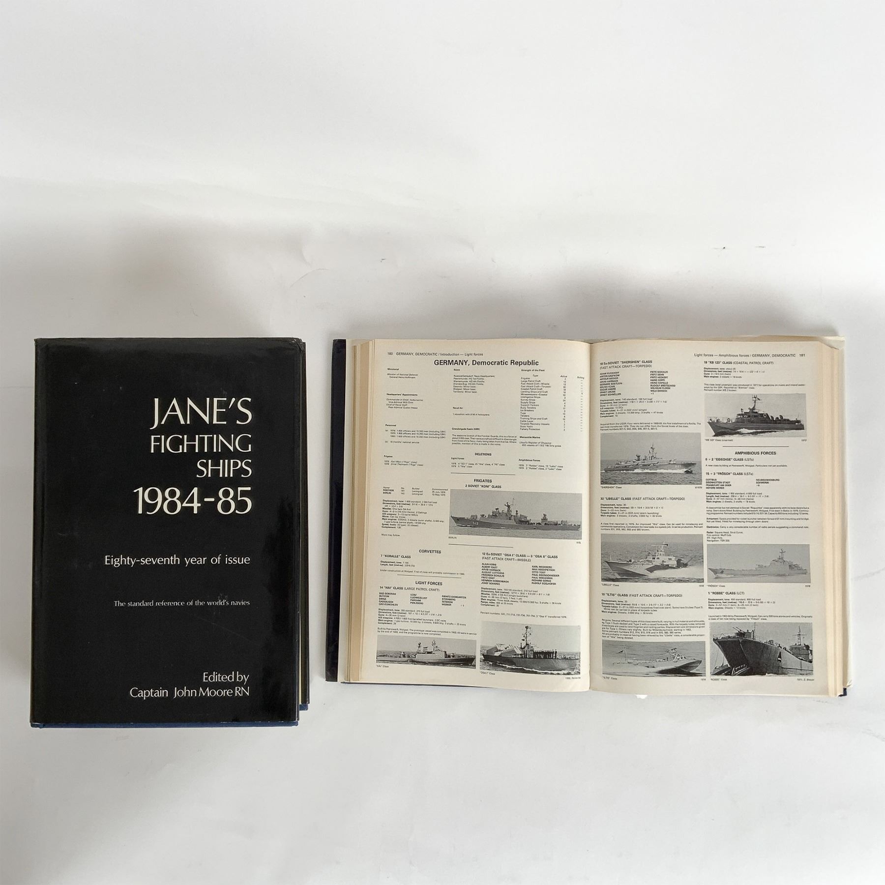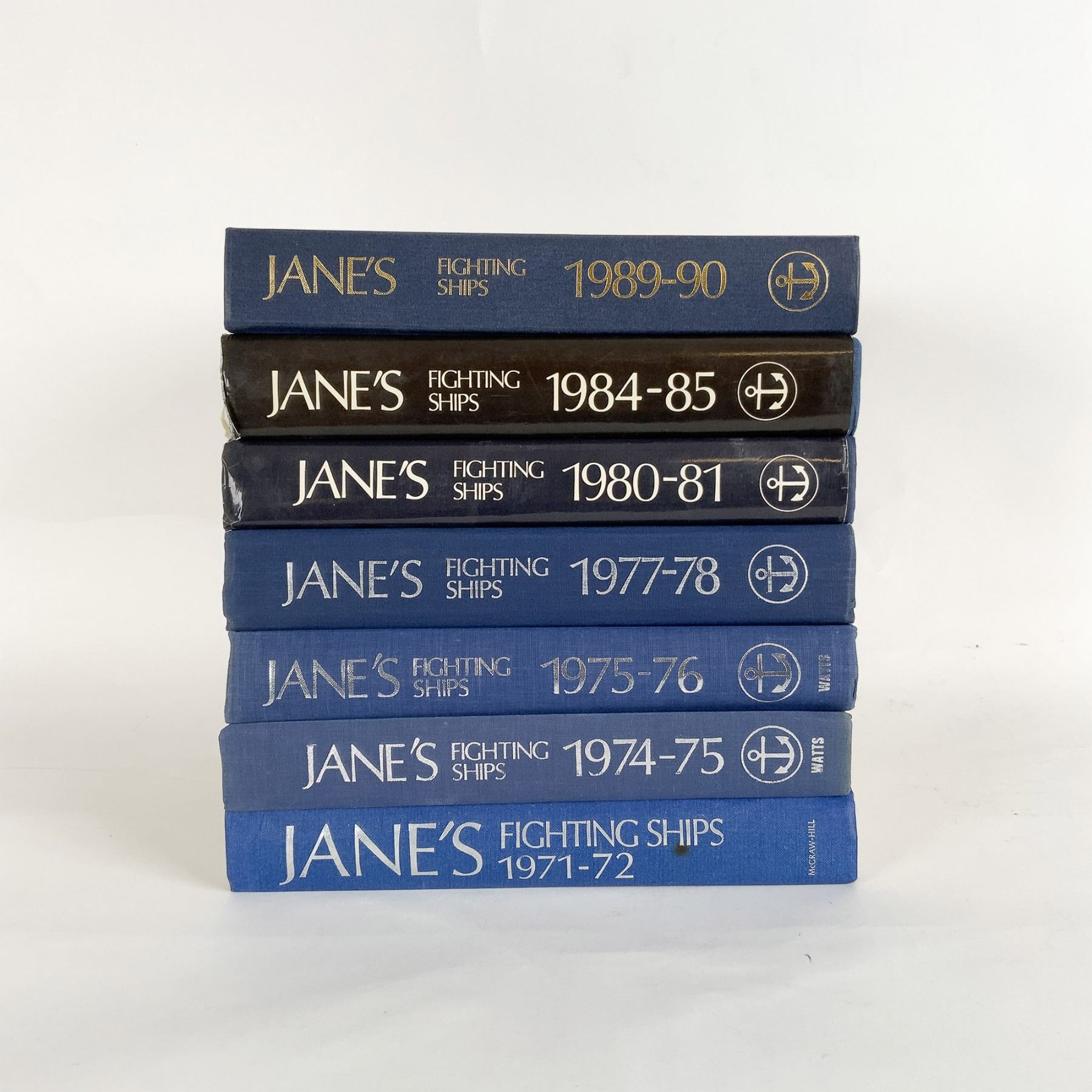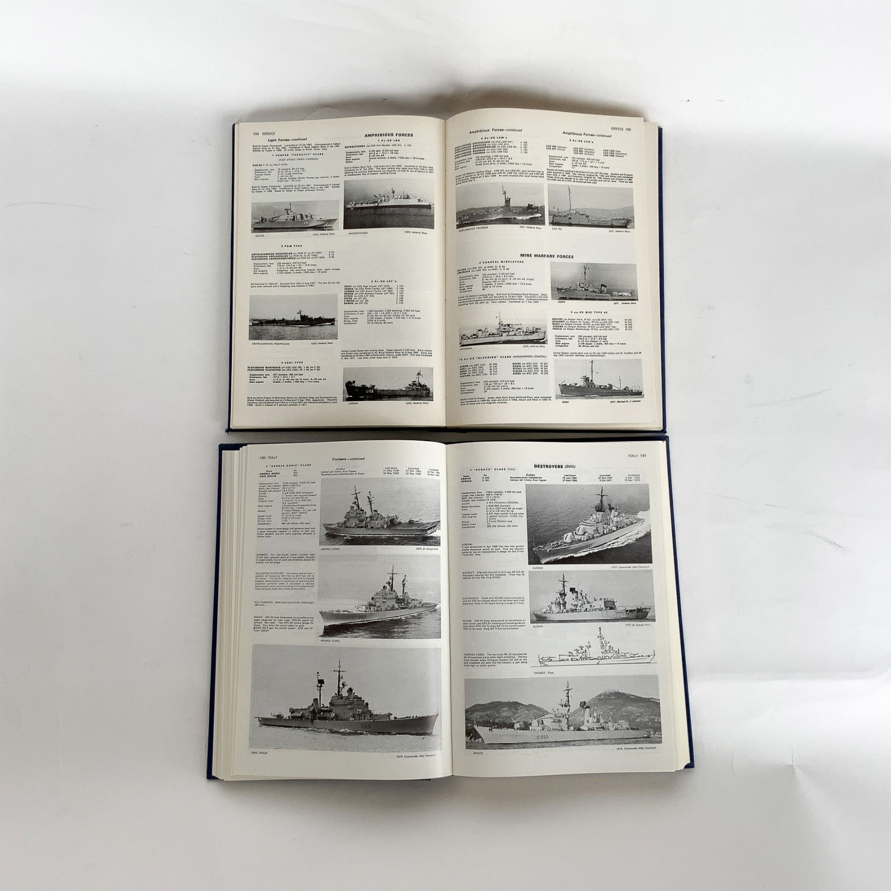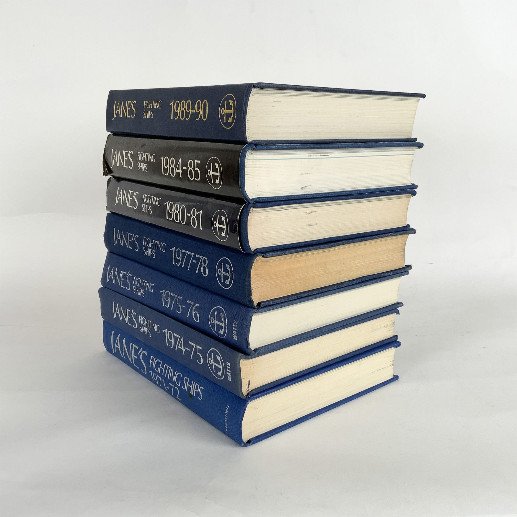 A collection of seven volumes from the esteemed Jane's Fighting Ships series, spanning the years 1971-72 through 1989-90. These authoritative reference books provide comprehensive details on naval fleets worldwide, featuring in-depth specifications, photographs, and historical insights into warships, submarines, and maritime defense systems. Edited by experts in the field, including Captain Richard Sharpe R.N., these volumes have been a crucial resource for military historians, collectors, and naval enthusiasts. The set includes editions from 1971-72, 1974-75, 1975-76, 1977-78, 1980-81, 1984-85, and 1989-90, each bound in hardcover with the publisher's signature gold and silver lettering. Some wear is consistent with age and use, but overall, the books remain in good condition for research and display.