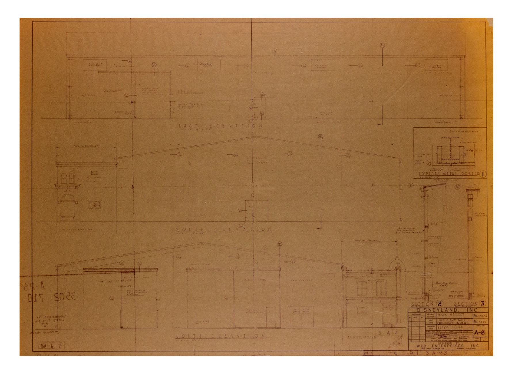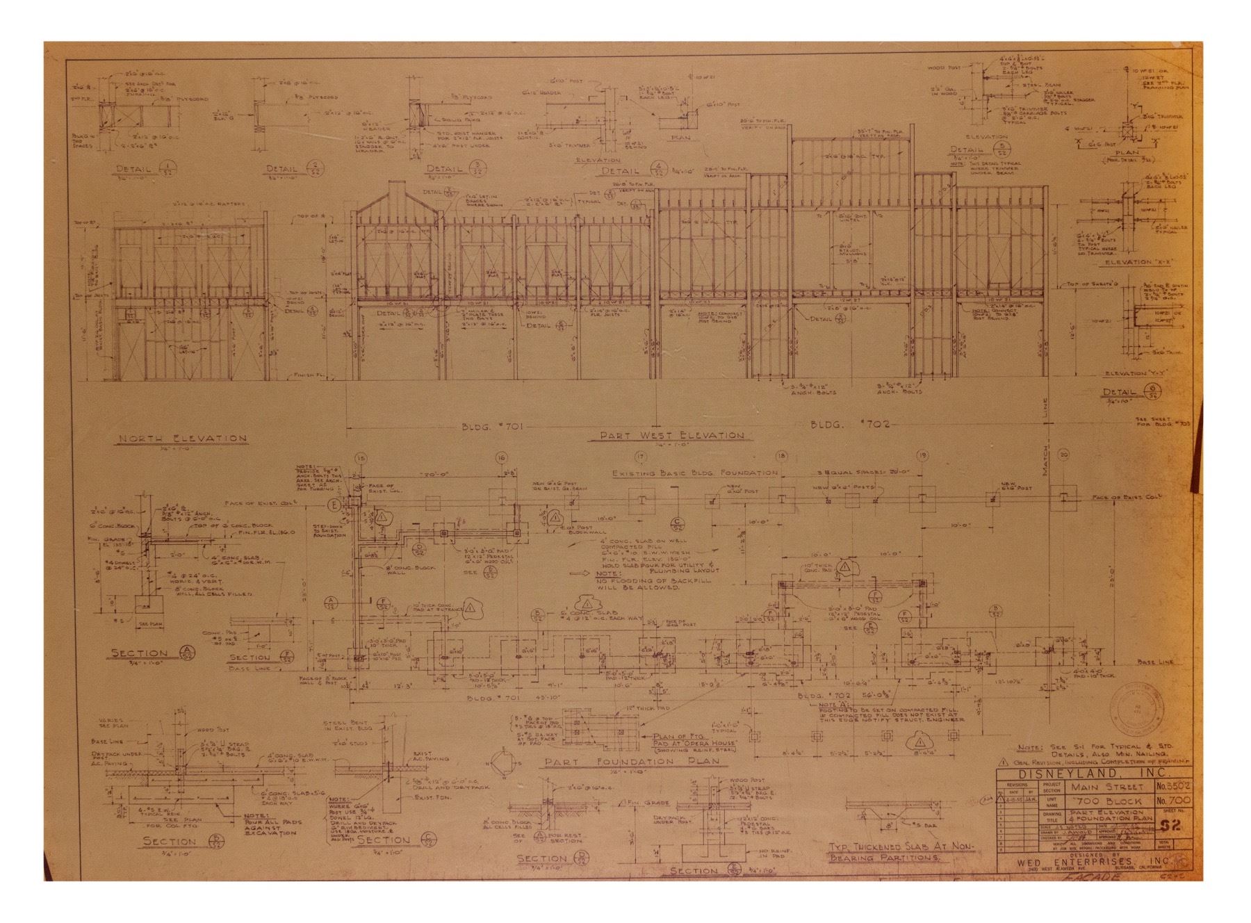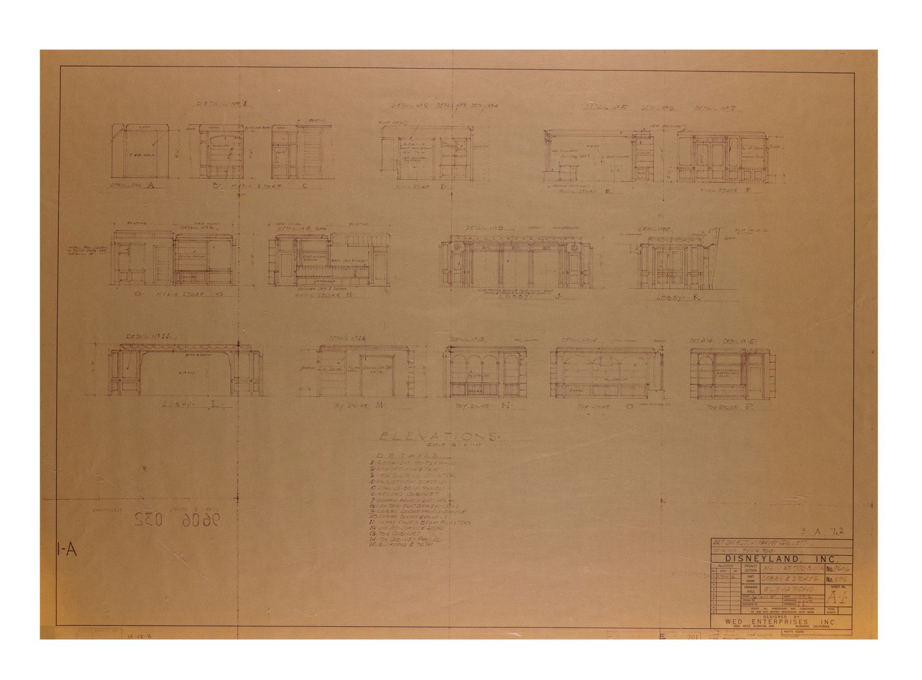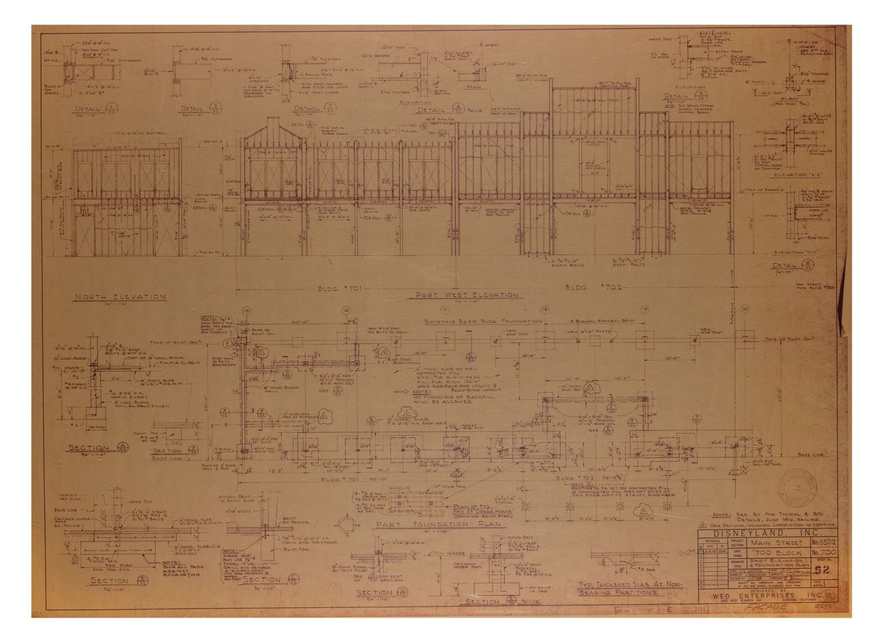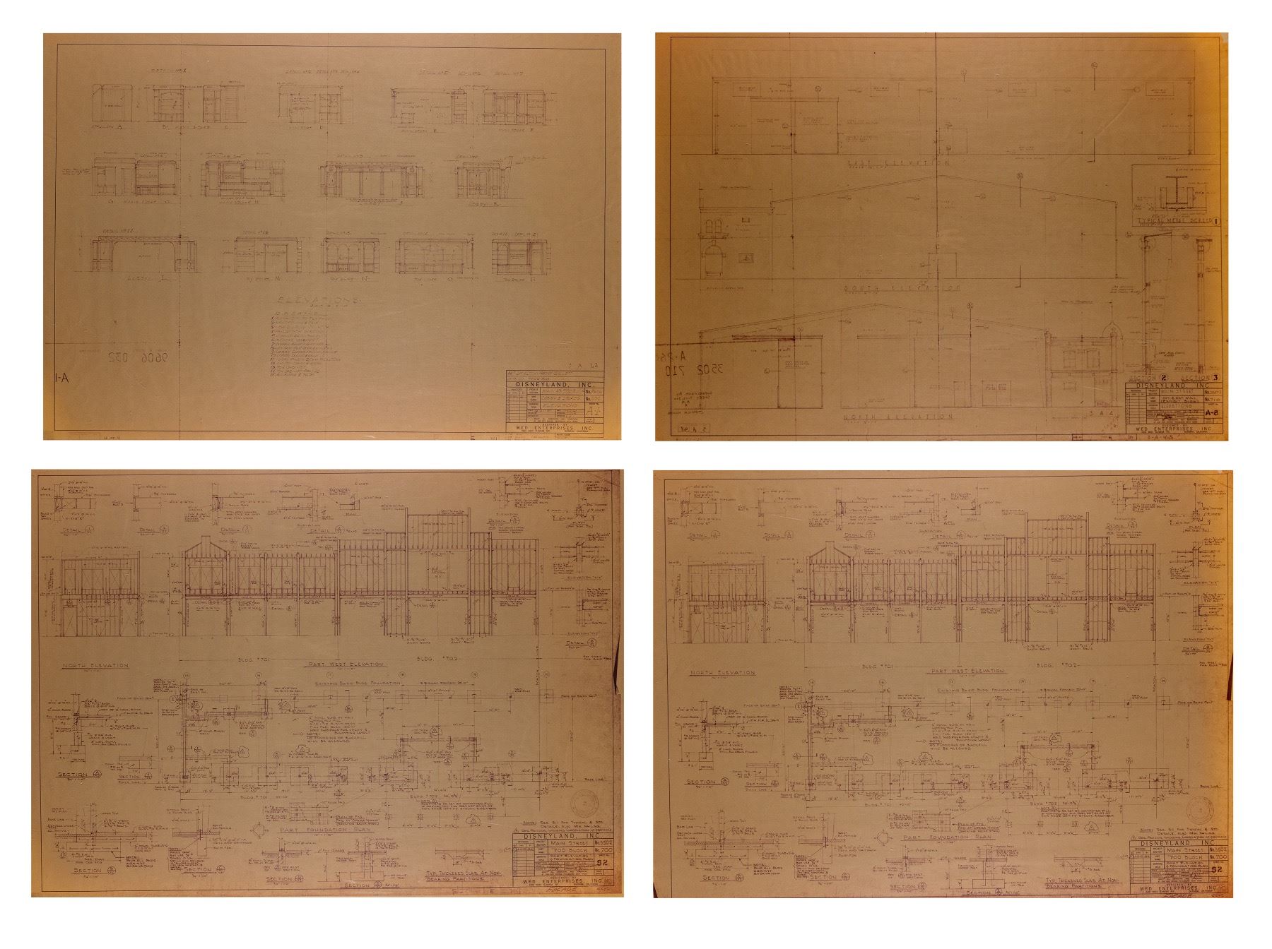 (Disneyland, c.1970s-80s) A collection of (7) construction brownlines featuring details for the buildings in the "700 Block" of Main Street at Disneyland. The "700 Block" is home to the Opera House and its adjacent buildings. These brownlines feature the original imagery dated in the 1950s, although they were most likely used between the 1970s and 1980s. These brownlines include (6) 30"x42" brownlines and (1) 42.5"x64" brownline. This set is in very good condition overall, with spots of edge-wear to some of the brownlines from use including some tearing along the top-left edge of the largest brownline.