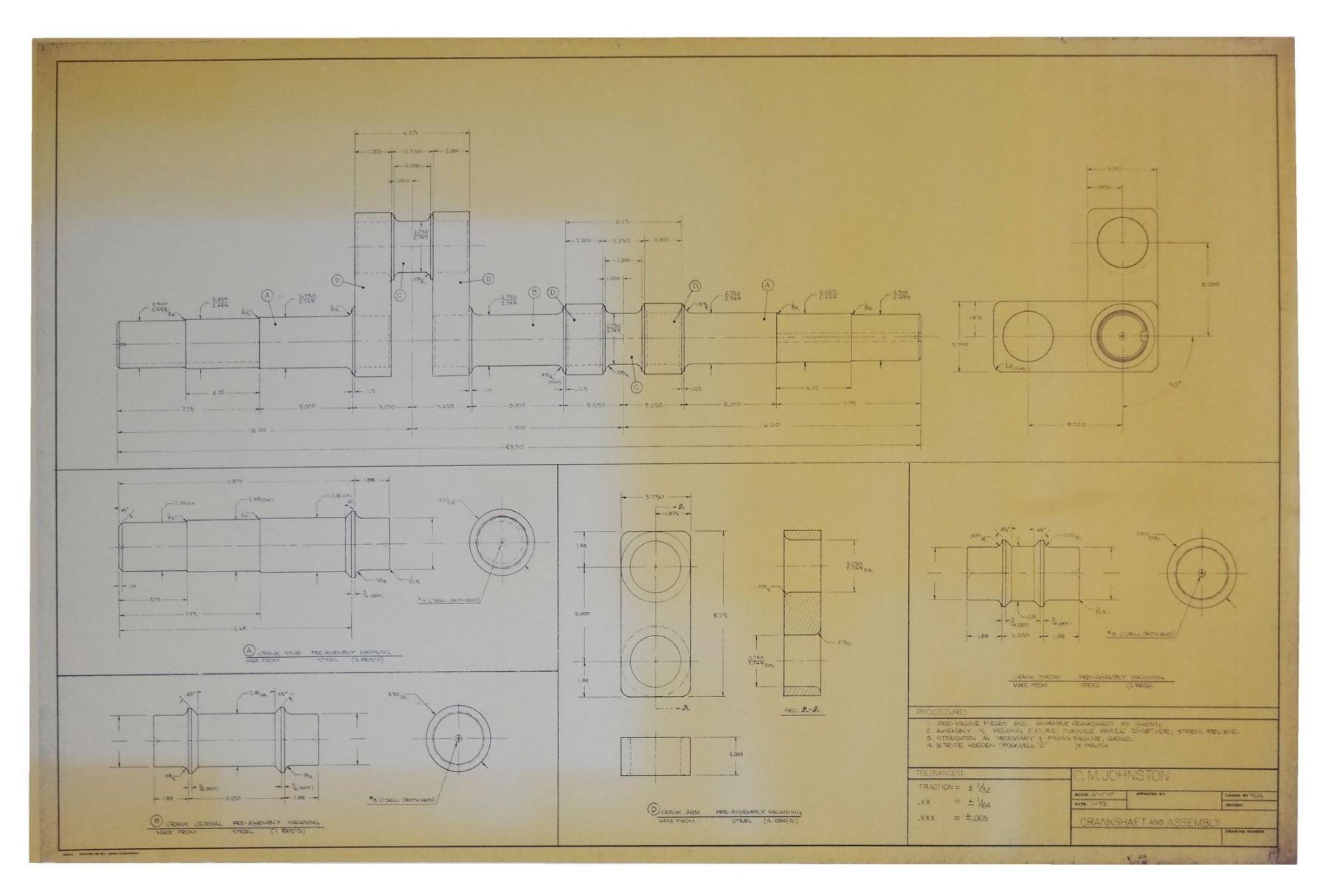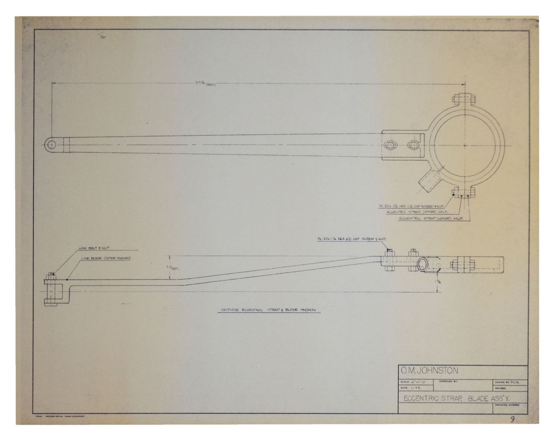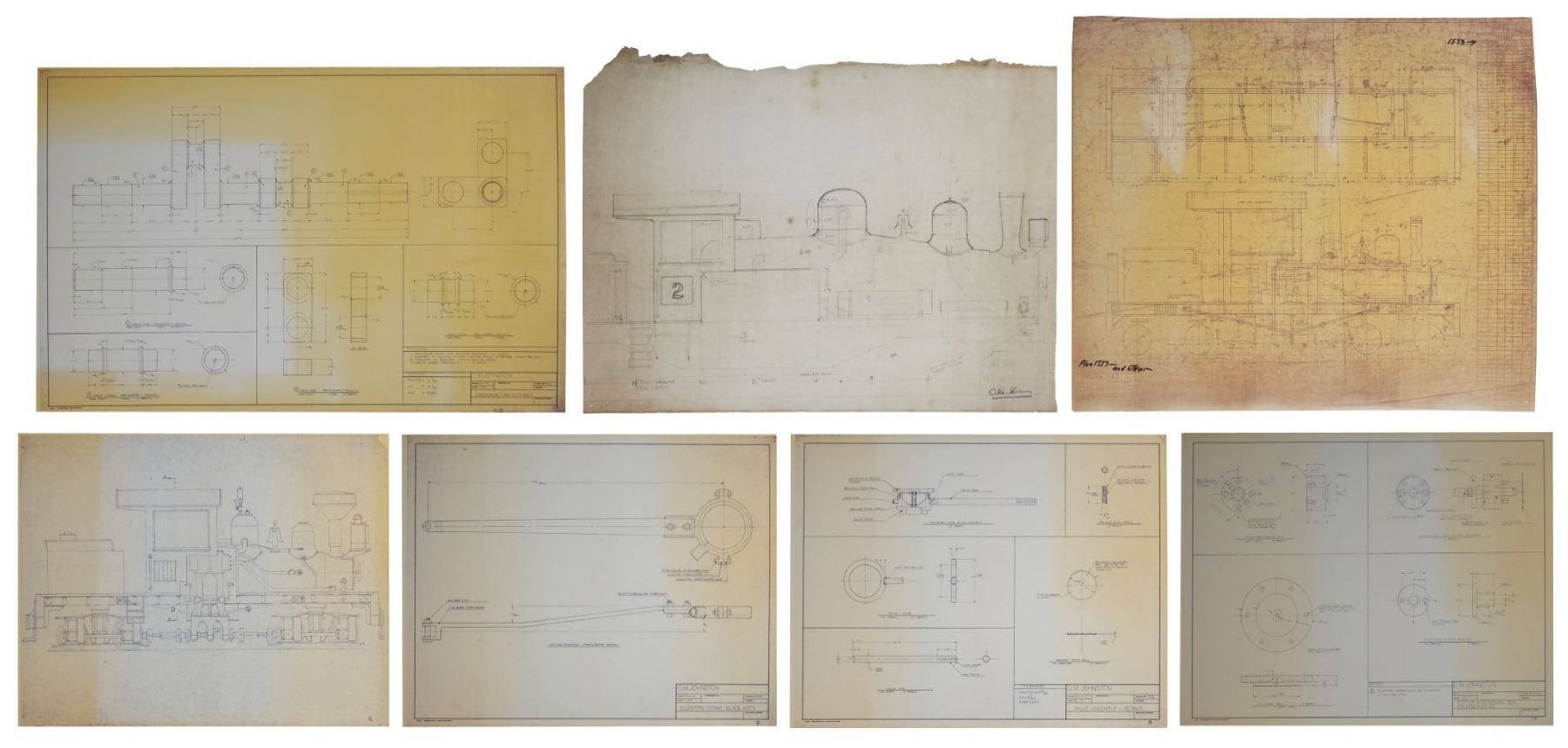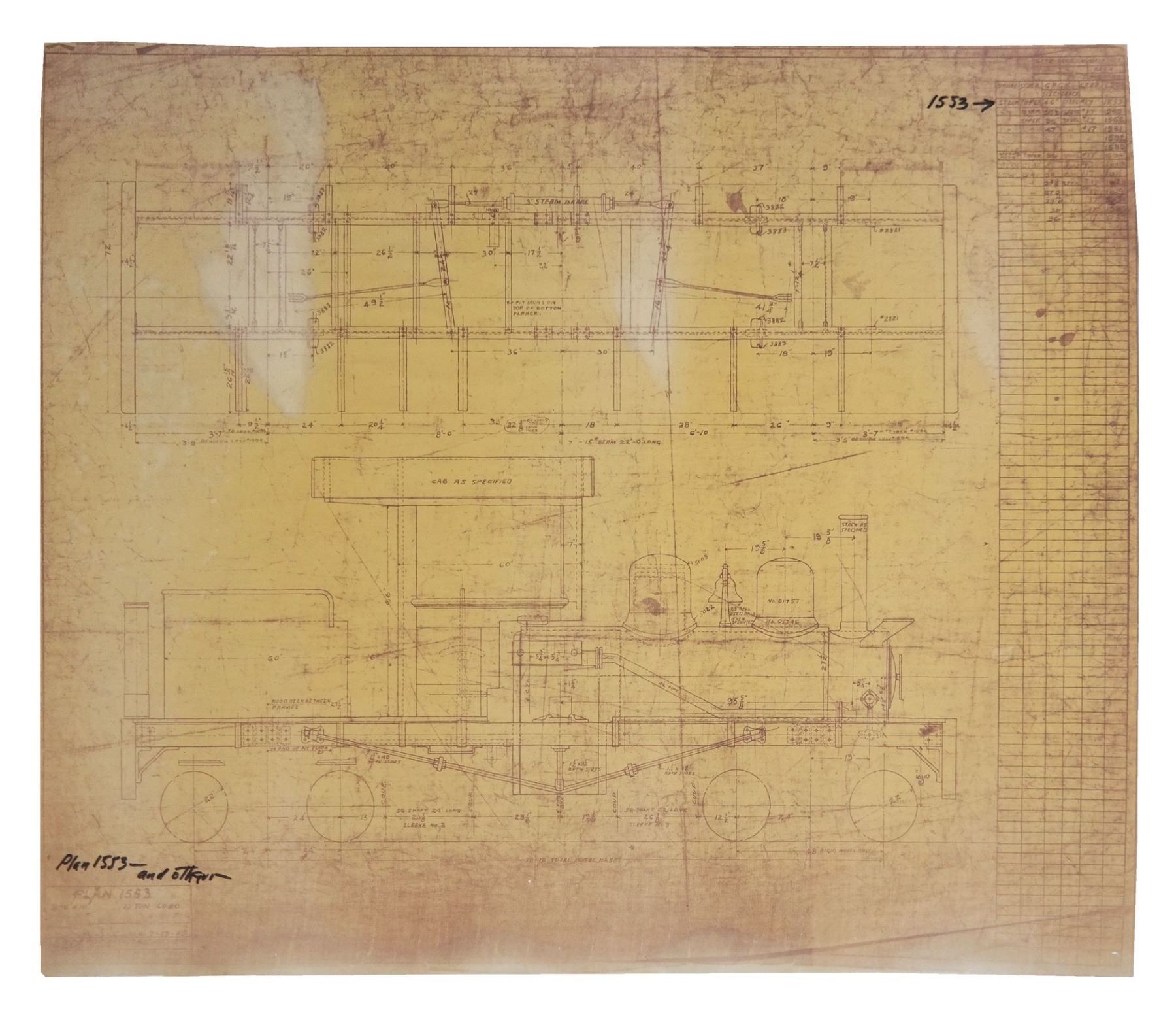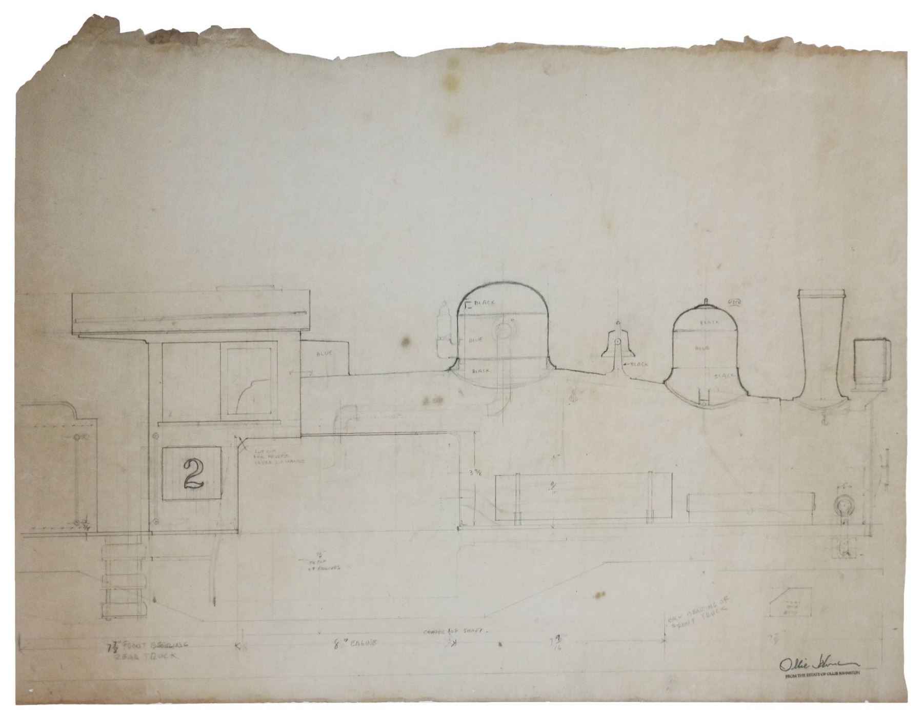 (Johnston, c.1950s-70s) A set of (6) blueprints and one original blueprint drawing for Disney Legend Ollie Johnston's personal backyard railroad. Johnston is known as one of Walt Disney's Nine Old Men and worked as an animator on countless Disney productions. Johnston was also an avid fan of trains, and much like Walt Disney, operated several miniature steam engines he had built for his backyard railroad. These blueprints offer a unique glimpse into the components of his Shay engine, which Johnston built himself, as well as a later model. Johnston hand-drew the side-view image of the train in pencil, and the bottom right is stamped "From the estate of Ollie Johnston". The blueprints range in size from approximately 17.25"x22.25" to 22"x34.25" and are in fair to good condition overall, with some tearing along the top edge of the original drawing and slight wrinkling to the sheets. Several of the blueprints show discoloration and wear from use.