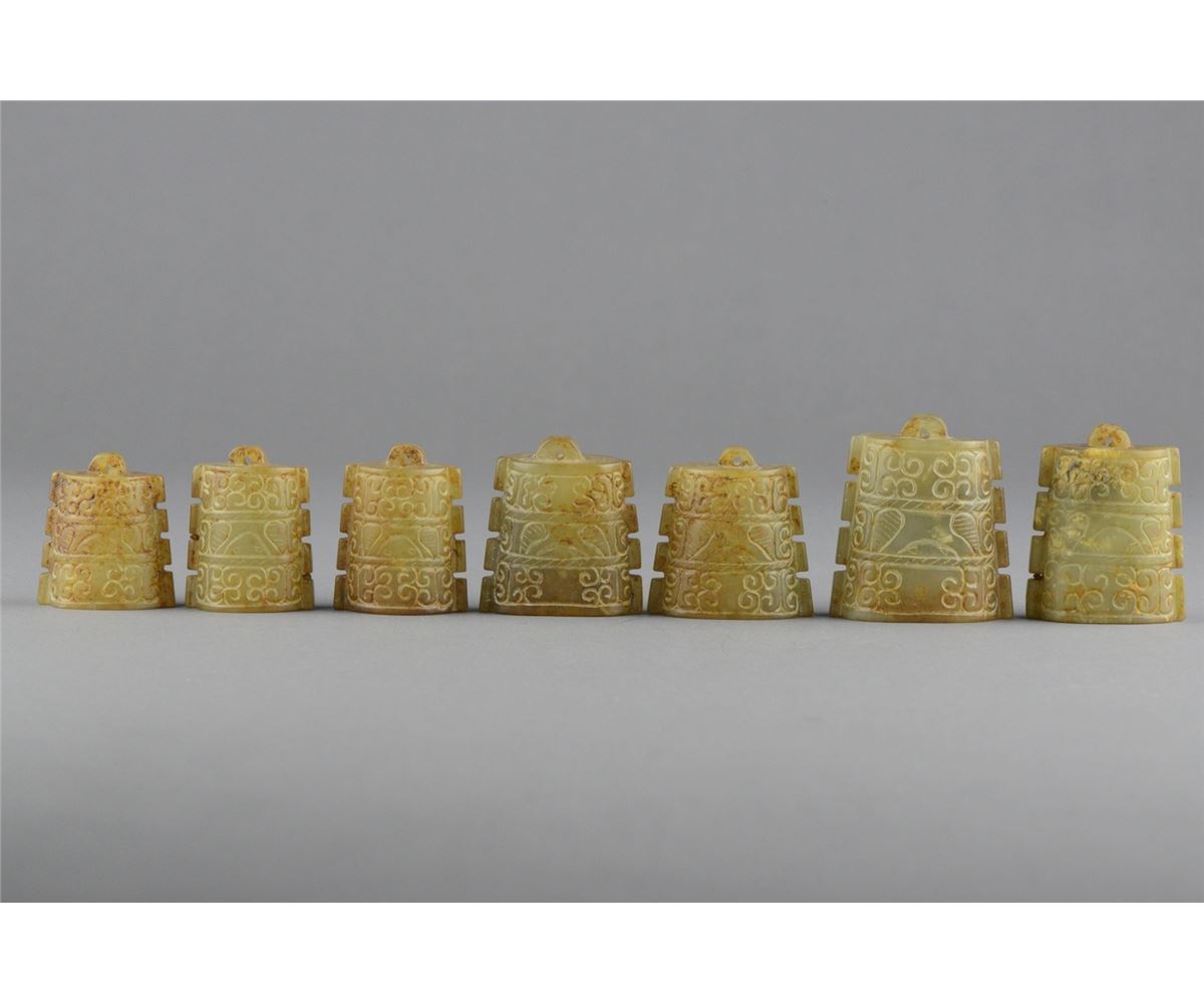 Set of seven pieces of Chinese carved jade bells with open work silver box; set possibly Ming or earlier; H: 4 cm, L: 4 cm, 44 grams