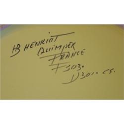 Set of 7 Quimper dinner plates. Measure 10" x 10". 4 plates depict male character and 3 depict a female character. Marked on back "Hg. Henriot-Quimper-France-F.303-D.301" and artist initials RG, NF, MH, CS, VF (2), NS.