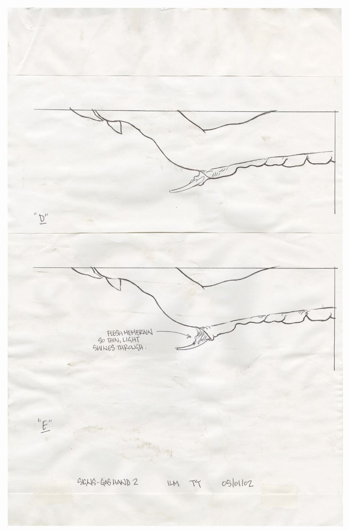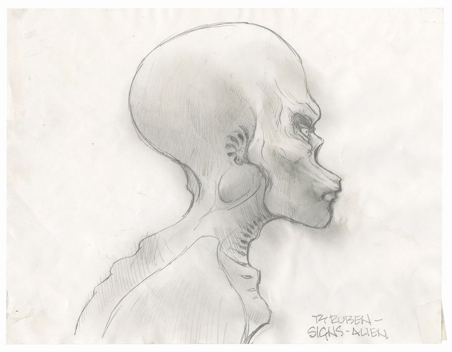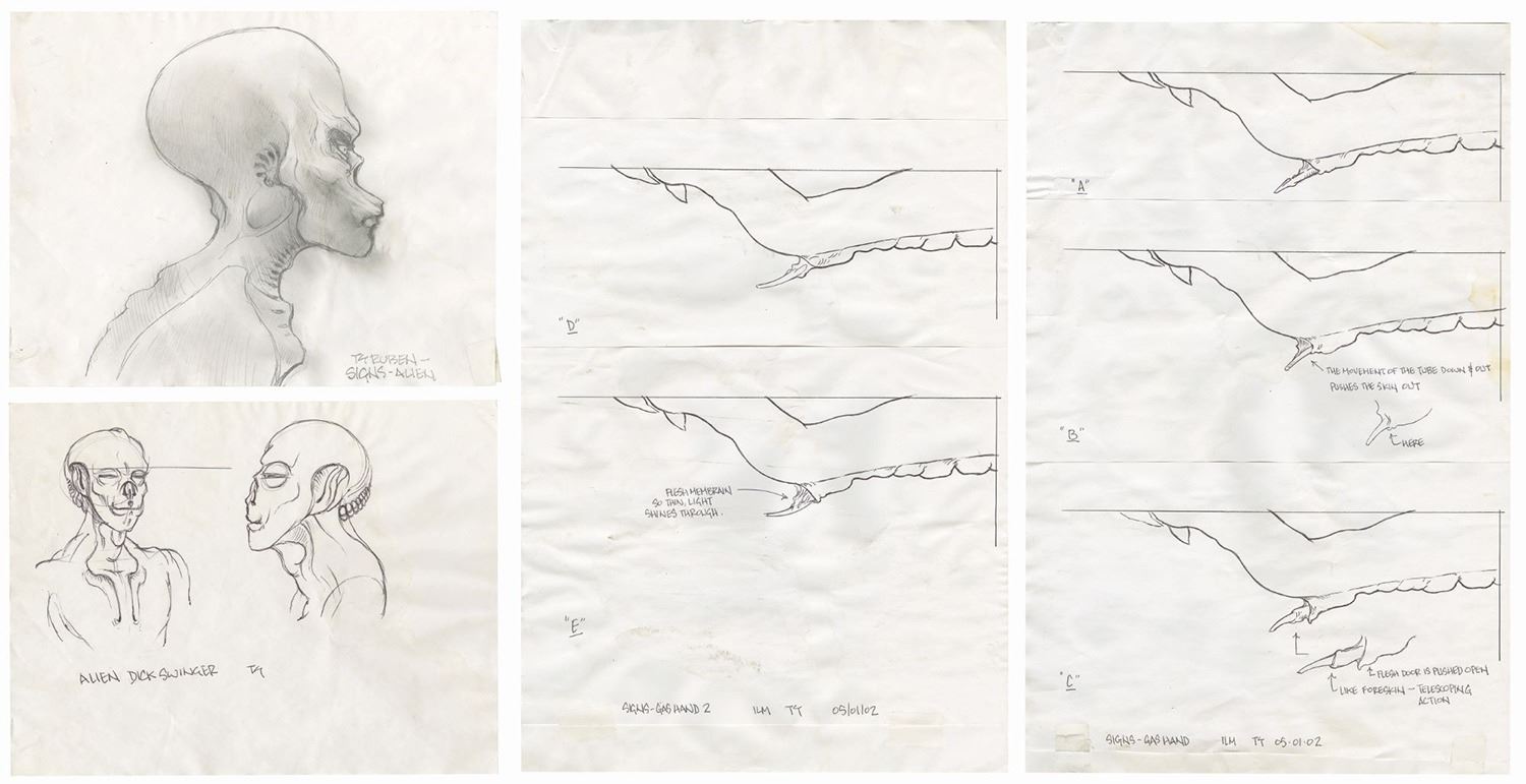 (Touchstone, 2002) A series of (7) original drawings created during the development of M. Night Shyamalan's science fiction film Signs. These drawings show aspects of the alien creature, including (2) drawings of the face, and (5) sequential drawings showing the protruding spire from the alien's arm which sprayed a gas on Morgan Hess in the film. The drawings are accomplished in ink on paper, except for the side-view of the alien's head which is drawn in pencil. The sequential drawings are on individual sheets which were adhered to two larger sheets of paper. The sheets range in size from 8.5"x11 to 17"x11". The condition is fair overall with small amounts of creasing and several spots of discoloration from use.