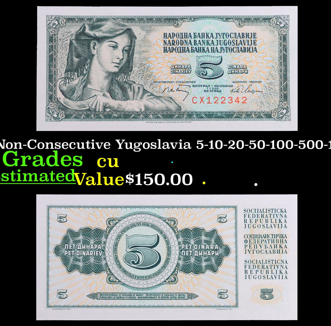 Set of 7 Yugoslavia Non-Consecutive Yugoslavia 5-10-20-50-100-500-100 Dinara Note series Grades CU.