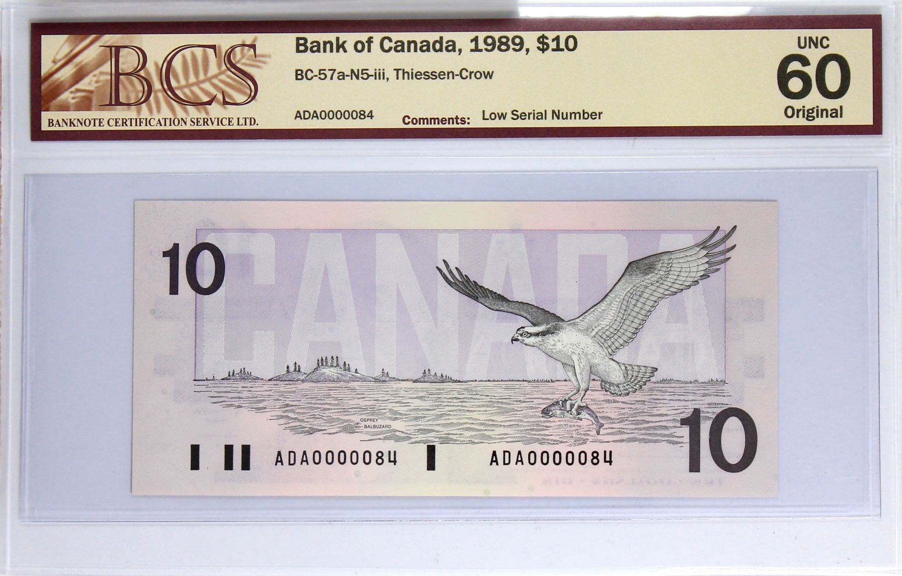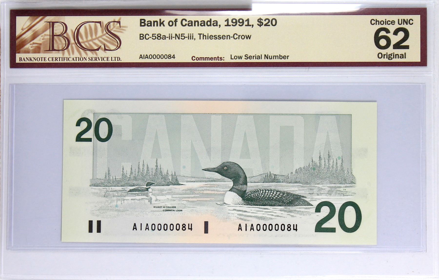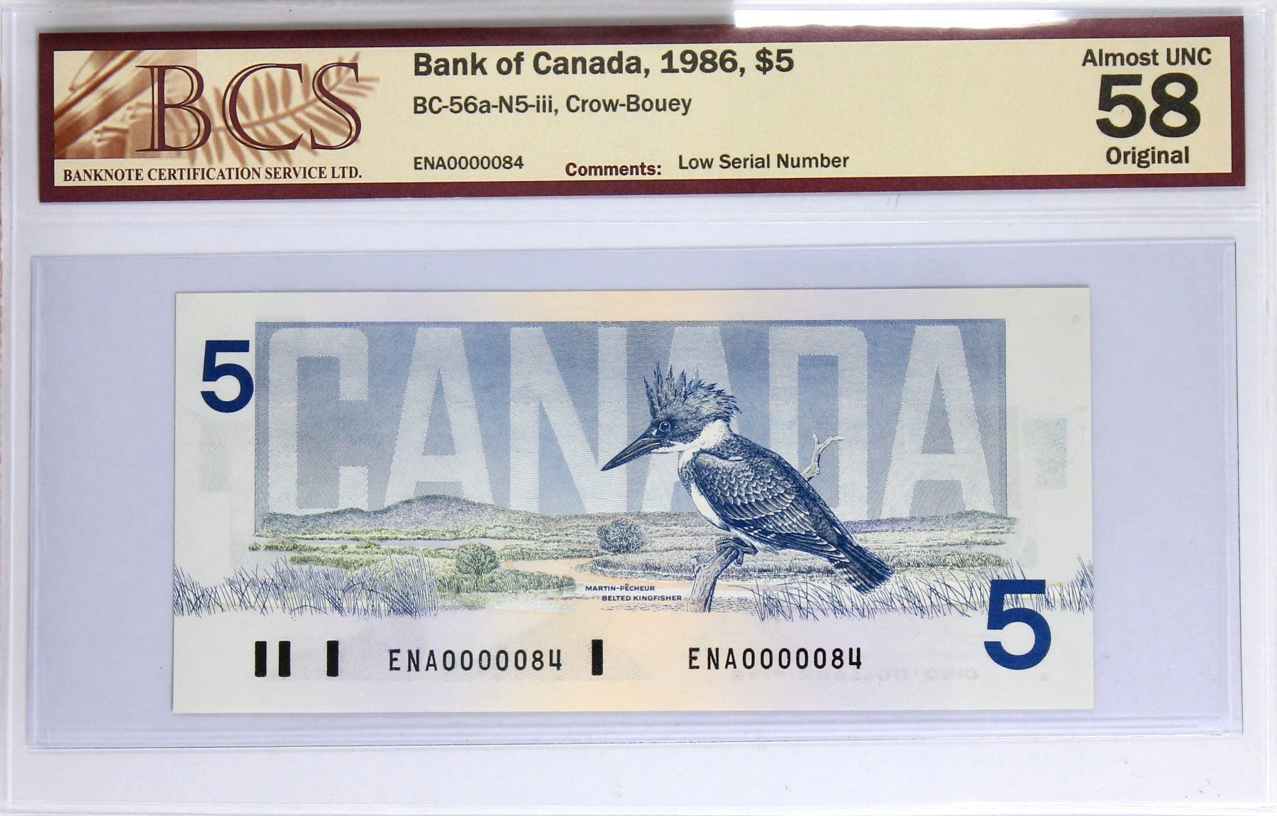Set of 7x Matching Lowe Serial Number Bird Series Banknotes (CH# N5-iii S/N: 0000084) All note are BCS Certified AU-58-CUNC-63 Original! (7pc) Lot includes: (BC-56a $5 ENA Prefix AU-58, BC-56c-i $5 ANA Prefix UNC-60, BC-57a $10 ADA Prefix UNC-60, BC-58a-ii $20 AIA Prefix CUNC-62, BC-58a $20 EIA Prefix UNC-60, BC-59a $50 EHP Prefix AU-58, BC-60a $100 AJN Prefix CUNC-63) A great investment Opportunity! Buy in confidence knowing these notes have been professionally graded to the Canadian Standards.