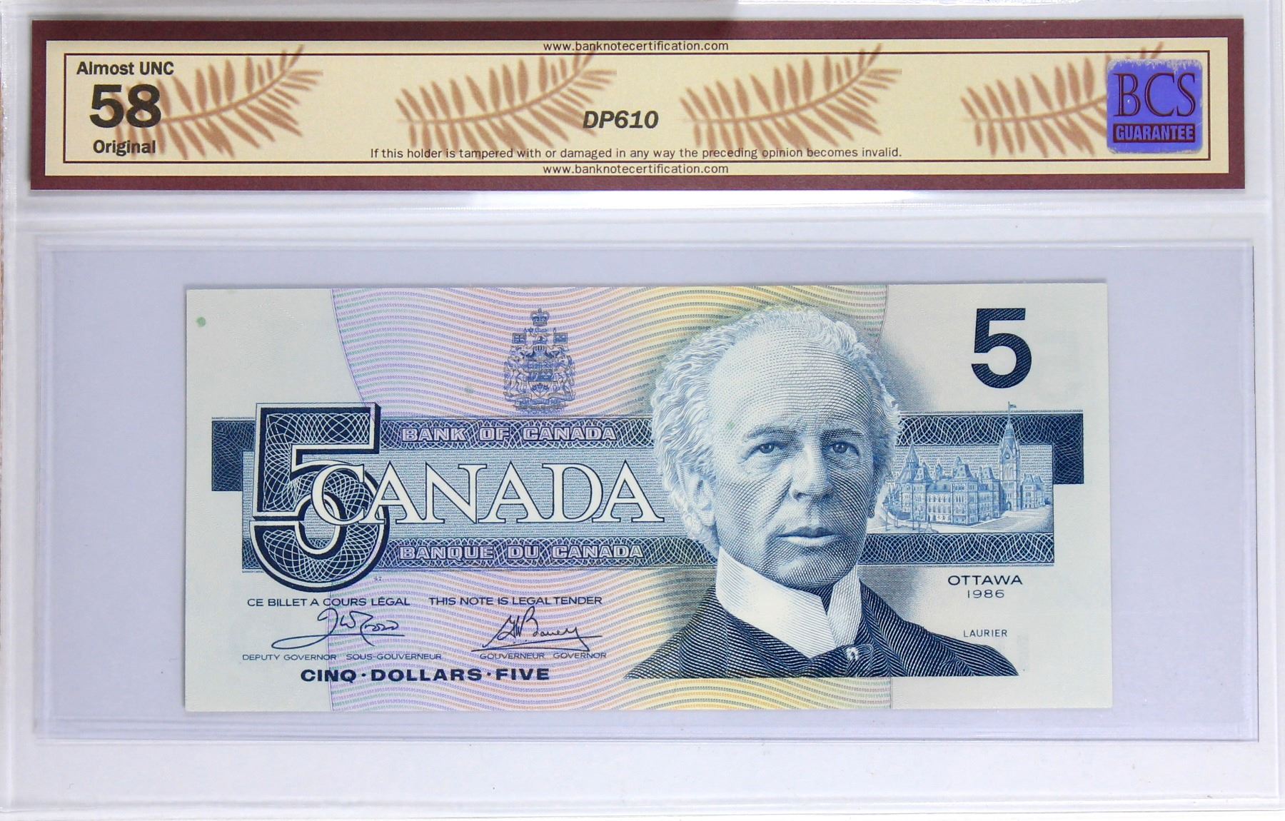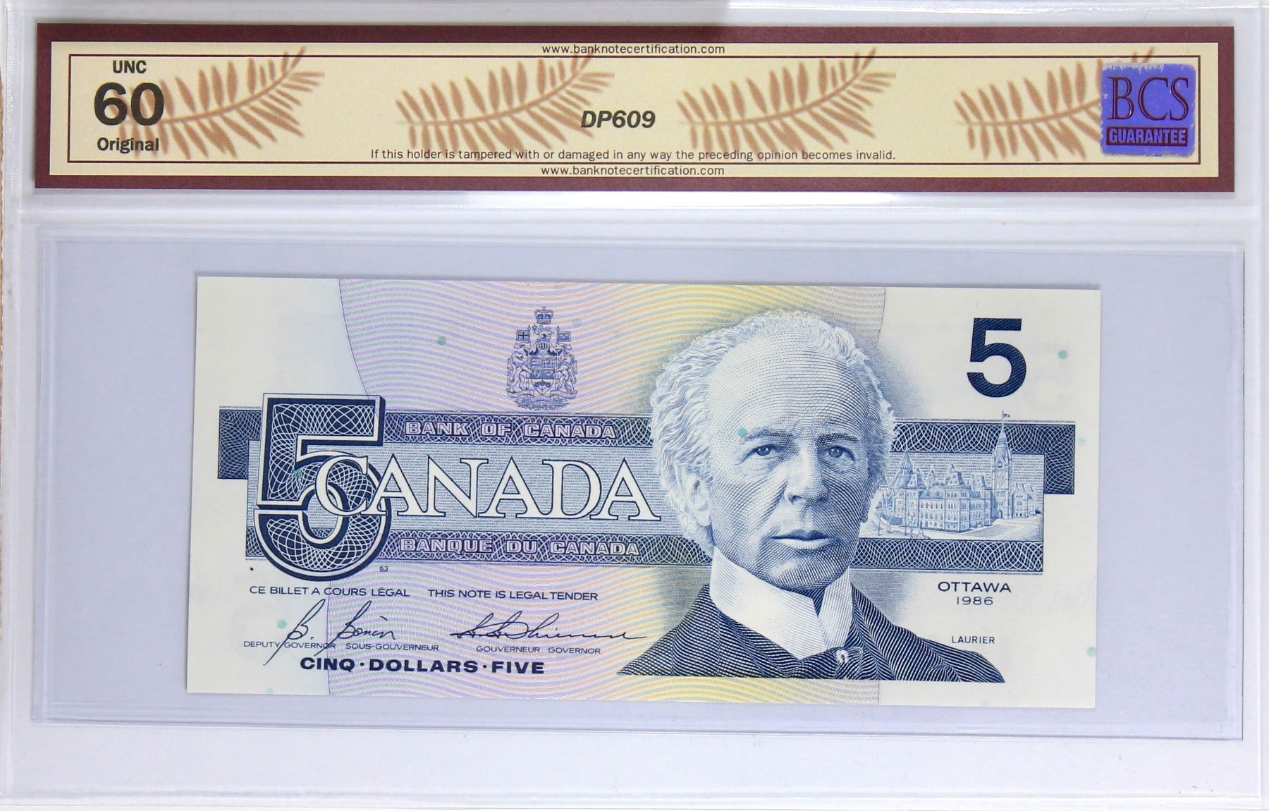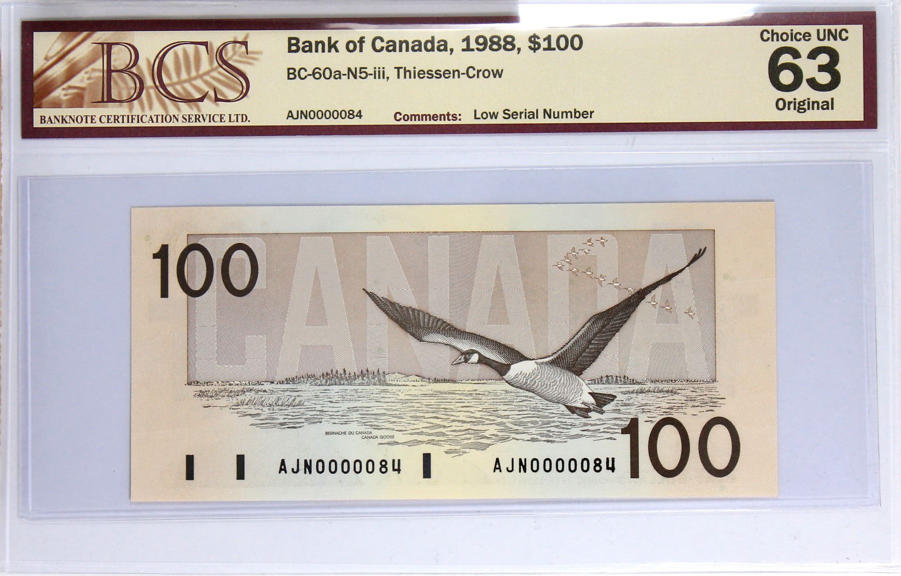 Set of 7x Matching Lowe Serial Number Bird Series Banknotes (CH# N5-iii S/N: 0000084) All note are BCS Certified AU-58-CUNC-63 Original! (7pc) Lot includes: (BC-56a $5 ENA Prefix AU-58, BC-56c-i $5 ANA Prefix UNC-60, BC-57a $10 ADA Prefix UNC-60, BC-58a-ii $20 AIA Prefix CUNC-62, BC-58a $20 EIA Prefix UNC-60, BC-59a $50 EHP Prefix AU-58, BC-60a $100 AJN Prefix CUNC-63) A great investment Opportunity! Buy in confidence knowing these notes have been professionally graded to the Canadian Standards.