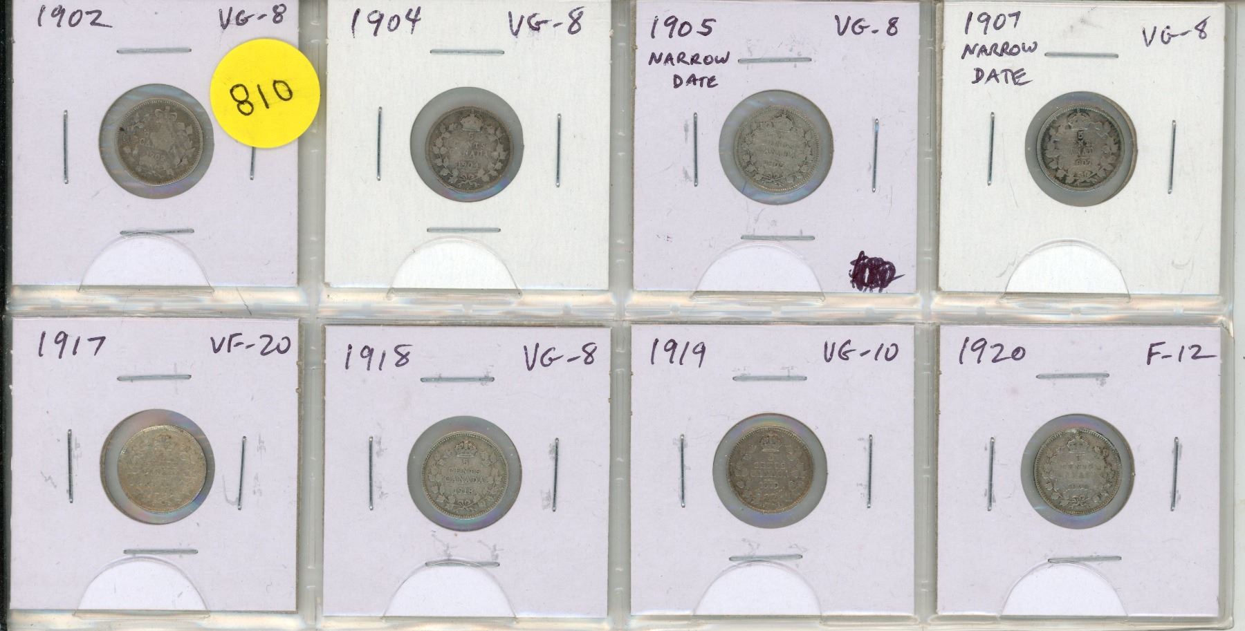 Set of 8 Canadian Silver 5 Cents. Includes 1902, 1904, 1905 Narrow Date, 1907 Narrow Date, 1917, 1918, 1919 & 1920. Coins grade VG-8 to VF-20.