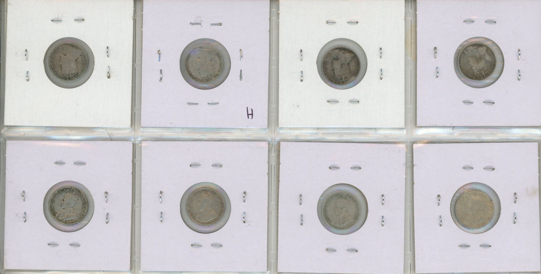 Set of 8 Canadian Silver 5 Cents. Includes 1902, 1904, 1905 Narrow Date, 1907 Narrow Date, 1917, 191
