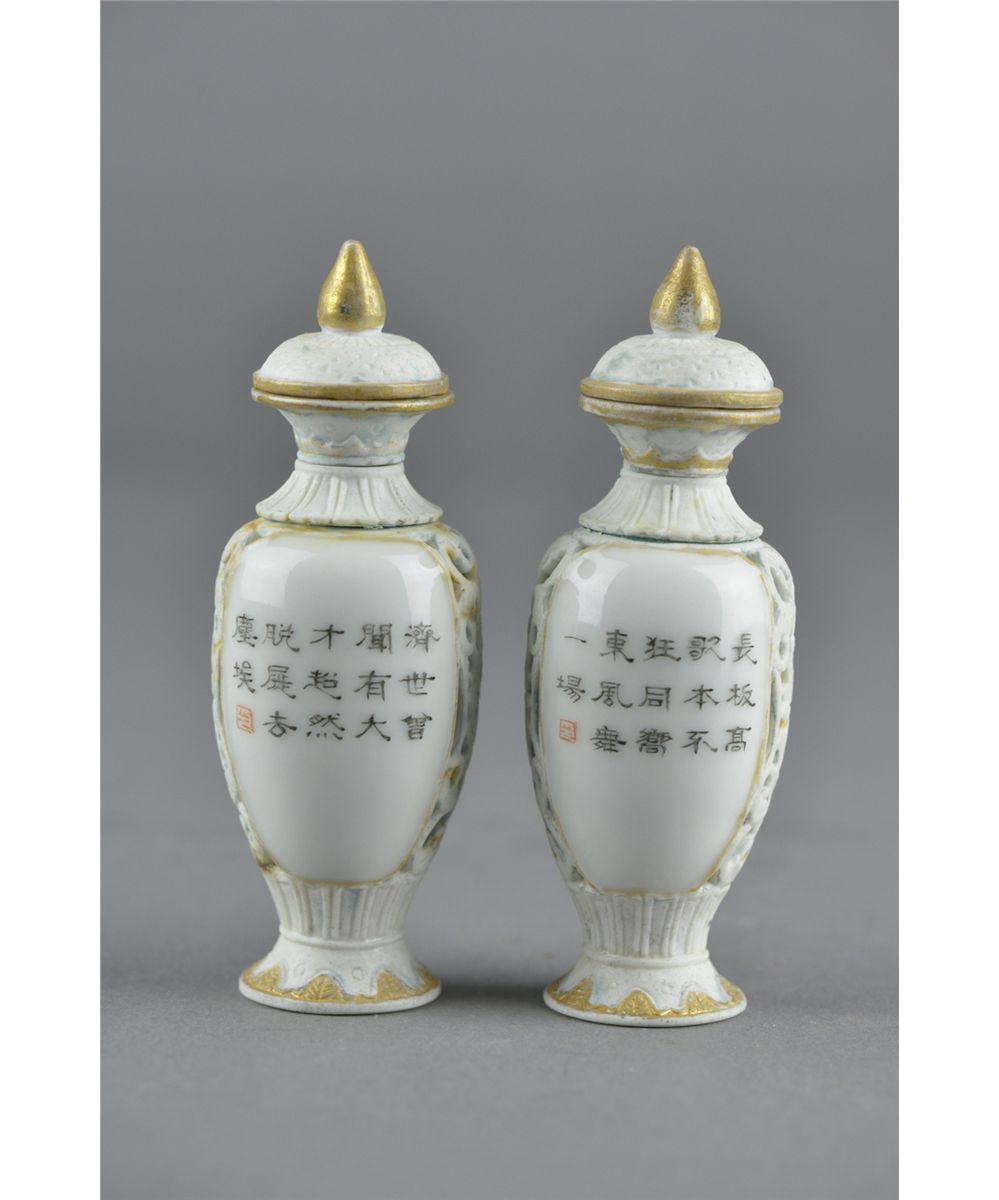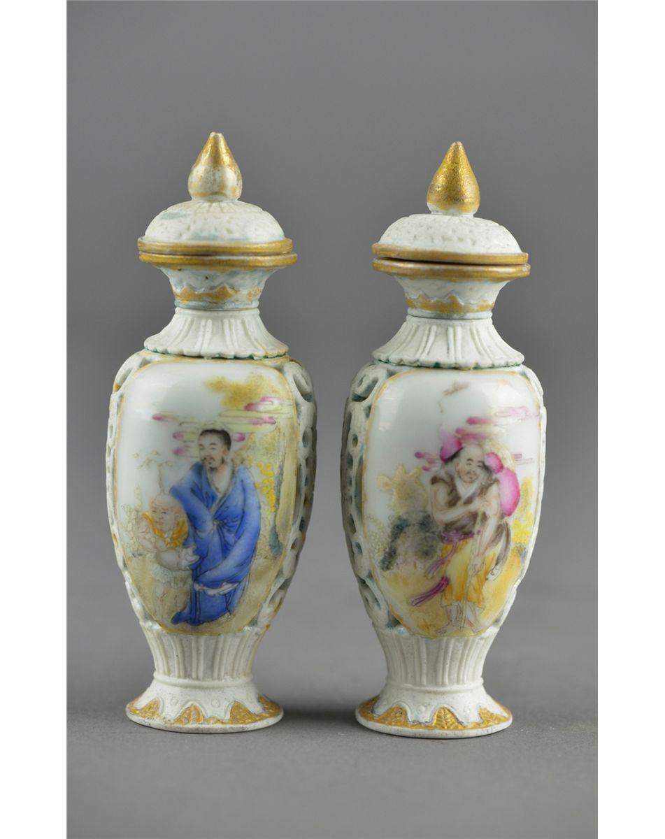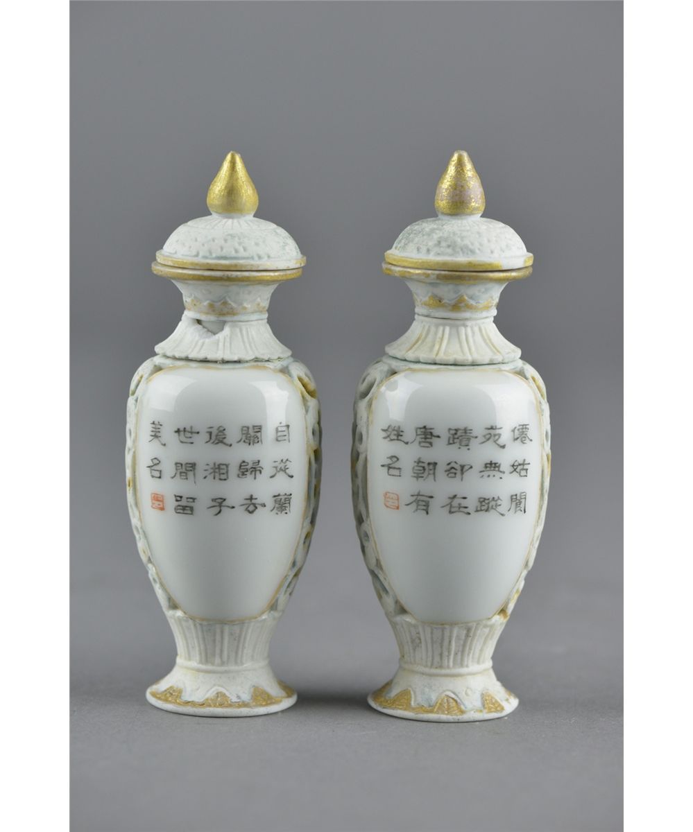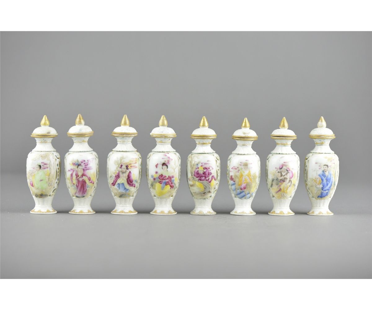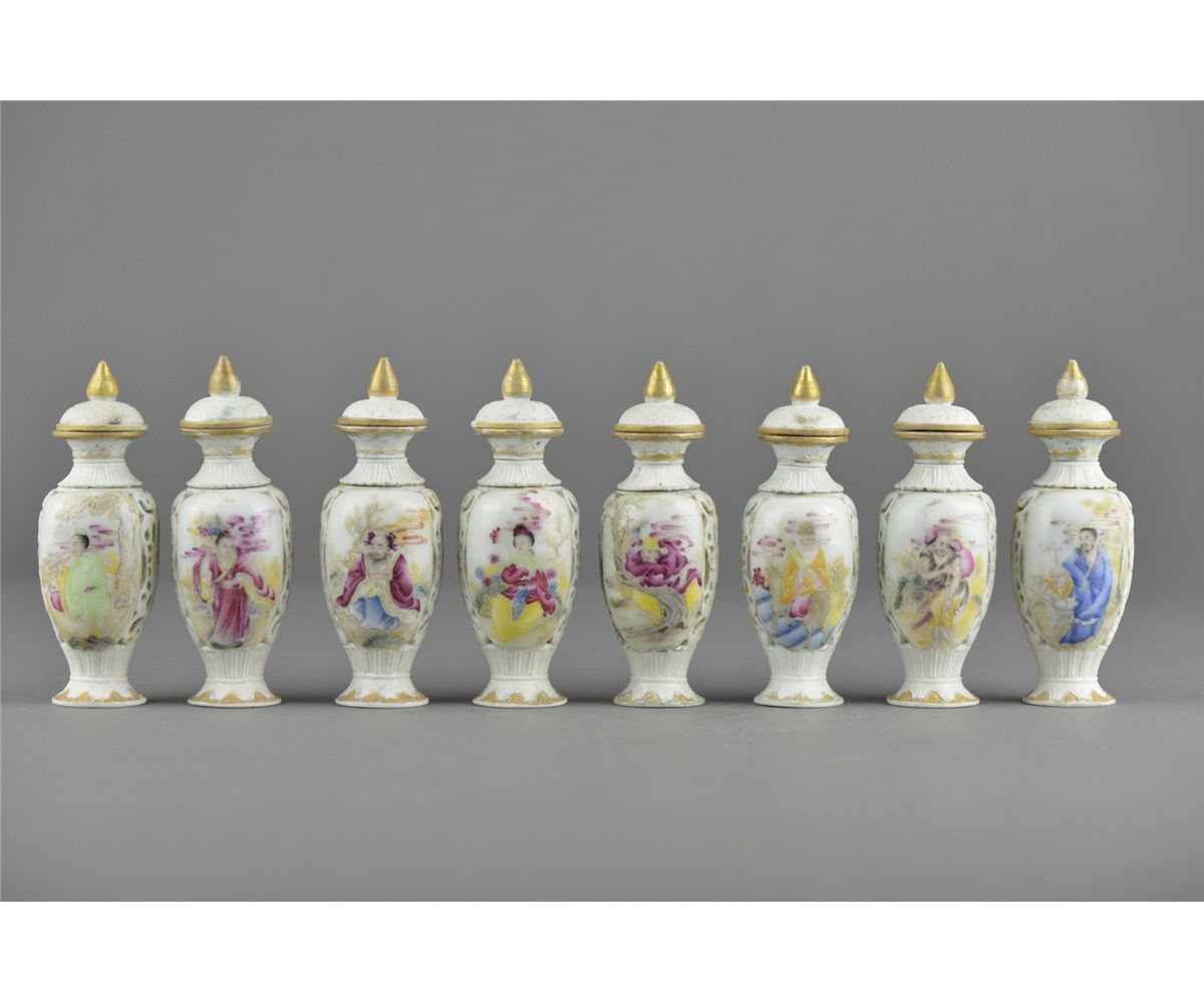 Set of eight Chinese revolving porcelain snuff bottles; openwork ovoid body featuring Eight Daoist Immortals and poem on verso; H: 9.5 cm, D: 3.5 cm