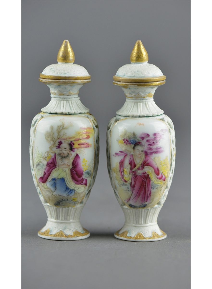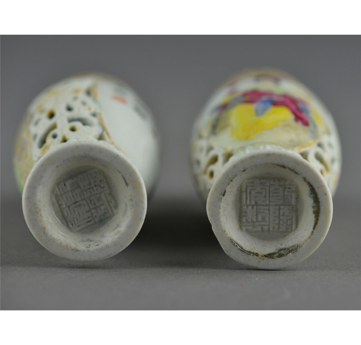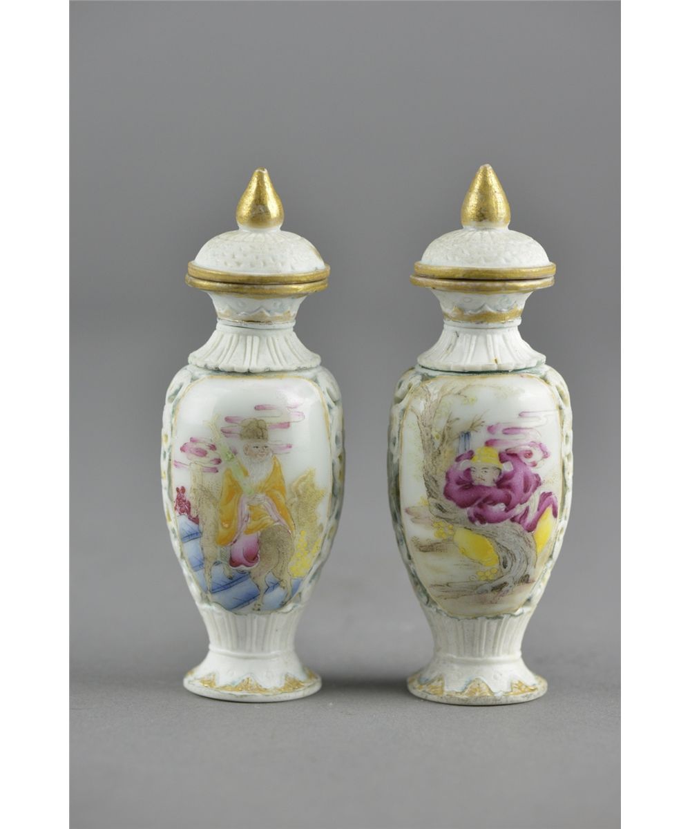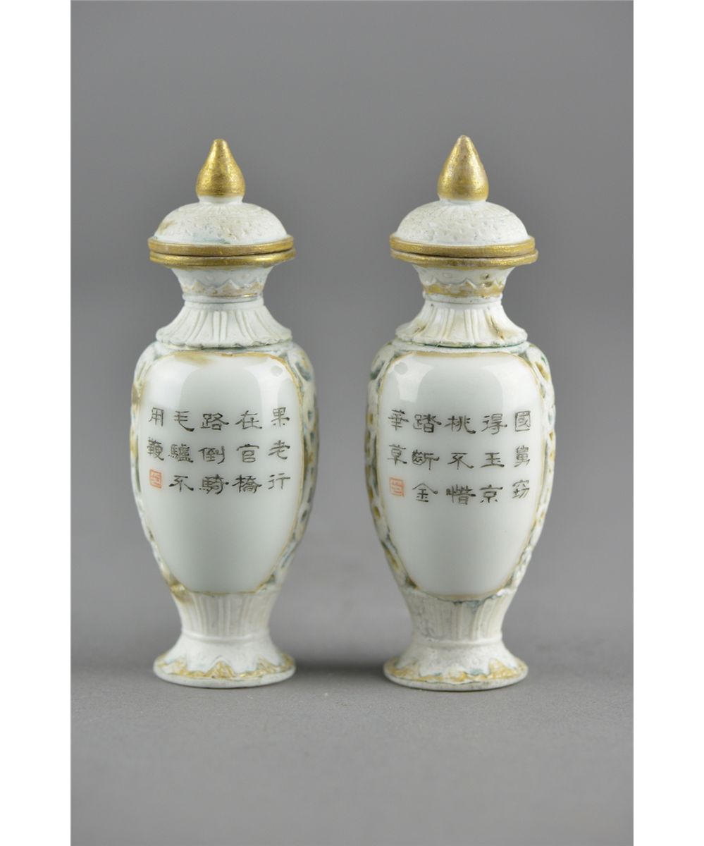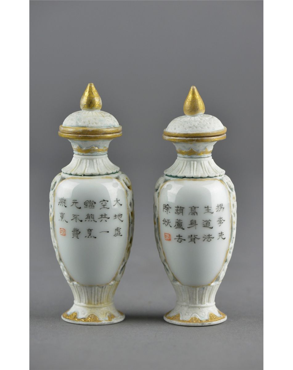 Set of eight Chinese revolving porcelain snuff bottles; openwork ovoid body featuring Eight Daoist Immortals and poem on verso; H: 9.5 cm, D: 3.5 cm