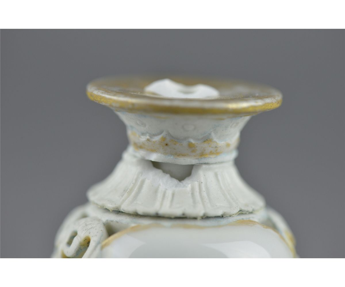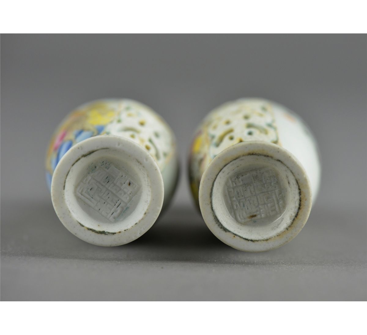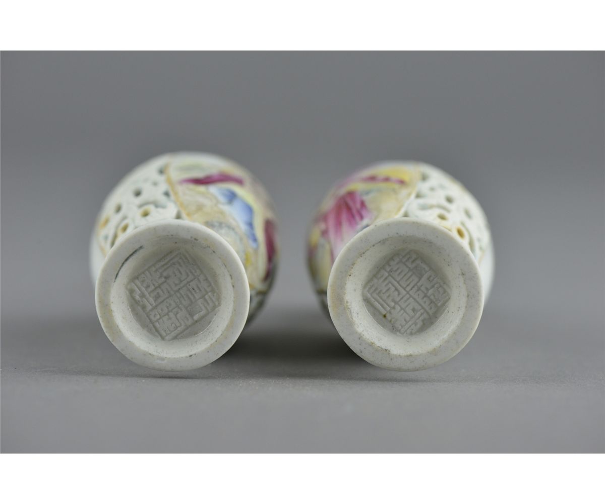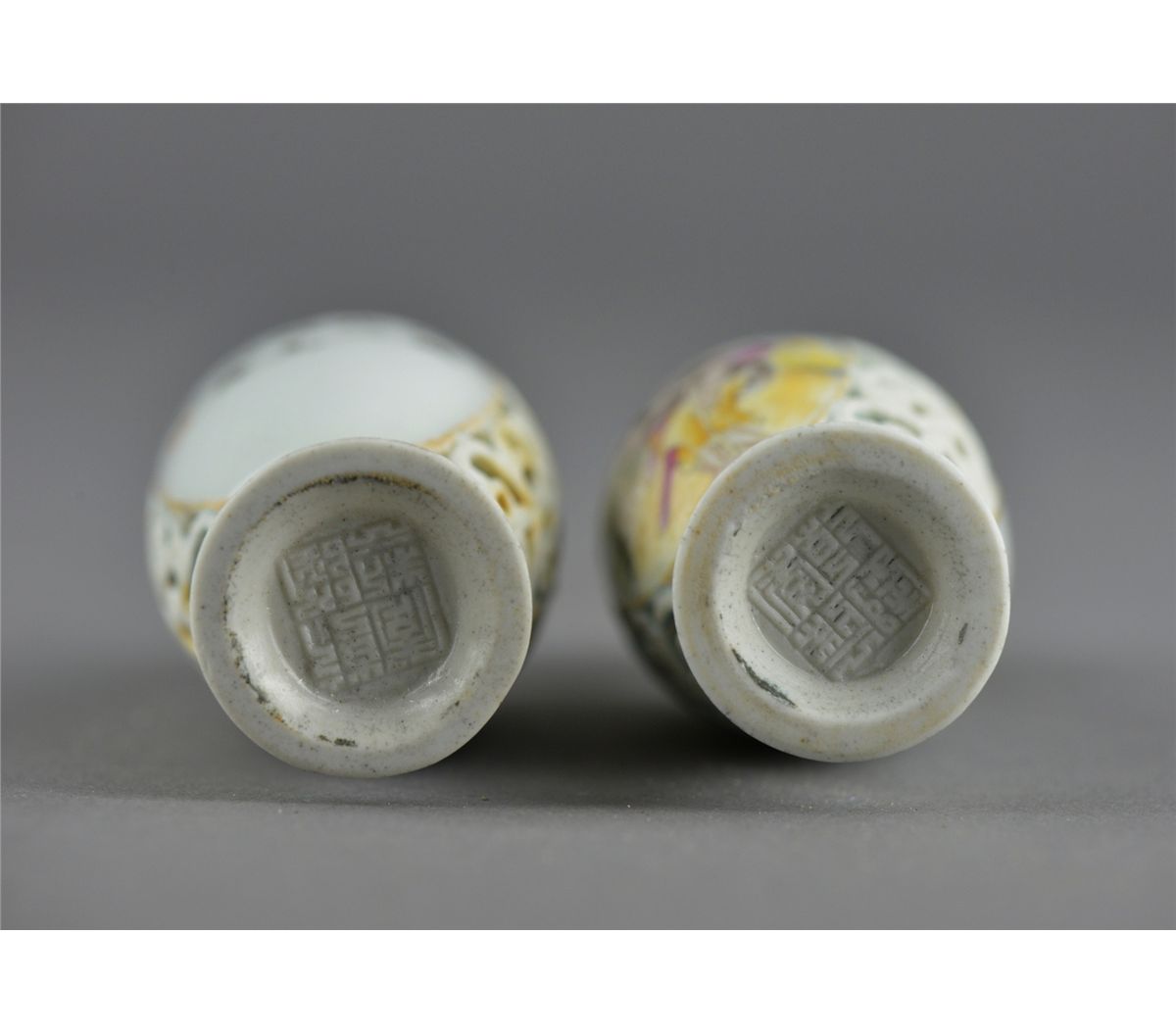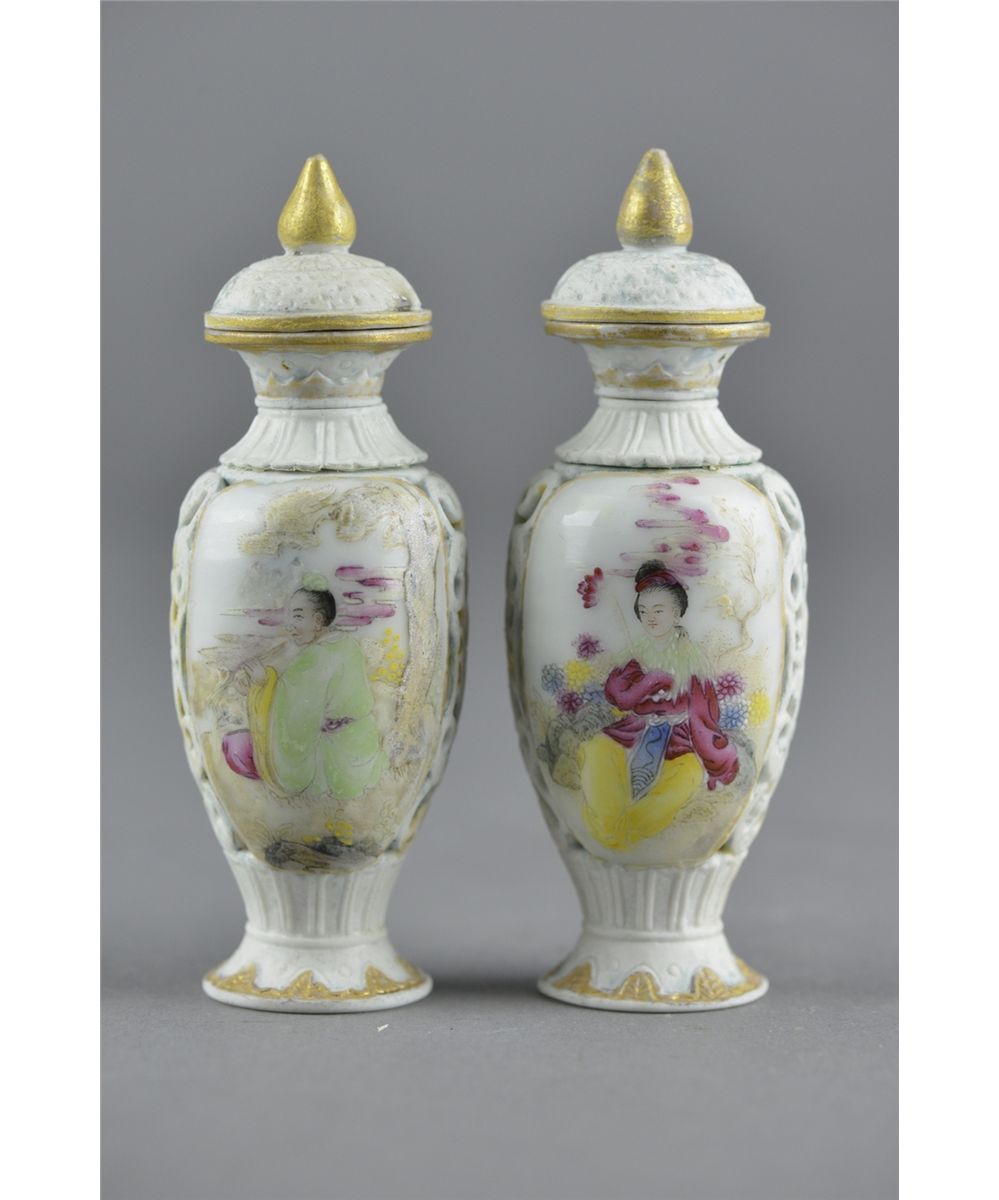 Set of eight Chinese revolving porcelain snuff bottles; openwork ovoid body featuring Eight Daoist Immortals and poem on verso; H: 9.5 cm, D: 3.5 cm