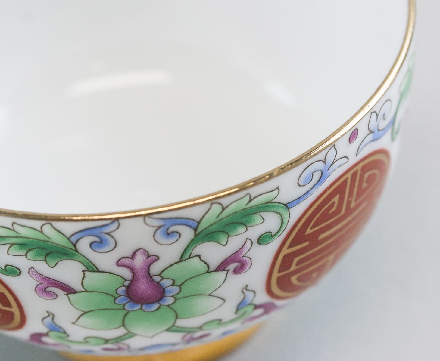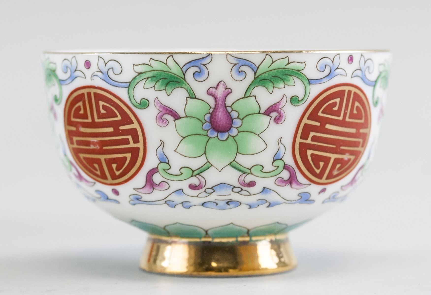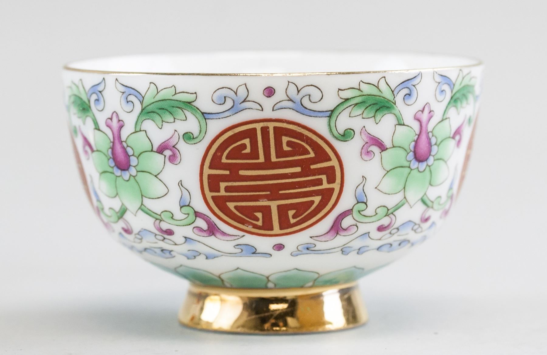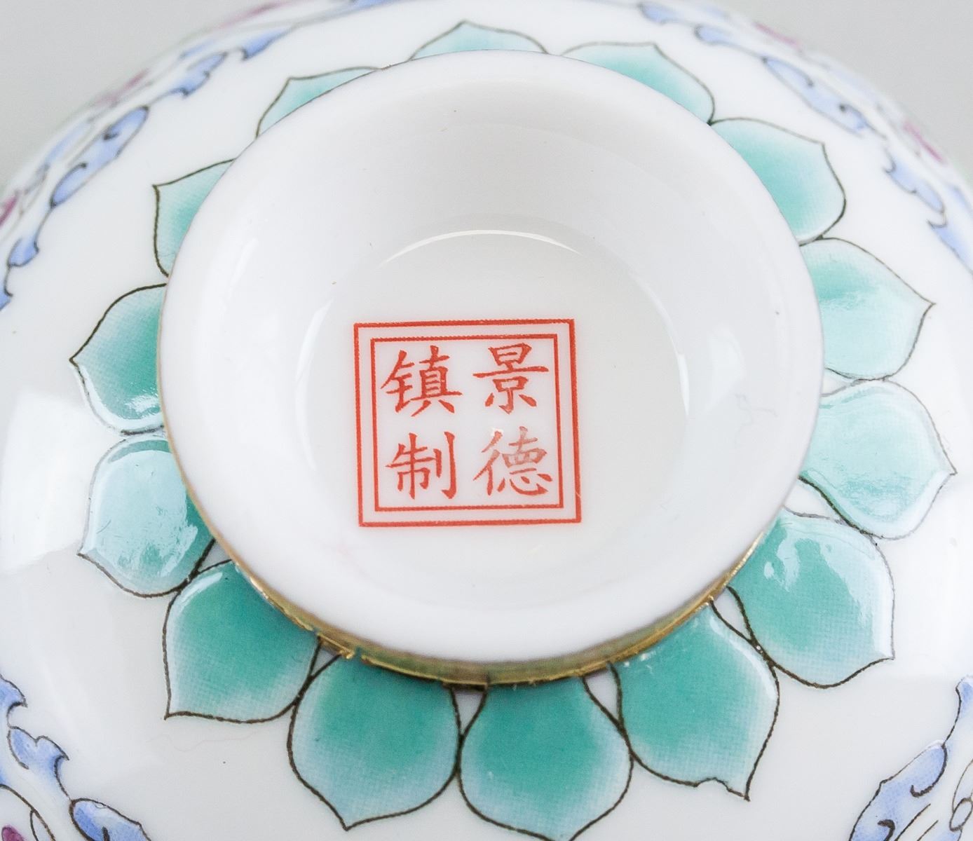 Set of eight (8) Chinese wine cups. Of round opening, round body, resting on small short foot rims. Painted with flowers and vines. Four character Jingdezhen mark on base. 4 x 7 cm, 45 grams each.