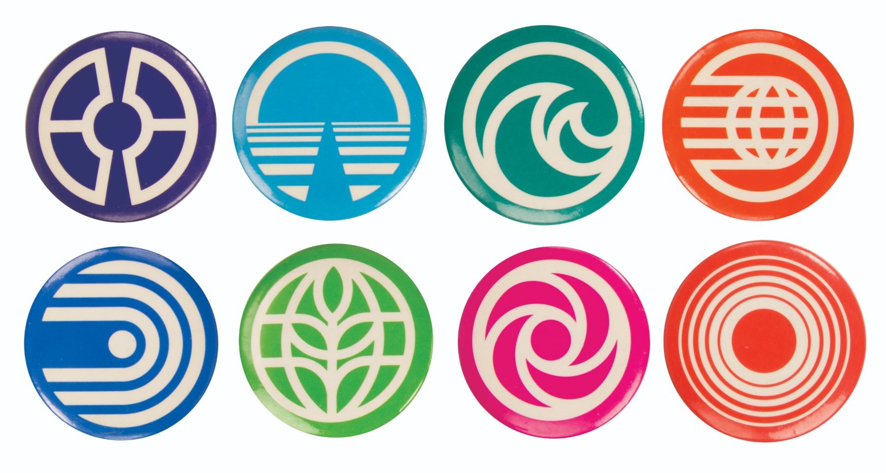 (Epcot, c.1982) An original set of (8) vintage buttons featuring the logos for various pavilions at Epcot. The set includes buttons for Horizons, World of Motion, CommuniCore, Spaceship Earth, Journey Into Imagination, The Living Seas, The Land, and Universe of Energy. This is a great set of these very hard to find buttons, with each measuring 1.75" in diameter. The condition is good overall with some surface wear throughout from use.