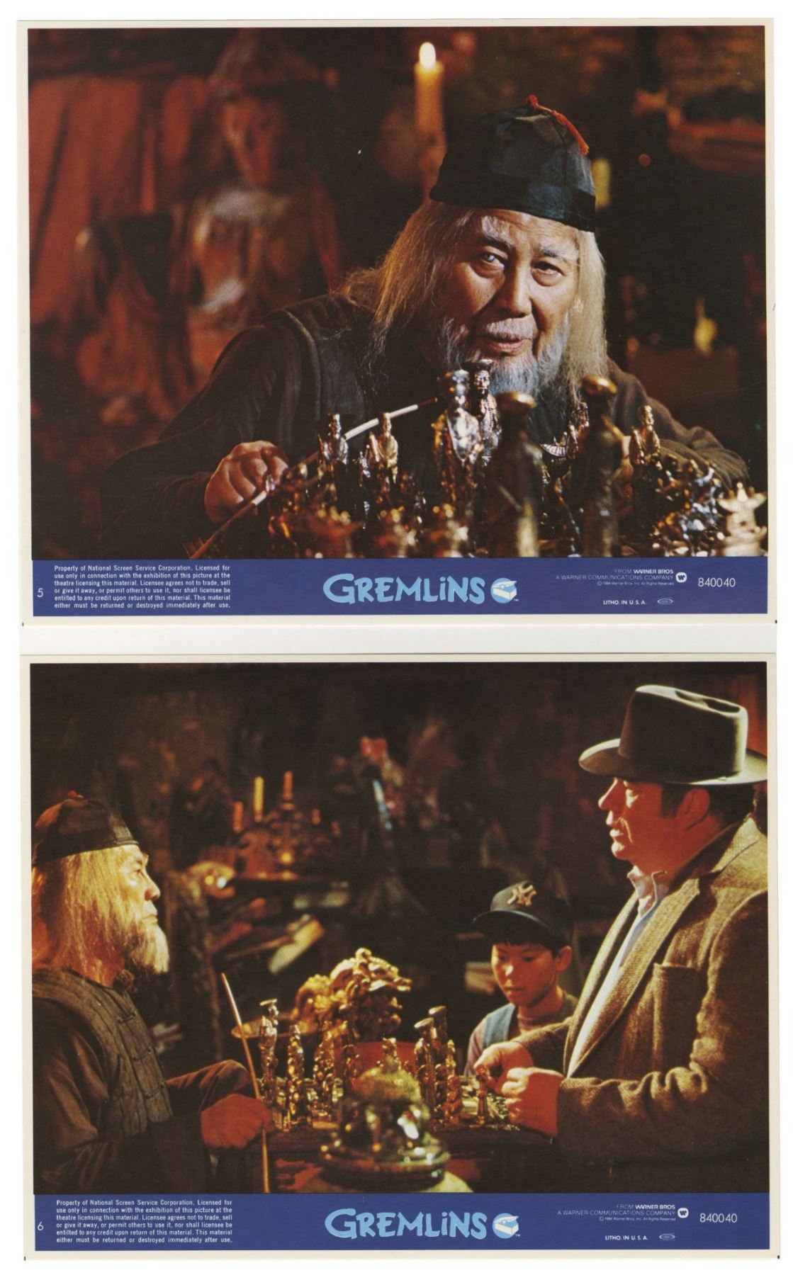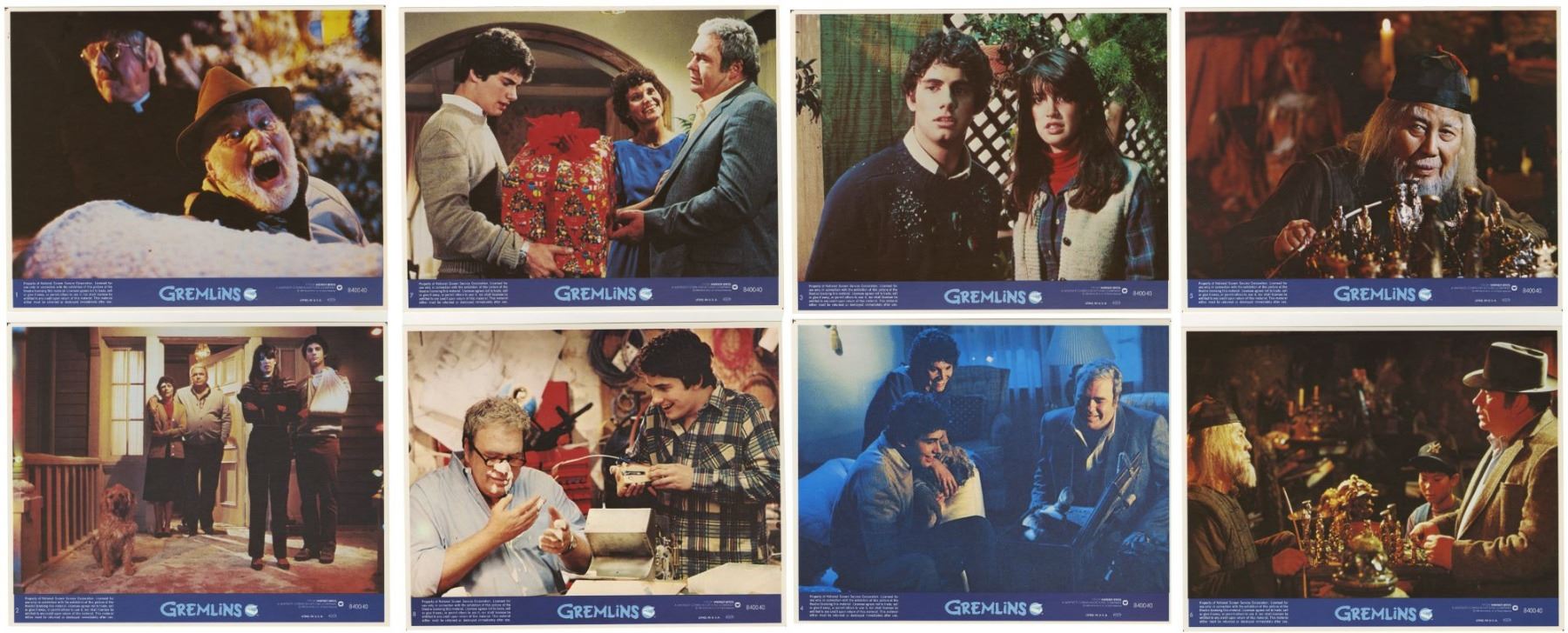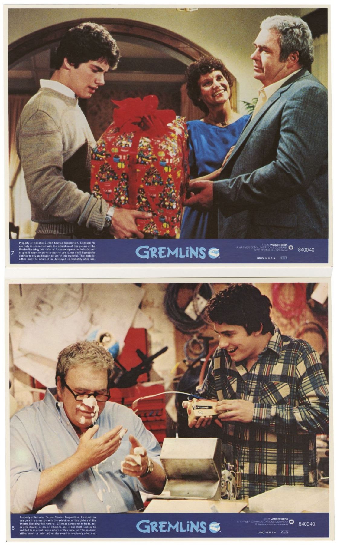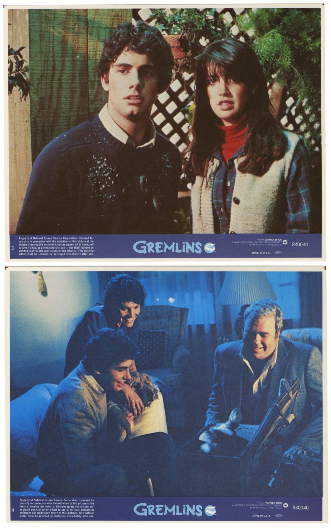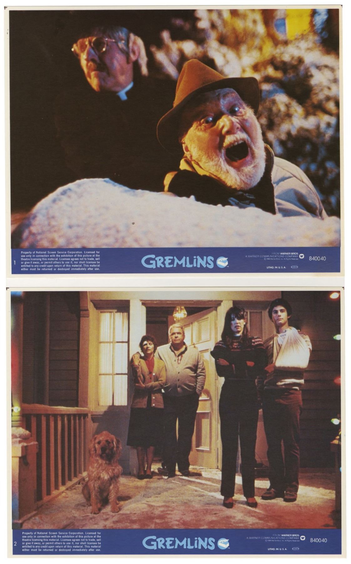 (Warner Bros, 1984) A set of (8) lobby cards featuring imagery from the feature film "Gremlins". Issued by the National Screen Service, the lithographically printed set includes all cards numbers 1-8, and features imagery of important scenes from the film. The cards measure 10"x8" and the condition is very good.