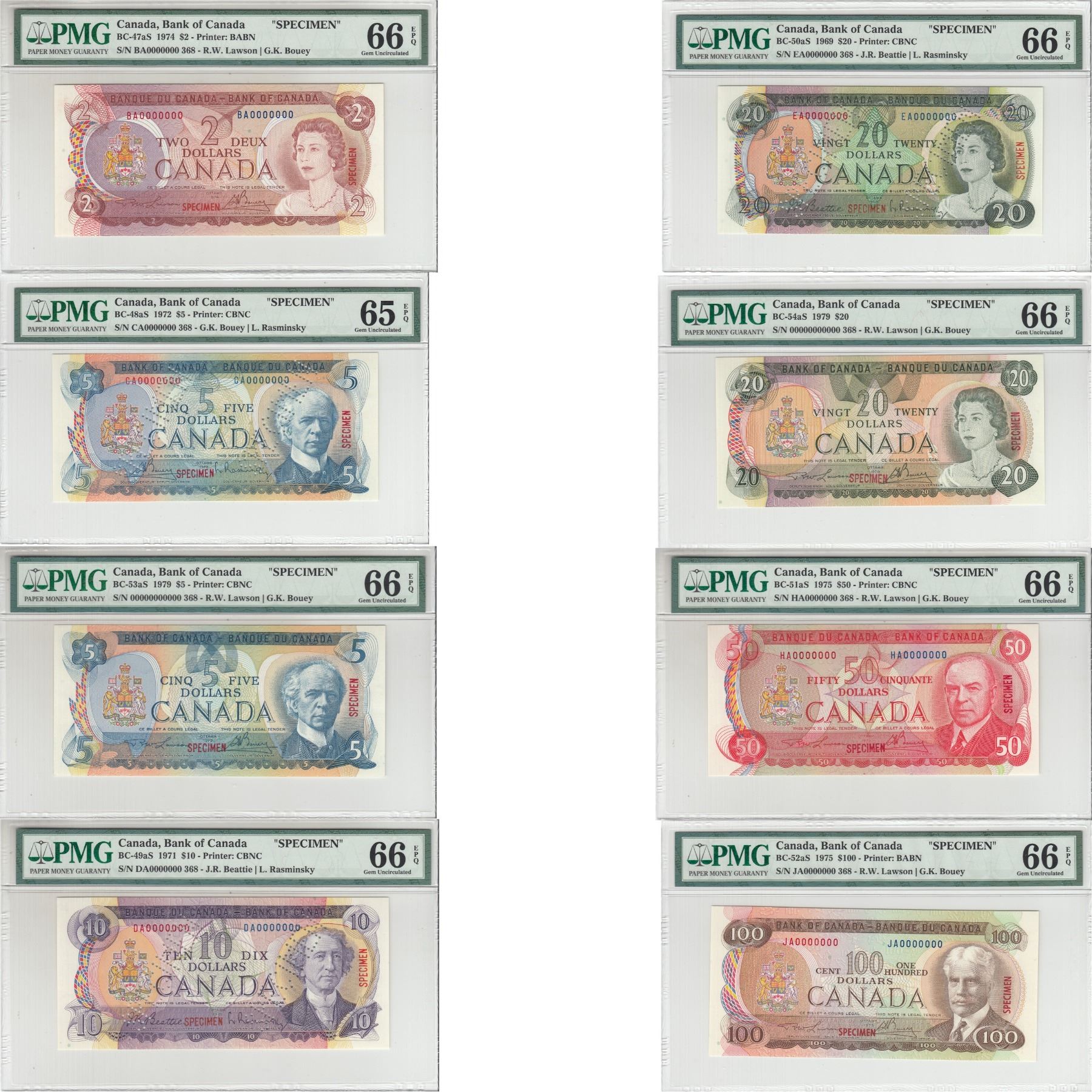Issued in the November 1999 Bank of Canada Sale, Hosted by Moore Numismatic Auctions, Inc. The Bank of Canada sold approximately 620 to 640 notes that were released of each denomination ($2-$100 & both $5's and $20's, Missing the $1 note). The Set includes: 1974 $2, BC-47aS Lawson-Bouey BA Prefix (Gem UNC-66 EPQ), 1972 $5 BC-48aS Bouey-Rasminsky CA Prefix (Gem UNC-65 EPQ), 1971 $10 BC-49aS, Beattie-Rasminsky DA Prefix (Gem UNC-66 EPQ), 1969 $20 BC-50aS, Beattie-Rasminsky EA Prefix (Gem UNC-66 EPQ!), 1975 $50 BC-51aS Lawson-Bouey HA Prefix (Gem UNC-66 EPQ), 1975 $100 BC-52aS, Lawson-Bouey JA Prefix (Gem UNC-66 EPQ), 1979 $5 BC-53aS, Lawson-Bouey '000' Prefix (Gem UNC-66 EPQ), & 1979 $20 BC-54aS, Lawson-Bouey '000' Prefix (Gem Unc-66 EPQ). A Premium Graded Set makes for a great Investment opportunity for a set that is seldom offered for sale.