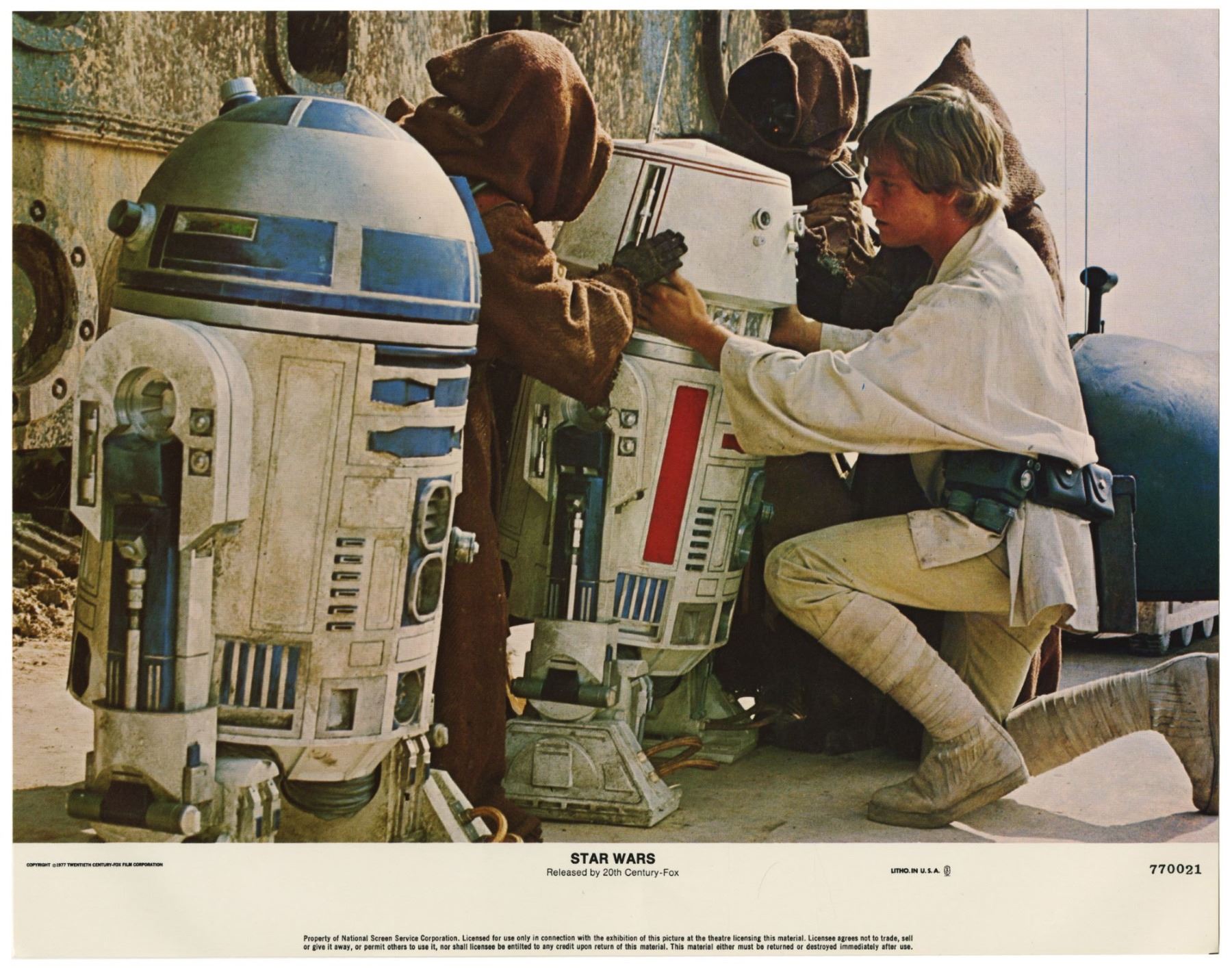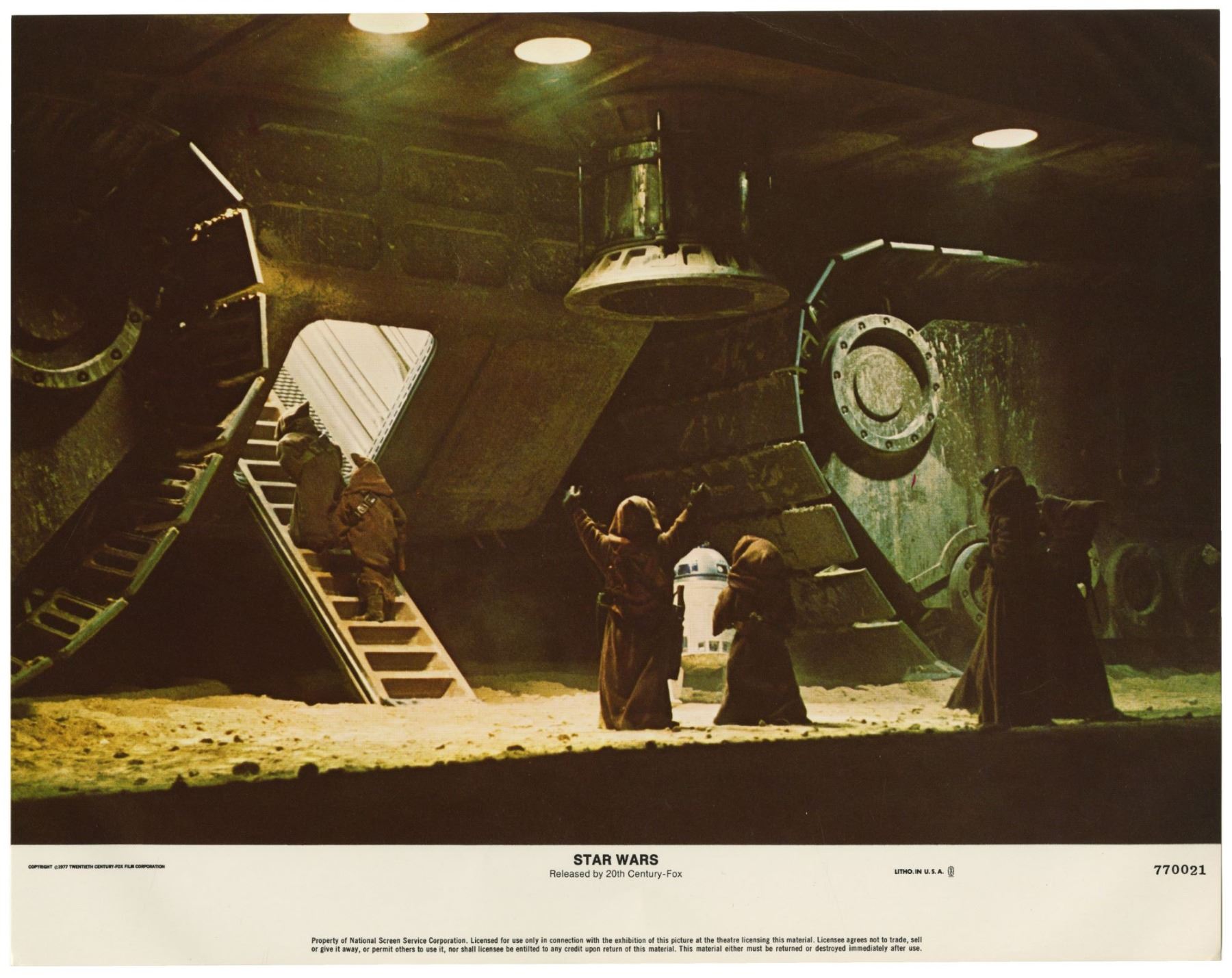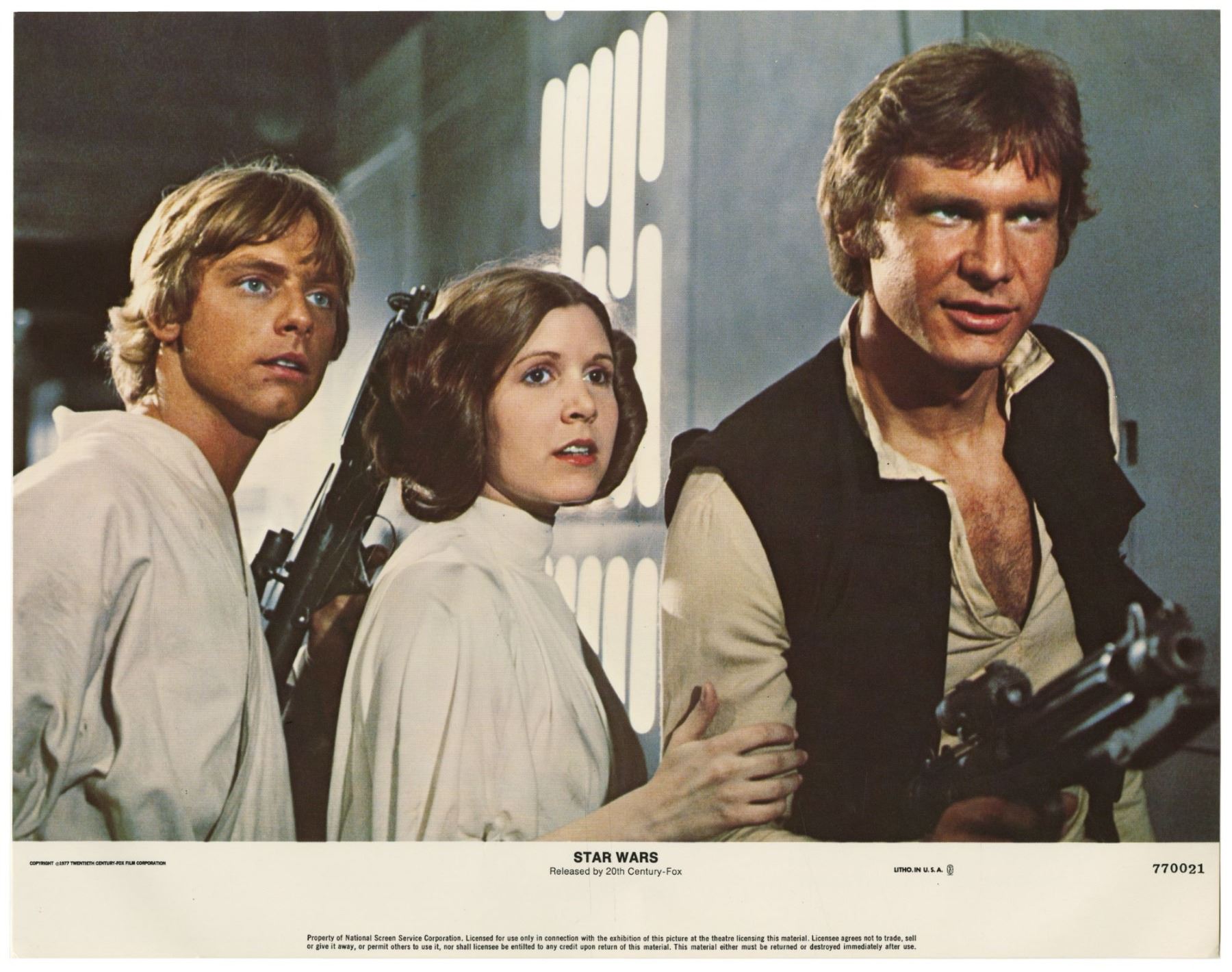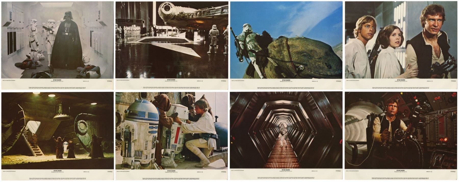 (20th Century Fox, 1977) A complete set of (8) lobby cards created for the original theatrical release of "Star Wars". These lobby cards, created by the National Screen Service, were lithographically printed and depict imagery from the film. Each lobby cards measures 11"x14" and all are in good condition with some edge-wear from storage.
