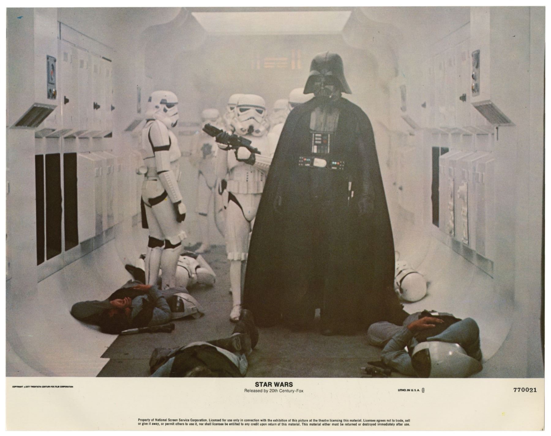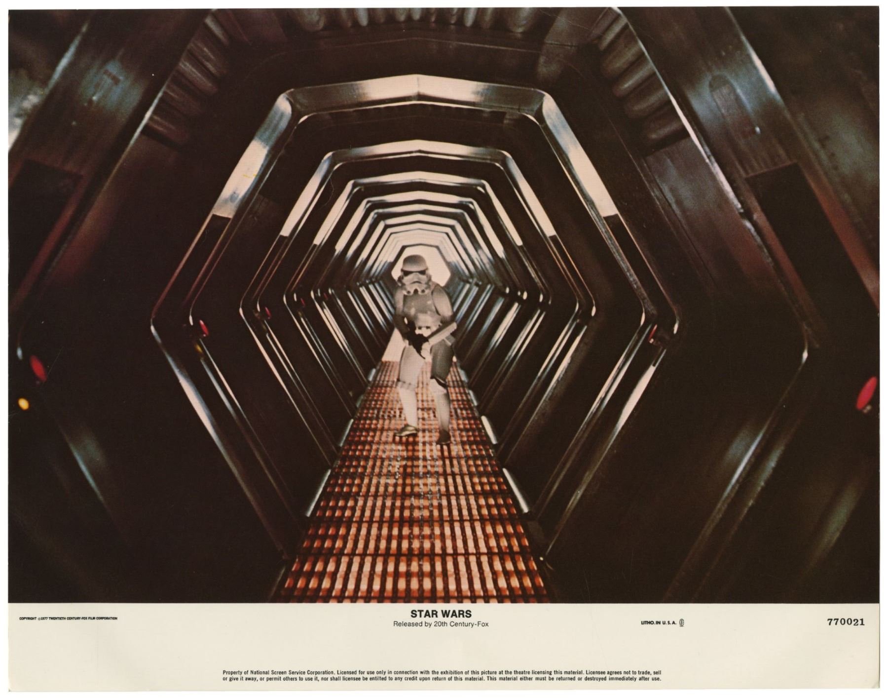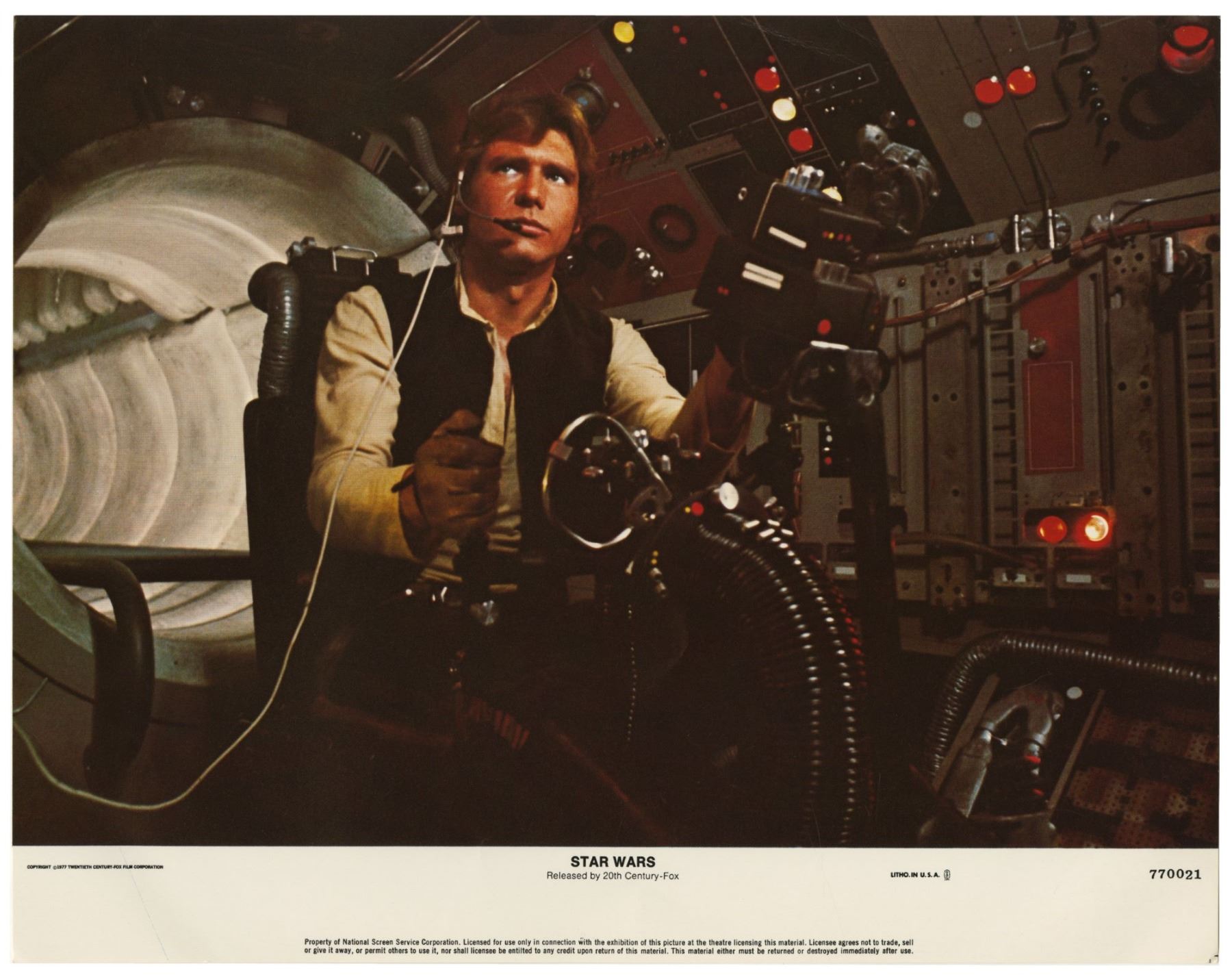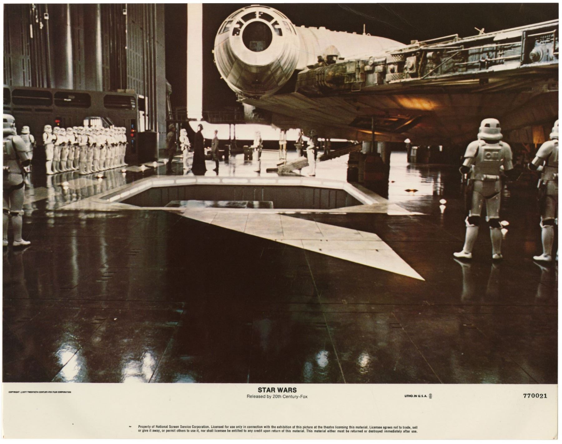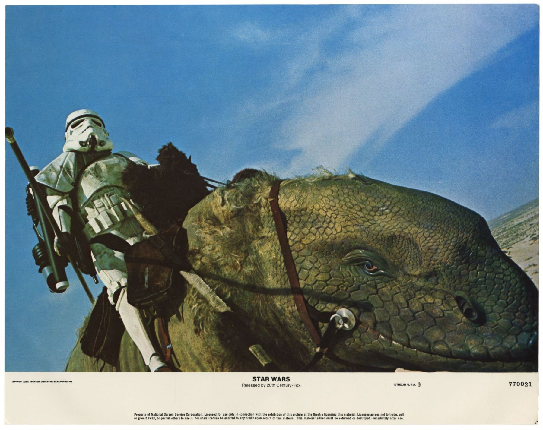 (20th Century Fox, 1977) A complete set of (8) lobby cards created for the original theatrical release of "Star Wars". These lobby cards, created by the National Screen Service, were lithographically printed and depict imagery from the film. Each lobby cards measures 11"x14" and all are in good condition with some edge-wear from storage.