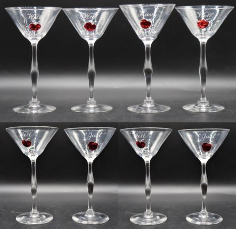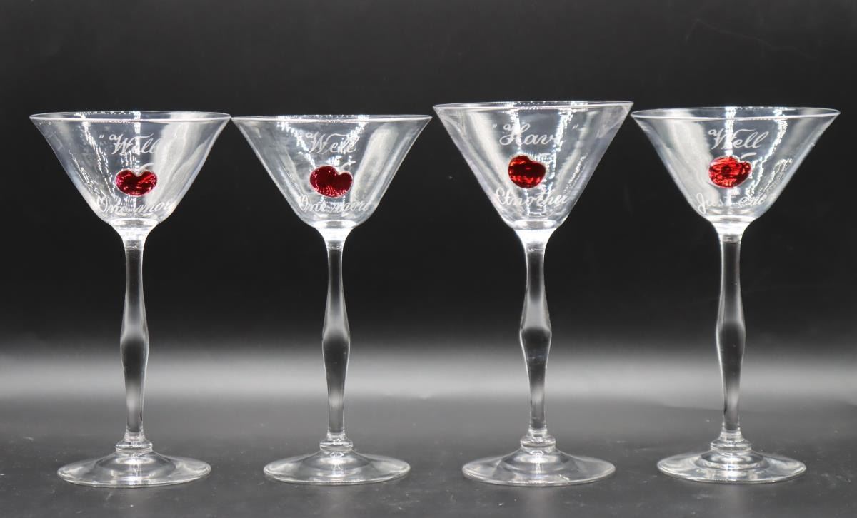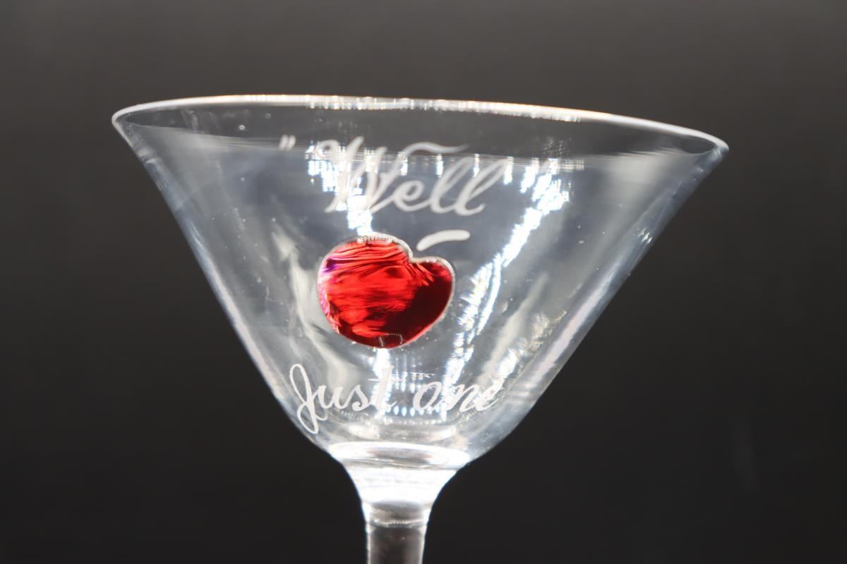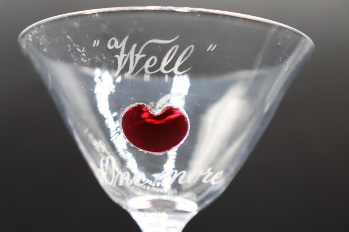 Set of (8) Steuben Cocktail Glasses with Red Cherry. Includes "Well Just One", "Have Another" and "Just One"