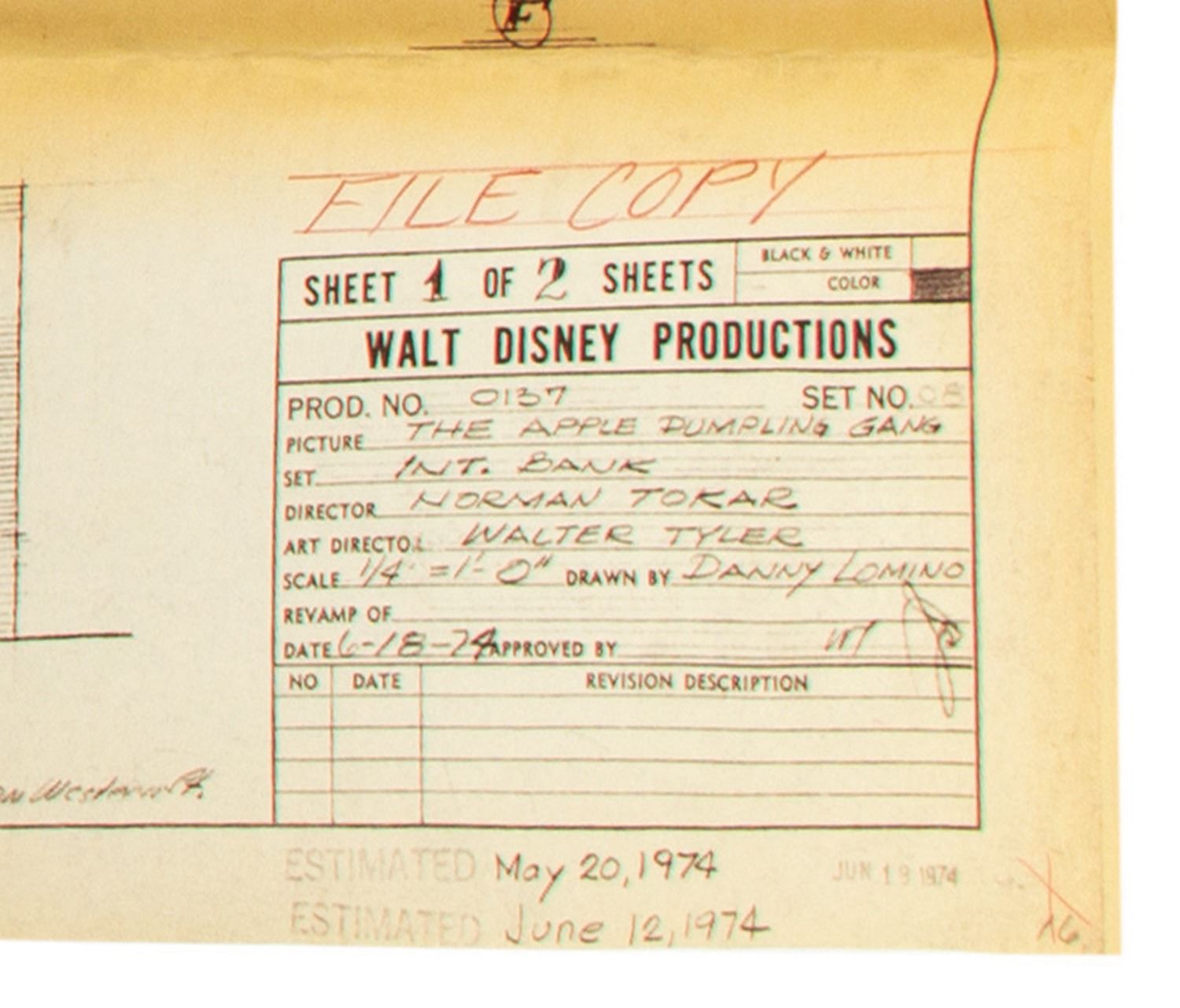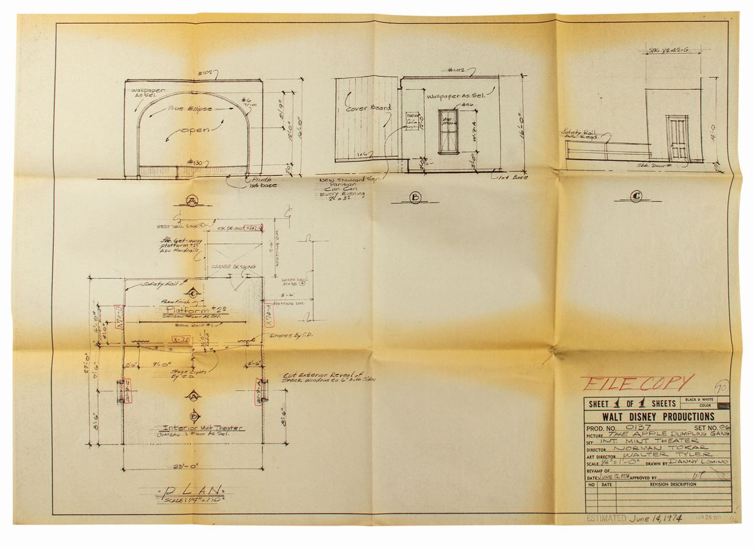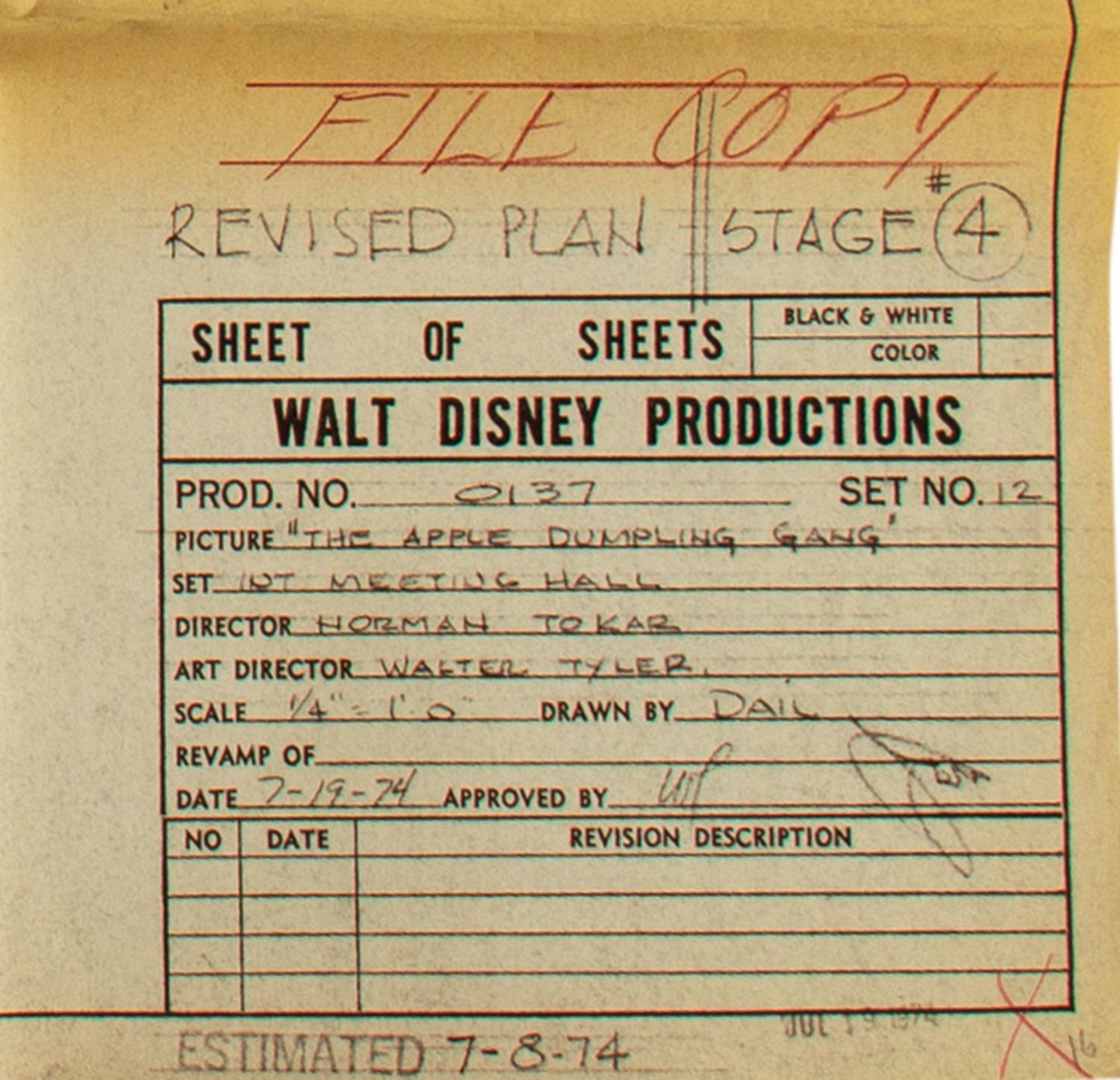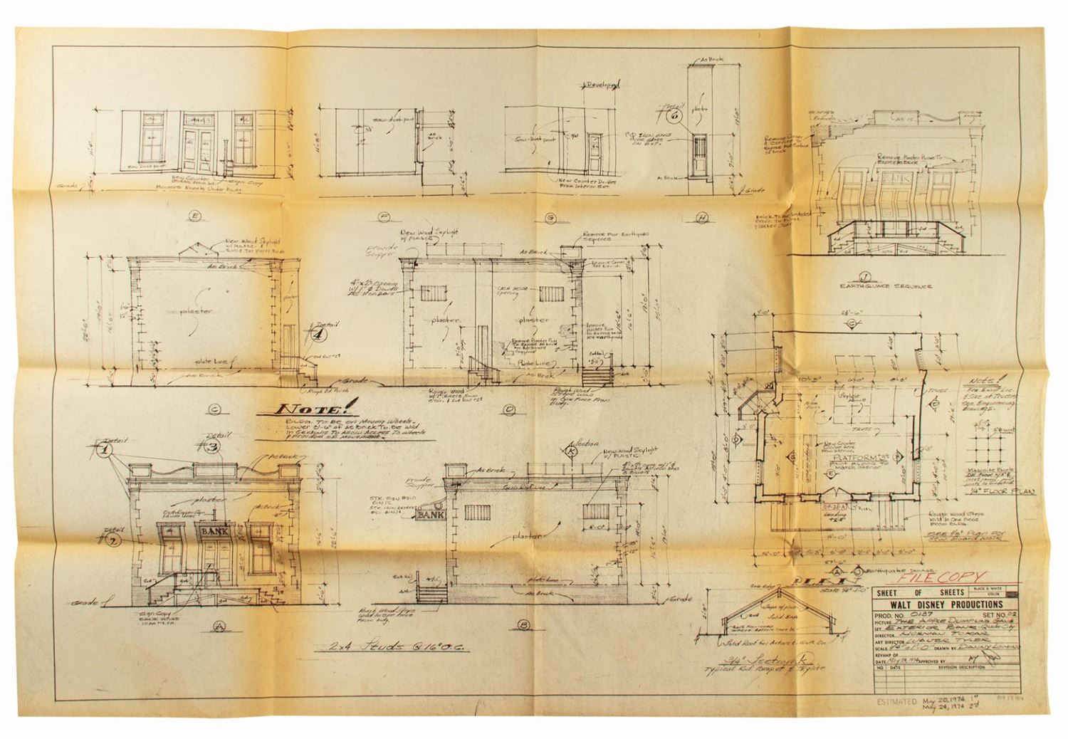 (Disney, 1975) A set of (8) blue line plans and elevations for interior and exterior sets for the film The Apple Dumpling Gang. All prints are marked "File Copy" in red colored pencil, and the majority are additionally embellished with hand-written annotations and diagrams in pencil, red colored pencil, or blue ink. Subjects include Wintle's Shack, Meeting Hall, Mint Theatre, Firehouse, Mine Shaft, Bank - Quake City (Int. & Ext.), and Hotel Dining room. The blue lines are dated between May and July of 1974 and bear the printed approval signature of art director Walter Tyler, and provide an interesting look behind-the-scenes of the popular comedy Western. Of the set, three measure 21"x30" and five measure 29.5"x40". The folded blue lines range in condition from good to very good with all exhibiting yellowing from age, some faint soiling from production use, corner creases, and one has paper tape repair to verso.