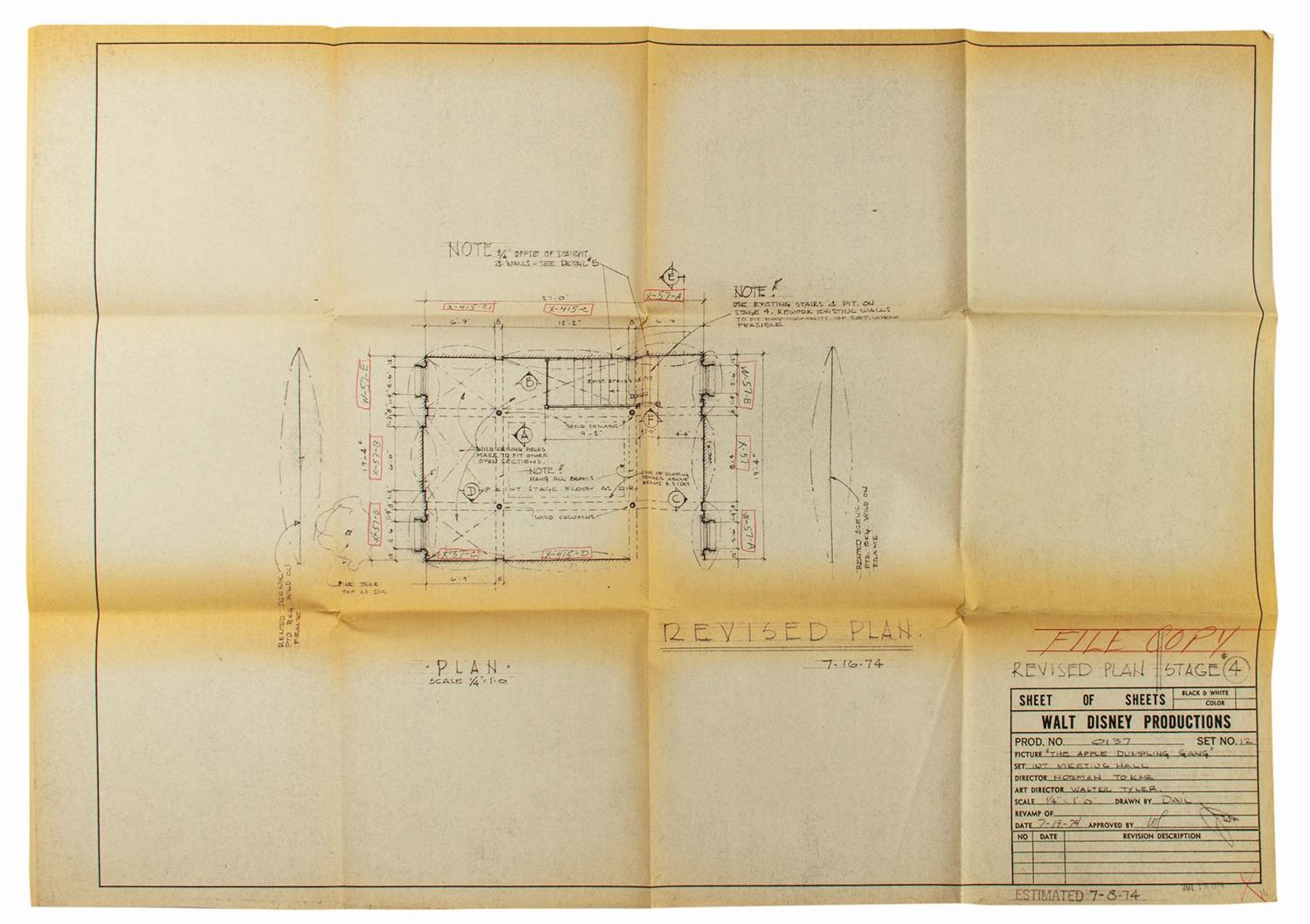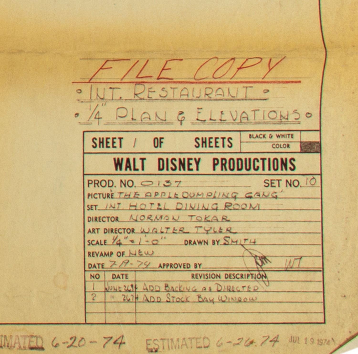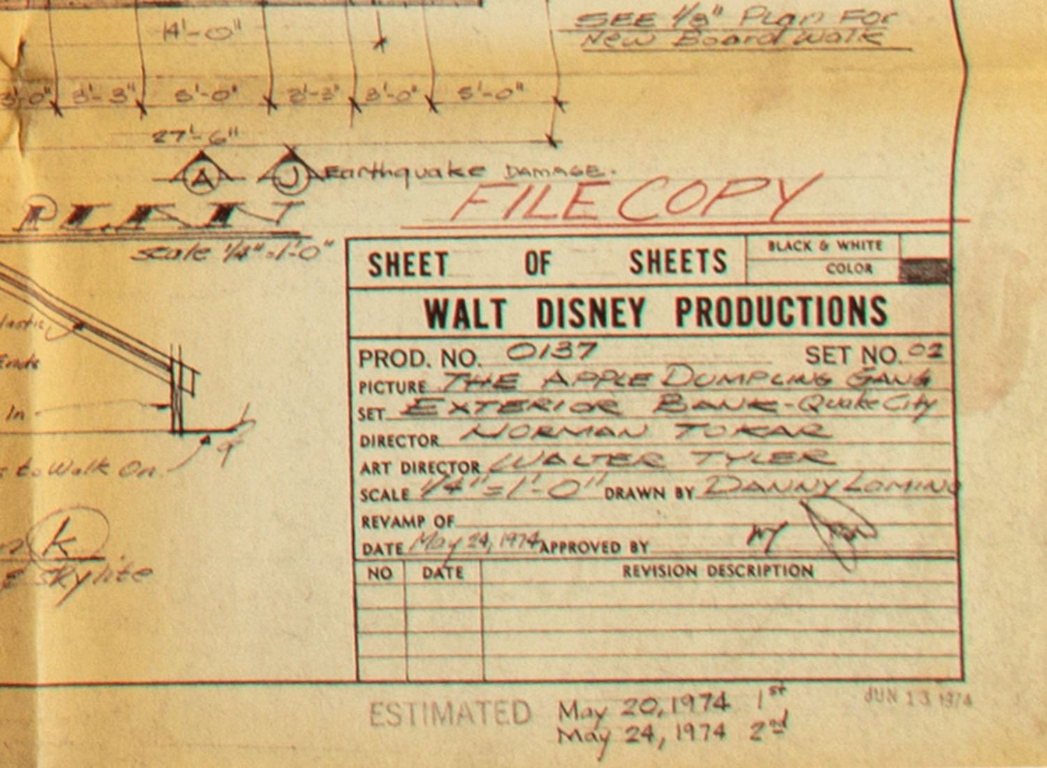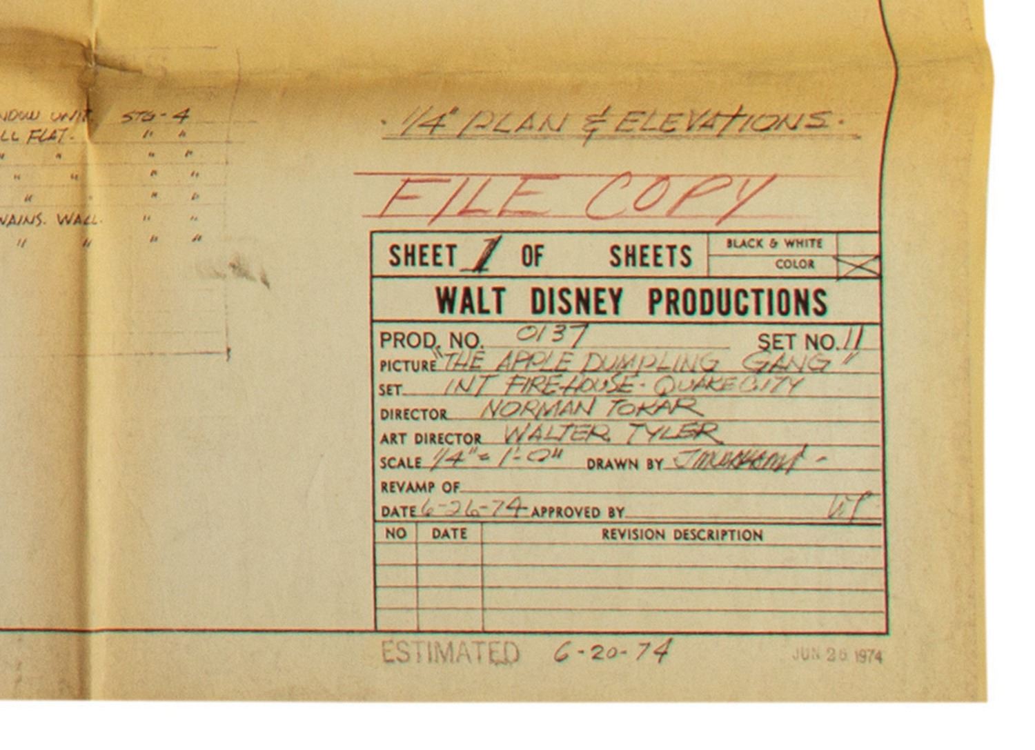 (Disney, 1975) A set of (8) blue line plans and elevations for interior and exterior sets for the film The Apple Dumpling Gang. All prints are marked "File Copy" in red colored pencil, and the majority are additionally embellished with hand-written annotations and diagrams in pencil, red colored pencil, or blue ink. Subjects include Wintle's Shack, Meeting Hall, Mint Theatre, Firehouse, Mine Shaft, Bank - Quake City (Int. & Ext.), and Hotel Dining room. The blue lines are dated between May and July of 1974 and bear the printed approval signature of art director Walter Tyler, and provide an interesting look behind-the-scenes of the popular comedy Western. Of the set, three measure 21"x30" and five measure 29.5"x40". The folded blue lines range in condition from good to very good with all exhibiting yellowing from age, some faint soiling from production use, corner creases, and one has paper tape repair to verso.
