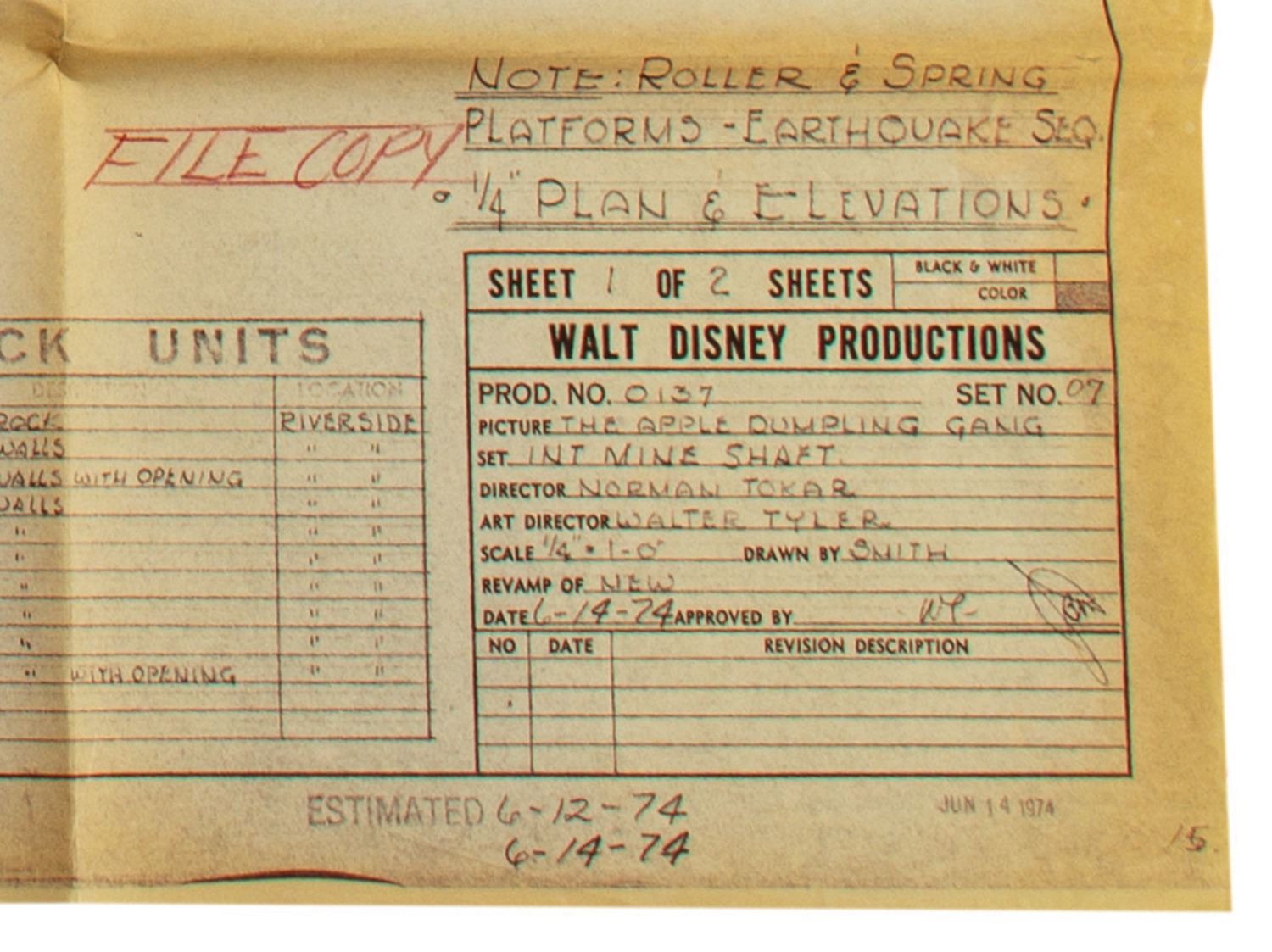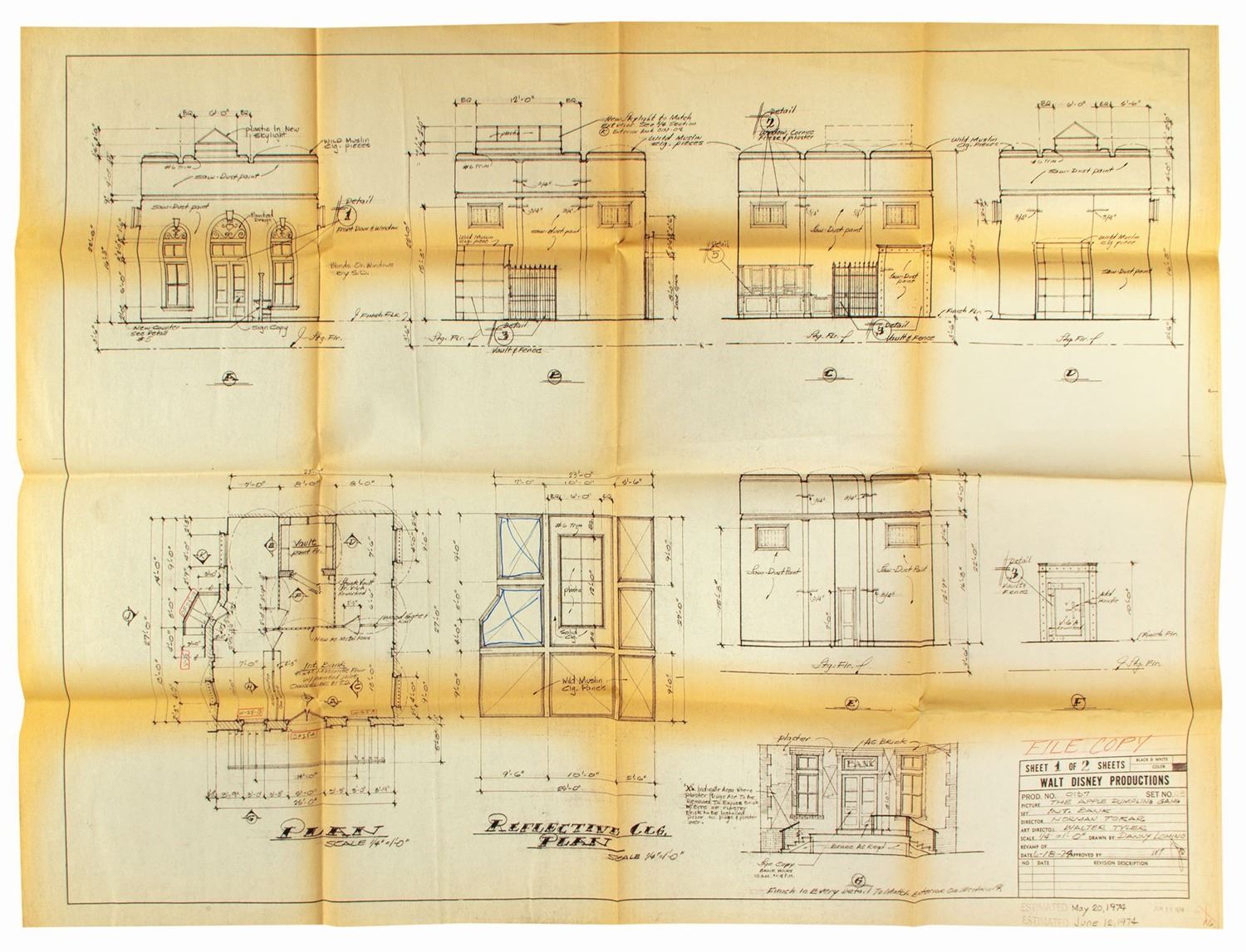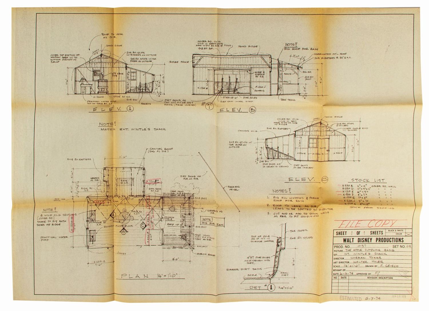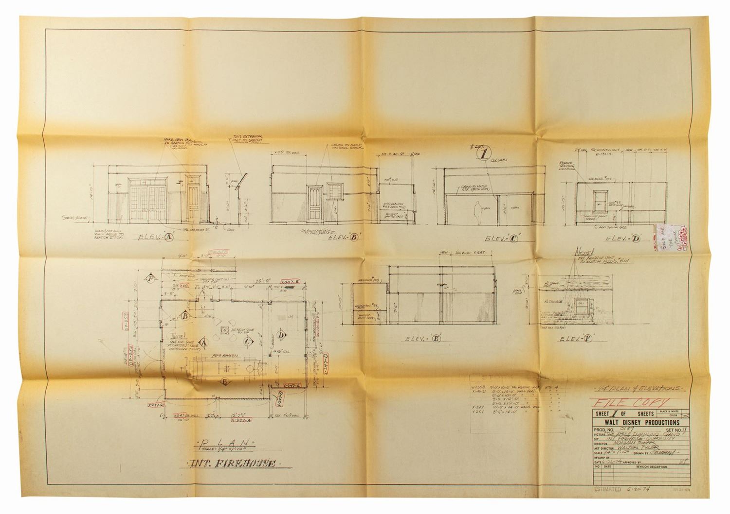 (Disney, 1975) A set of (8) blue line plans and elevations for interior and exterior sets for the film The Apple Dumpling Gang. All prints are marked "File Copy" in red colored pencil, and the majority are additionally embellished with hand-written annotations and diagrams in pencil, red colored pencil, or blue ink. Subjects include Wintle's Shack, Meeting Hall, Mint Theatre, Firehouse, Mine Shaft, Bank - Quake City (Int. & Ext.), and Hotel Dining room. The blue lines are dated between May and July of 1974 and bear the printed approval signature of art director Walter Tyler, and provide an interesting look behind-the-scenes of the popular comedy Western. Of the set, three measure 21"x30" and five measure 29.5"x40". The folded blue lines range in condition from good to very good with all exhibiting yellowing from age, some faint soiling from production use, corner creases, and one has paper tape repair to verso.