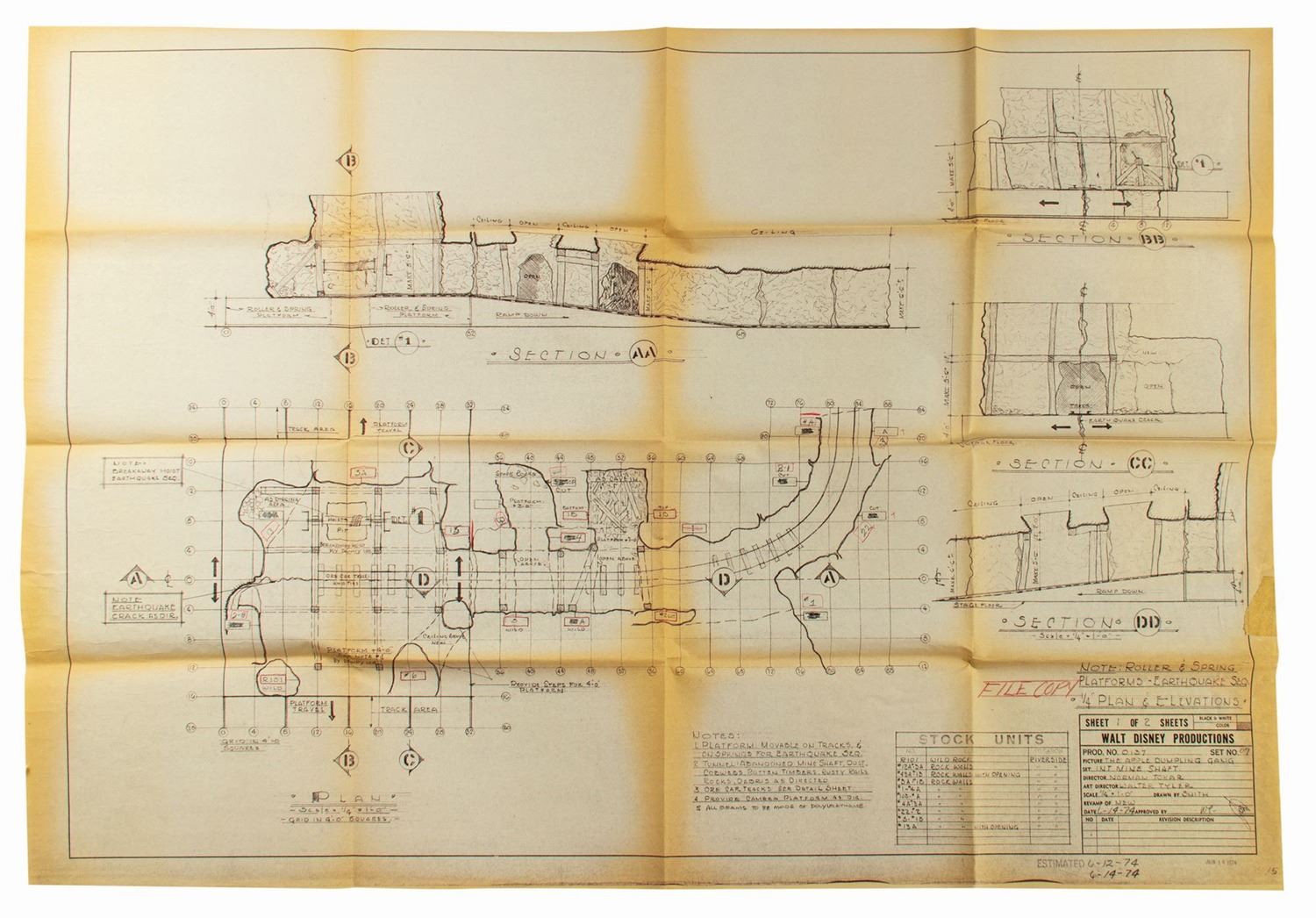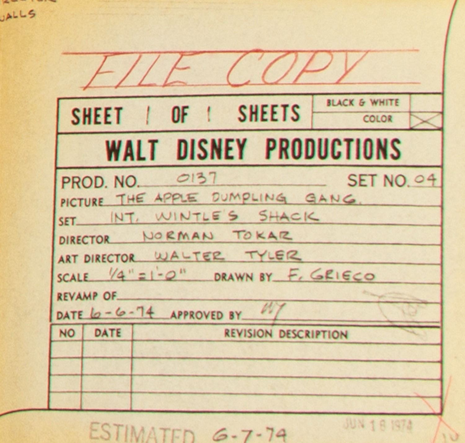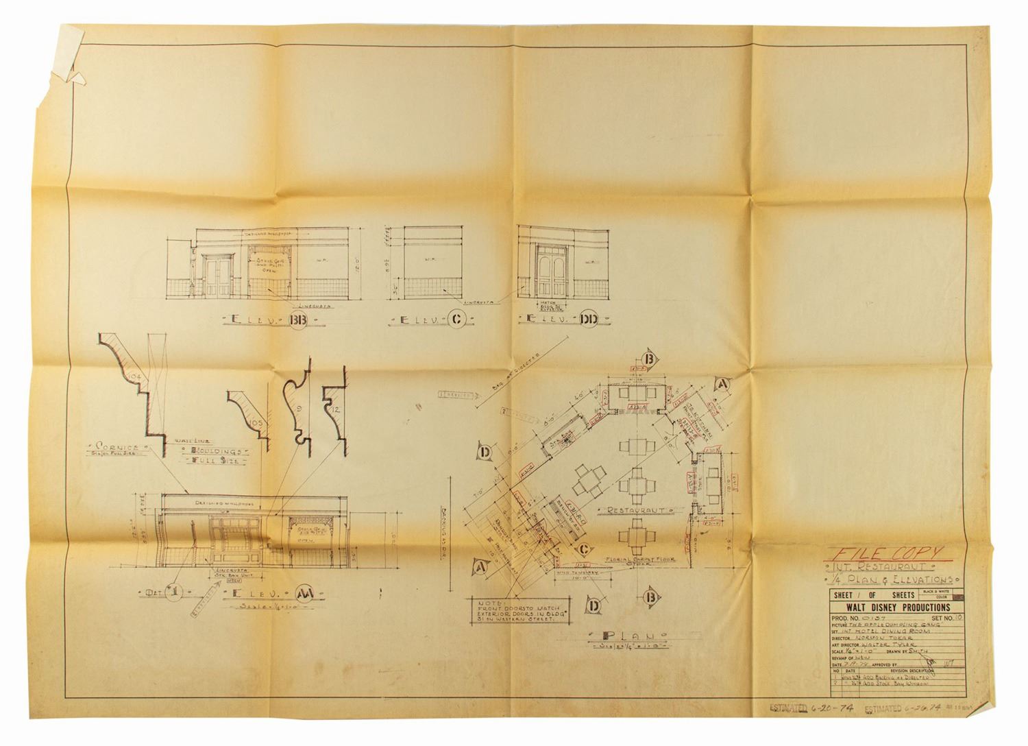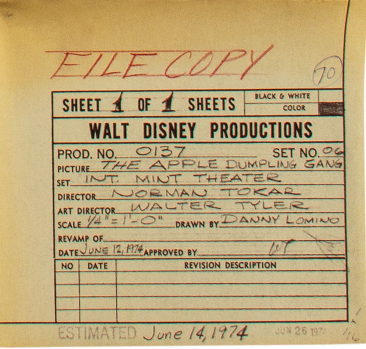 (Disney, 1975) A set of (8) blue line plans and elevations for interior and exterior sets for the film The Apple Dumpling Gang. All prints are marked "File Copy" in red colored pencil, and the majority are additionally embellished with hand-written annotations and diagrams in pencil, red colored pencil, or blue ink. Subjects include Wintle's Shack, Meeting Hall, Mint Theatre, Firehouse, Mine Shaft, Bank - Quake City (Int. & Ext.), and Hotel Dining room. The blue lines are dated between May and July of 1974 and bear the printed approval signature of art director Walter Tyler, and provide an interesting look behind-the-scenes of the popular comedy Western. Of the set, three measure 21"x30" and five measure 29.5"x40". The folded blue lines range in condition from good to very good with all exhibiting yellowing from age, some faint soiling from production use, corner creases, and one has paper tape repair to verso.
