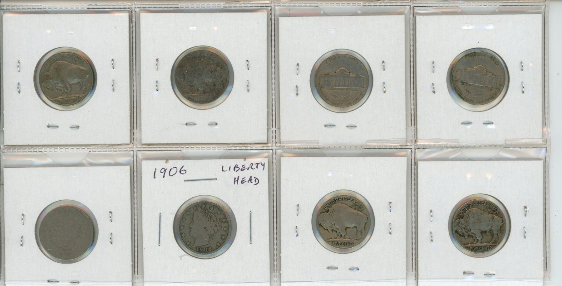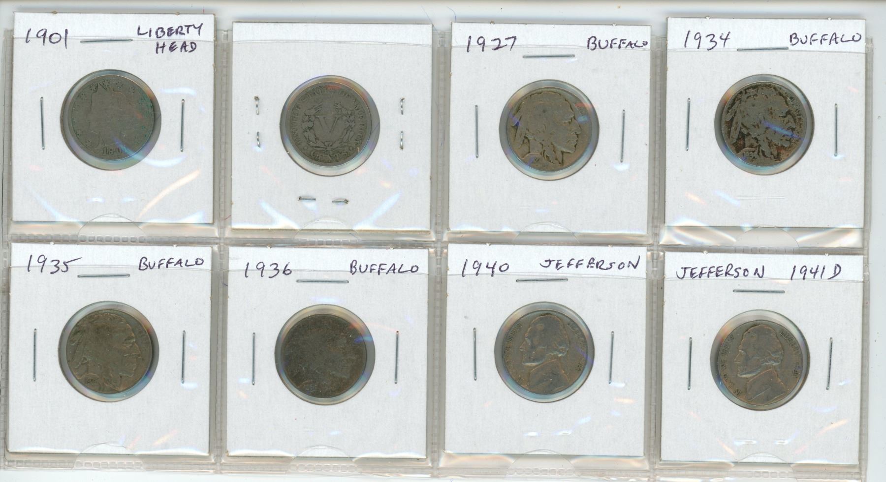 Set of 8 U.S Liberty Head, Buffalo and Jefferson Nickels Dating From 1901-1941D