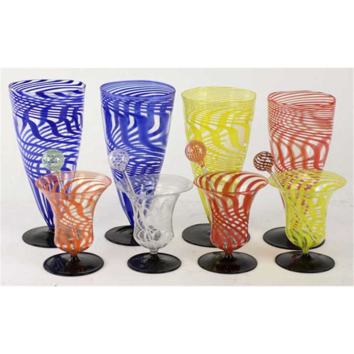 Set of 8 fine art glasses super eggshell thin showing excellent quality and hand blown, includes 4 tall glasses, 4 cordials size and 4 matching hand blown stir sticks.