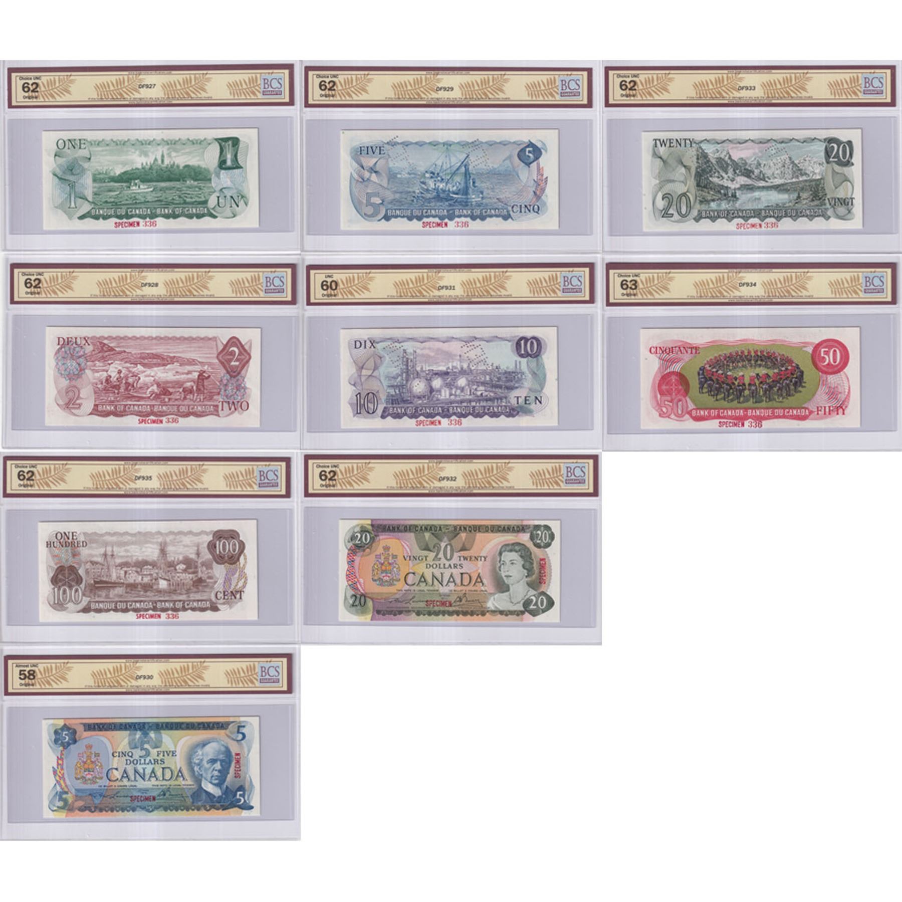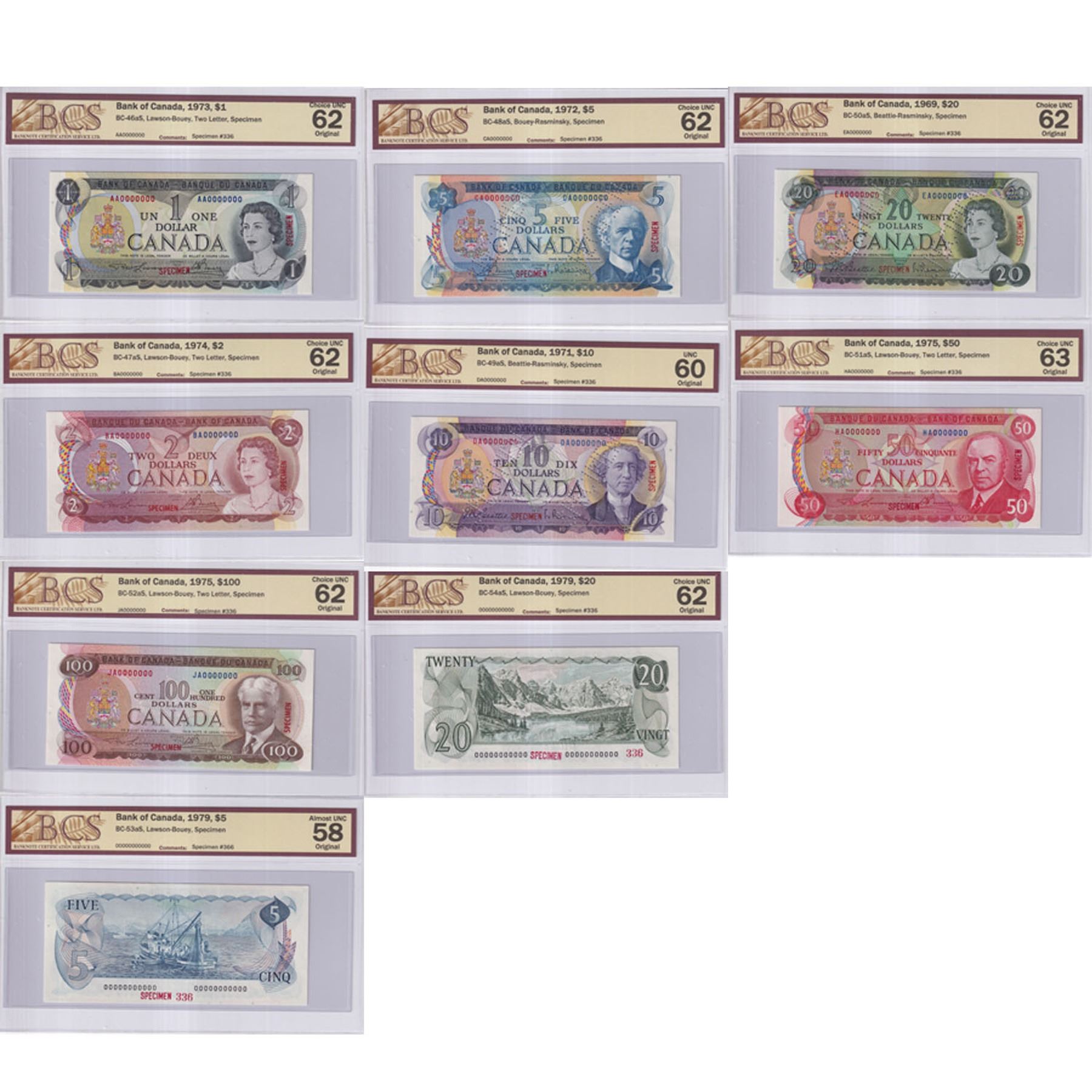 Issued in the November 1999 Bank of Canada Sale, Hosted by Moore Numismatic Auctions, Inc. The Bank of Canada sold approximately 620 to 640 notes that were released of each denomination ($1-$100 & both $5's and $20's). The Set includes: 1973 $1, BC-46aS Lawson-Bouey AA prefix (CUNC-62), 1974 $2, BC47aS Lawson-Bouey BA Prefix (CUNC-62), 1972 $5 BC-48aS Bouey-Rasminsky CA Prefix (CUNC-62), 1971 $10 BC-49aS, Beattie-Rasminsky DA Prefix (CUNC-60), 1969 $20 BC-50aS, Beattie-Rasminsky EA Prefix (CUNC-62), 1975 $50 BC-51aS Lawson-Bouey HA Prefix (CUNC-63), 1975 $100 BC-52aS, Lawson-Bouey JA Prefix (CUNC-62), 1979 $5 BC-53aS, Lawson-Bouey '000' Prefix (AU-58), & 1979 $20 BC-54aS, Lawson-Bouey '000' Prefix (CUNC-62). A great Investment opportunity and look for the matching Birds Series Specimen set in this Auction.