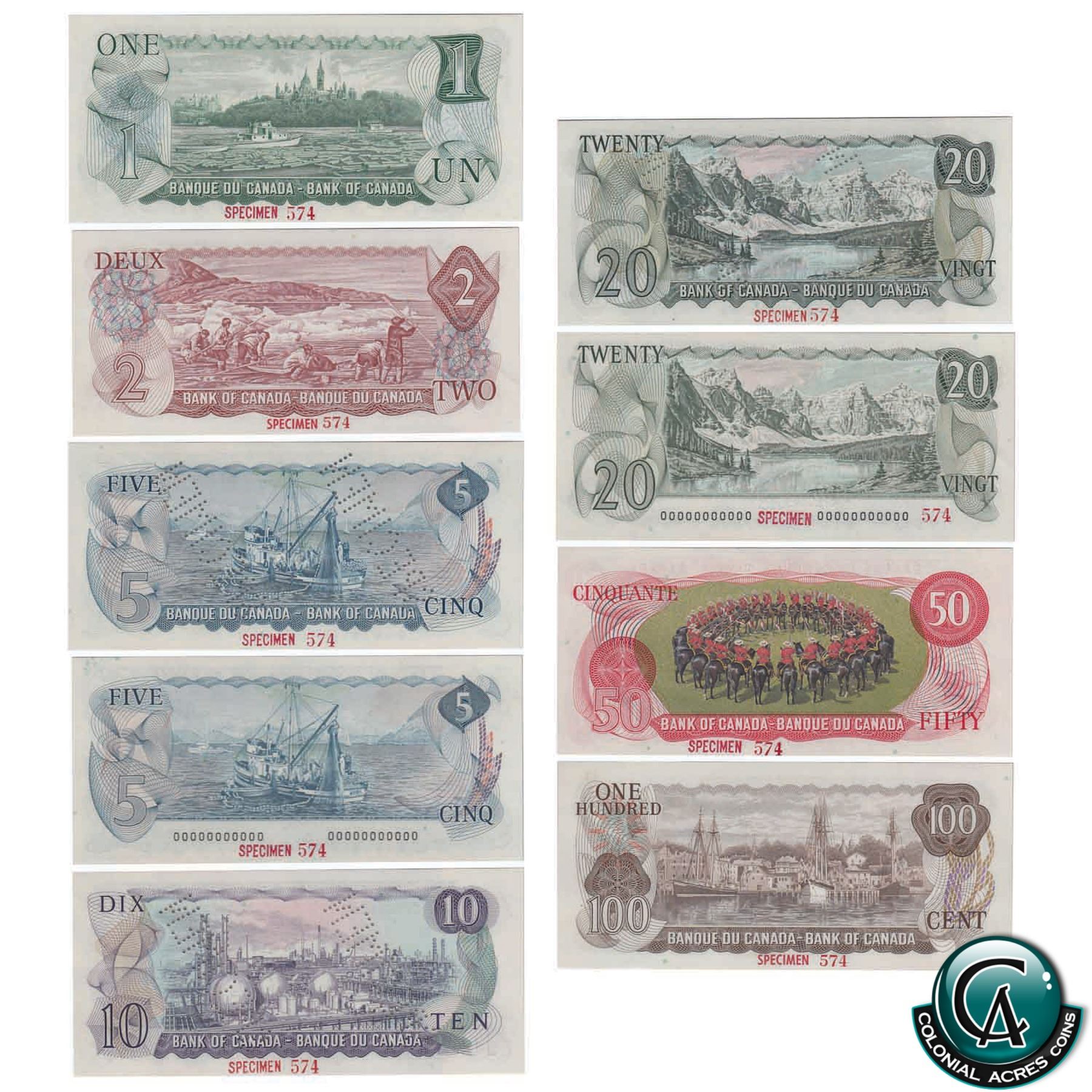 Set of 9 Matching SPECIMEN Notes of the 1969-1979 Multicolour Issues (Set#574) All BCS Certified UNC-60 to CUNC-63 Original ($1, $2, 2x $5, $10, 2x $20, $50, $100). Issued in the November 1999 Bank of Canada Sale, Hosted by Moore Numismatic Auctions, Inc. The bank of Canada sold approximately 620 to 640 notes were released of each denomination ($1-$100 & both $5's and $20's). The Set includes: 1973 $1, BC-46aS Lawson-Bouey AA Prefix (CUNC-63) 1974 $2, BC47aS Lawson-Bouey BA Prefix (UNC-60) 1972 $5 BC-48aS Bouey-Rasminsky CA Prefix (CUNC-63) 1971 $10 BC-49aS, Beattie-Rasminsky DA Prefix (CUNC-63) 1969 $20 BC-50aS, Beattie-Rasminsky EA Prefix (CUNC-62) 1975 $50 BC-51aS Lawson-Bouey HA Prefix (CUNC-62) 1975 $100 BC-52aS, Lawson-Bouey JA Prefix (CUNC-62) 1979 $5 BC-53aS, Lawson-Bouey '000' Prefix (CUNC-62), & 1979 $20 BC-54aS, Lawson-Bouey '000' Prefix (CUNC-62). A great Investment oportunity for a set that is seldom offered for sale.