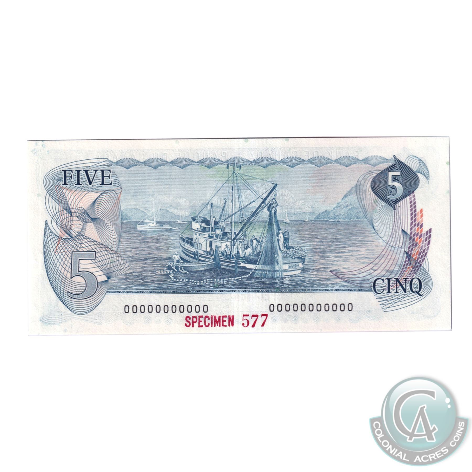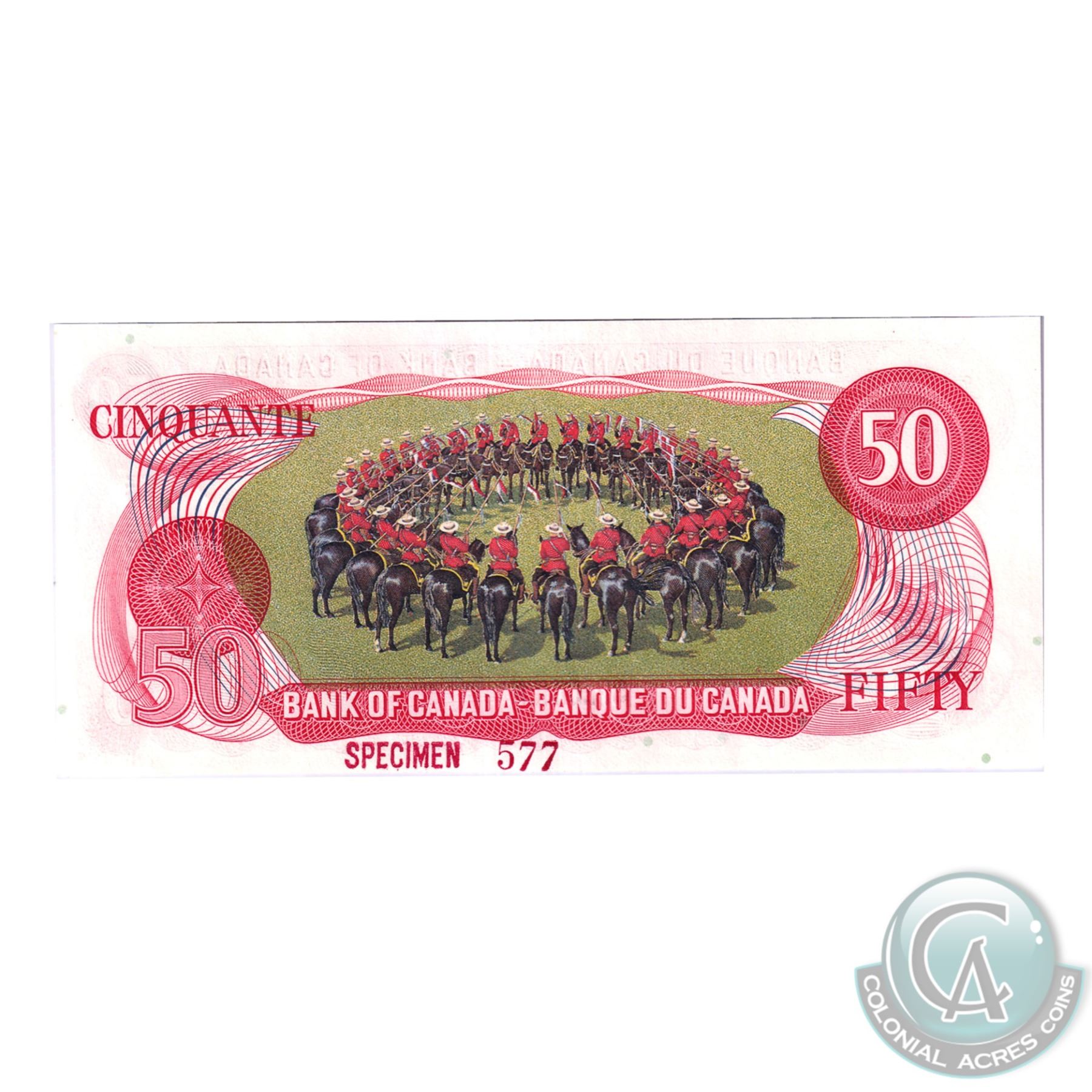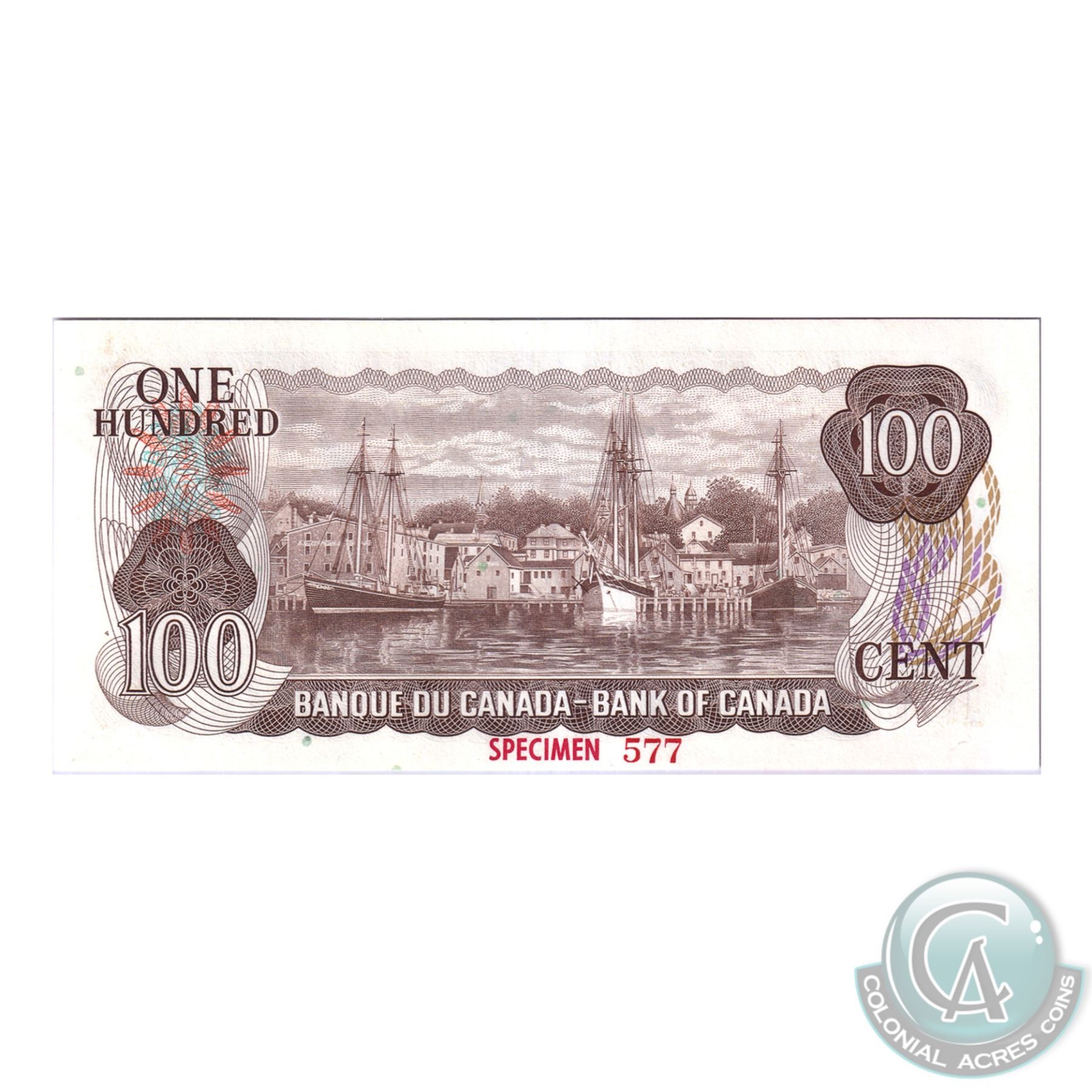 Set of 9 Matching SPECIMEN Notes of the 1969-1979 Multicolour Issues. (Set#577) All BCS Certified UNC-60 to CUNC-63 Original. ($1, $2, 2x $5, $10, 2x $20, $50, $100). Issued in the November 1999 Bank of Canada Sale. The Set includes: 1973 $1, BC-46aS Lawson-Bouey AA Prefix (CUNC-63), 1974 $2, BC47aS Lawson-Bouey BA Prefix (UNC-60), 1972 $5 BC-48aS Bouey-Rasminsky CA Prefix (CUNC-62), 1971 $10 BC-49aS, Beattie-Rasminsky DA Prefix (CUNC-62), 1969 $20 BC-50aS, Beattie-Rasminsky EA Prefix (CUNC-63), 1975 $50 BC-51aS Lawson-Bouey HA Prefix (CUNC-60), 1975 $100 BC-52aS, Lawson-Bouey JA Prefix (CUNC-62), 1979 $5 BC-53aS, Lawson-Bouey '000' Prefix (CUNC-60), & 1979 $20 BC-54aS, Lawson-Bouey '000' Prefix (CUNC-62). A great Investment opportunity for a set that is seldom offered for sale.