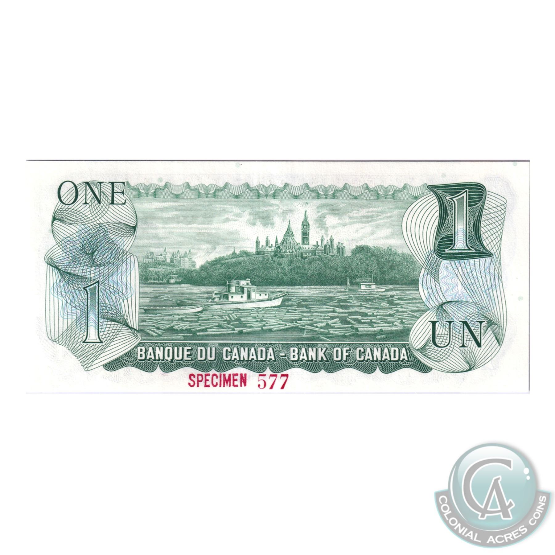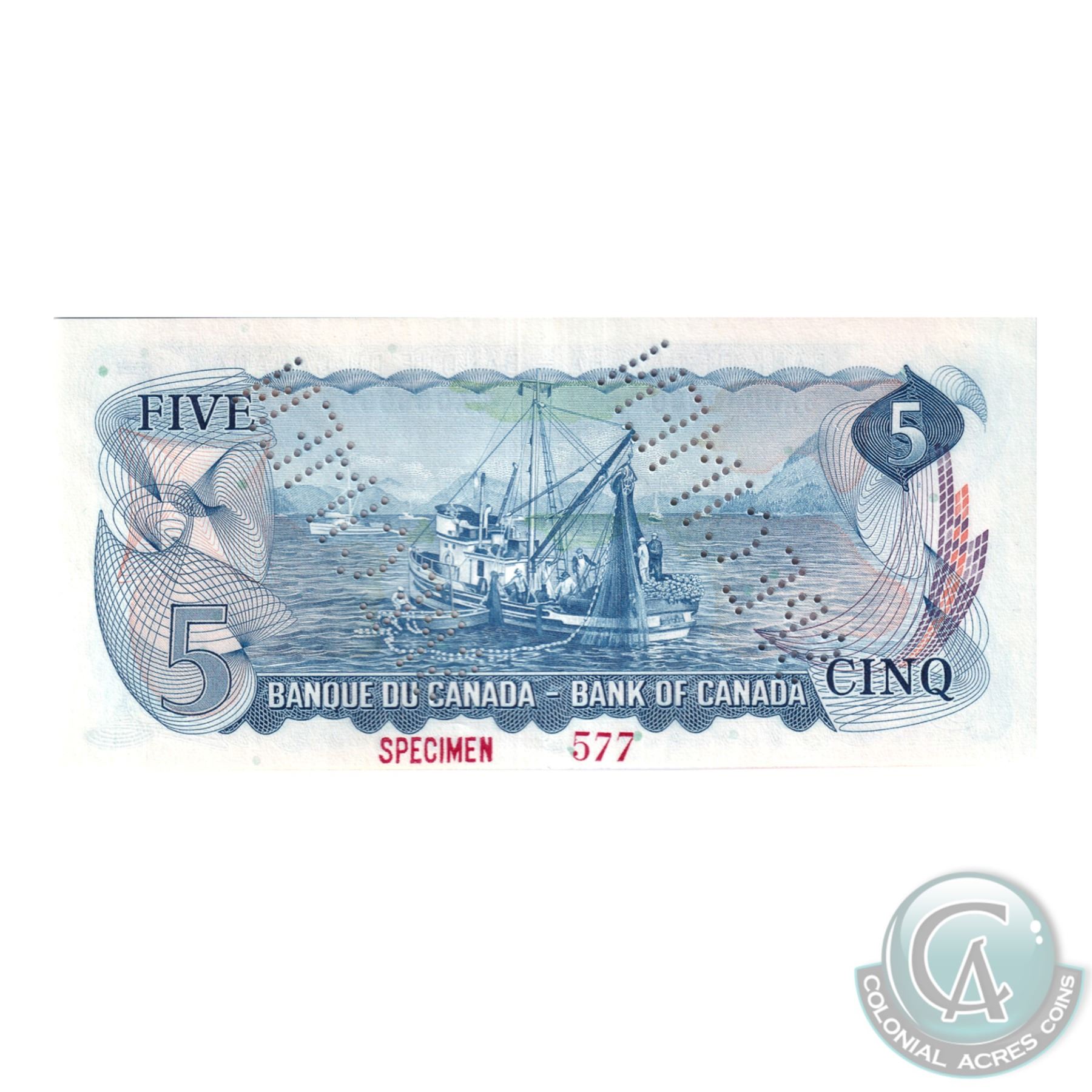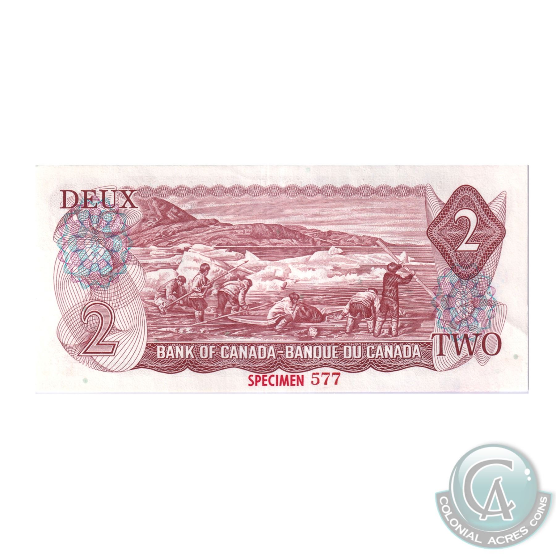 Set of 9 Matching SPECIMEN Notes of the 1969-1979 Multicolour Issues. (Set#577) All BCS Certified UNC-60 to CUNC-63 Original. ($1, $2, 2x $5, $10, 2x $20, $50, $100). Issued in the November 1999 Bank of Canada Sale. The Set includes: 1973 $1, BC-46aS Lawson-Bouey AA Prefix (CUNC-63), 1974 $2, BC47aS Lawson-Bouey BA Prefix (UNC-60), 1972 $5 BC-48aS Bouey-Rasminsky CA Prefix (CUNC-62), 1971 $10 BC-49aS, Beattie-Rasminsky DA Prefix (CUNC-62), 1969 $20 BC-50aS, Beattie-Rasminsky EA Prefix (CUNC-63), 1975 $50 BC-51aS Lawson-Bouey HA Prefix (CUNC-60), 1975 $100 BC-52aS, Lawson-Bouey JA Prefix (CUNC-62), 1979 $5 BC-53aS, Lawson-Bouey '000' Prefix (CUNC-60), & 1979 $20 BC-54aS, Lawson-Bouey '000' Prefix (CUNC-62). A great Investment opportunity for a set that is seldom offered for sale.