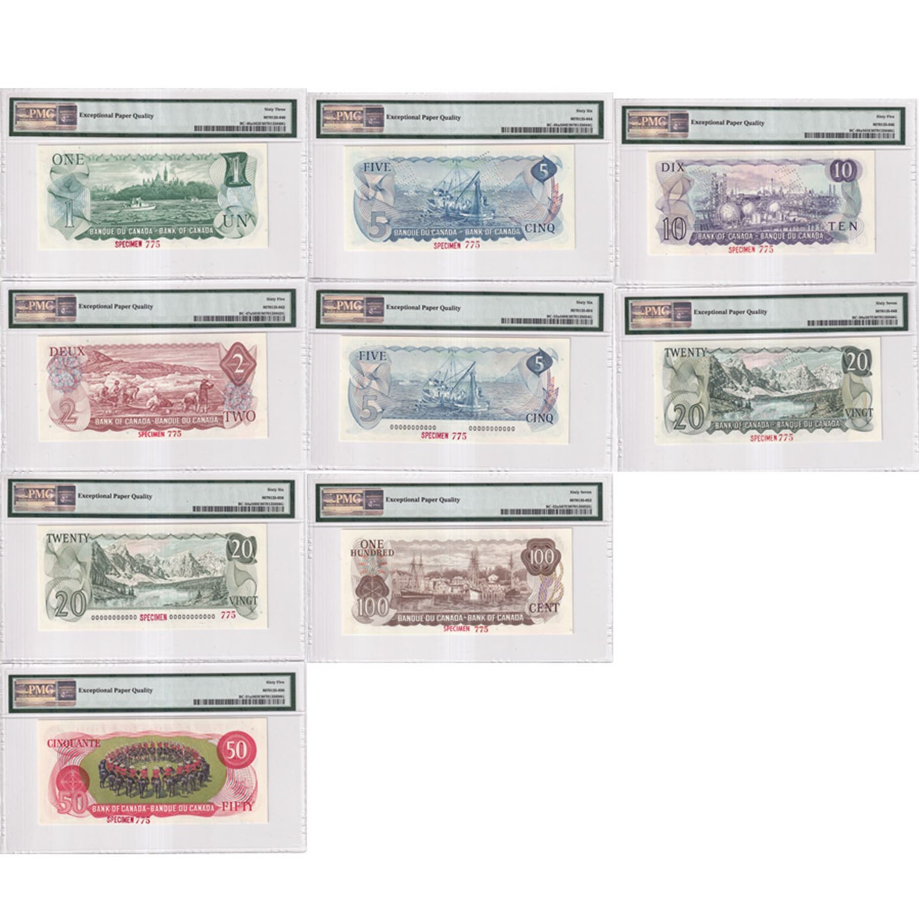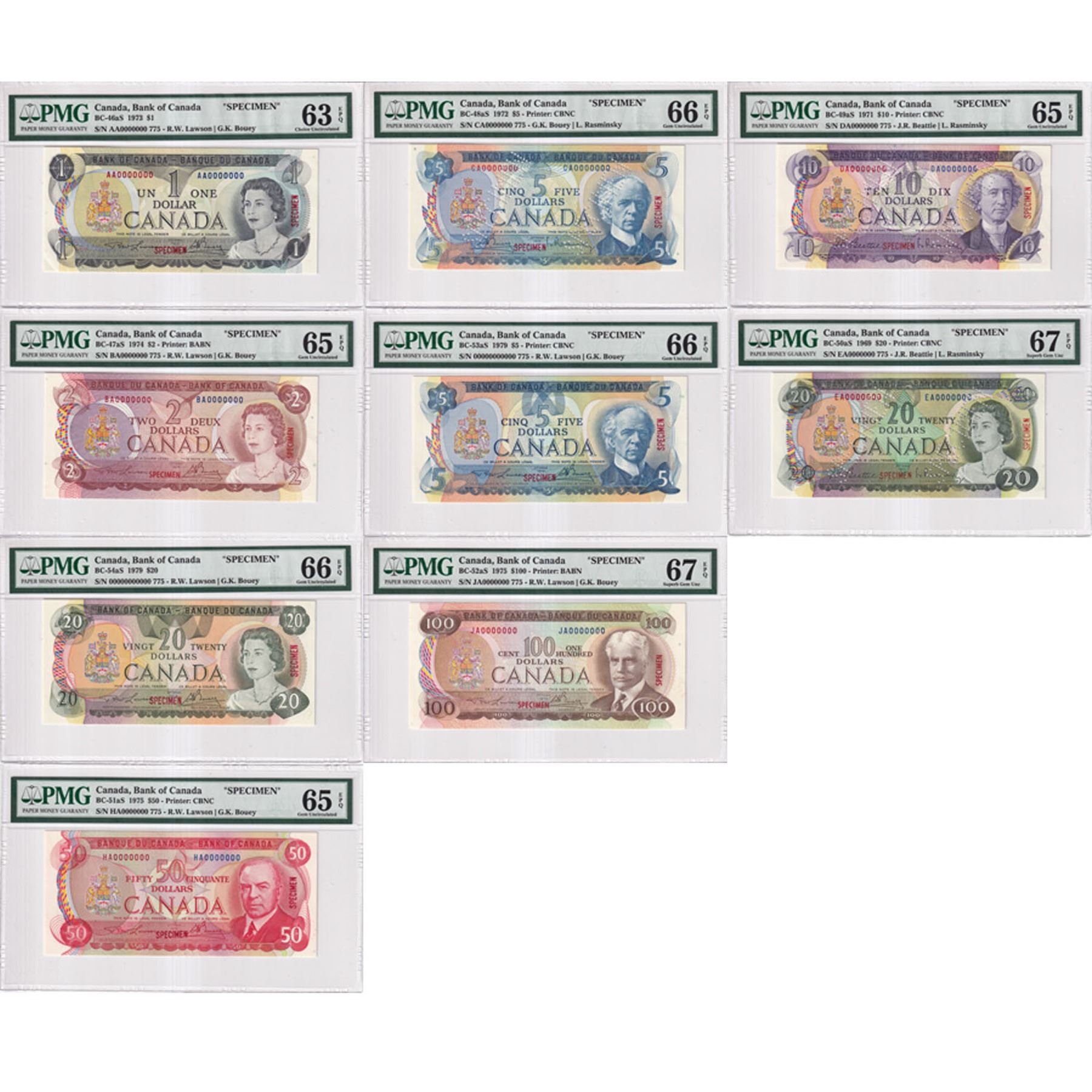 Issued in the November 1999 Bank of Canada Sale, Hosted by Moore Numismatic Auctions, Inc. The Bank of Canada sold approximately 620 to 640 notes that were released of each denomination ($1-$100 & both $5's and $20's). The Set includes: 1973 $1, BC-46aS Lawson-Bouey AA prefix (CUNC-63 EPQ), 1974 $2, BC47aS Lawson-Bouey BA Prefix (Gem UNC-65 EPQ), 1972 $5 BC-48aS Bouey-Rasminsky CA Prefix (Gem UNC-66 EPQ), 1971 $10 BC-49aS, Beattie-Rasminsky DA Prefix (Gem UNC-65 EPQ), 1969 $20 BC-50aS, Beattie-Rasminsky EA Prefix (Superb Gem UNC-67 EPQ!), 1975 $50 BC-51aS Lawson-Bouey HA Prefix (Gem UNC-65 EPQ), 1975 $100 BC-52aS, Lawson-Bouey JA Prefix (Superb Gem UNC-67! EPQ), 1979 $5 BC-53aS, Lawson-Bouey '000' Prefix (Gem UNC-66 EPQ), & 1979 $20 BC-54aS, Lawson-Bouey '000' Prefix (Gem Unc-66 EPQ). A Premium Graded Set makes for a great Investment opportunity for a set that is seldom offered for sale.