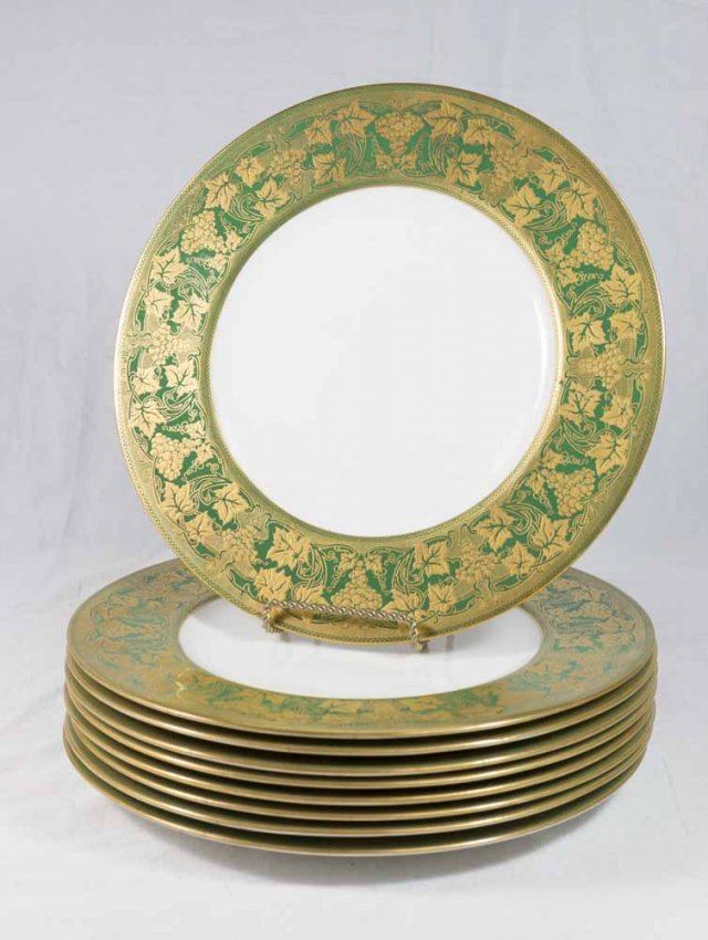 Approx. 10 1/2" diameter. Heavily-encrusted gold border, grape & leaf design.