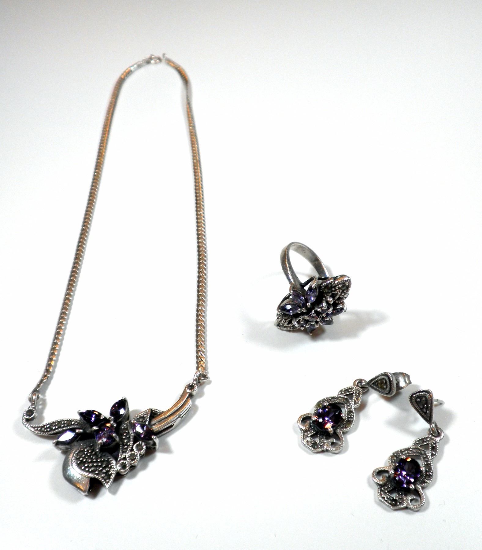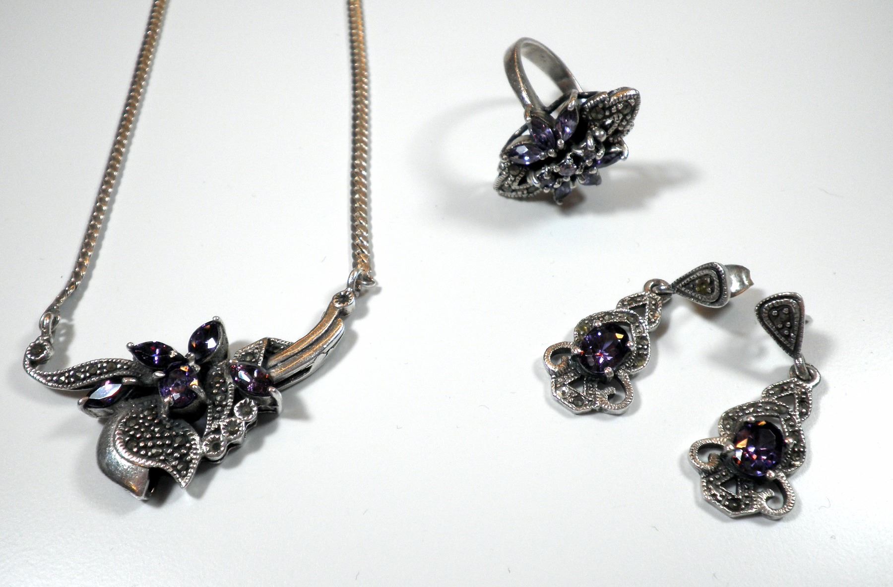 Set of 925 sterling silver jewels with amethyst and marcasite settings: necklace, ring and a pair of earrings, a number of marcasites are missing. Total weight: 35.6 gm, length of necklce: 40 cm, ring size: 9.