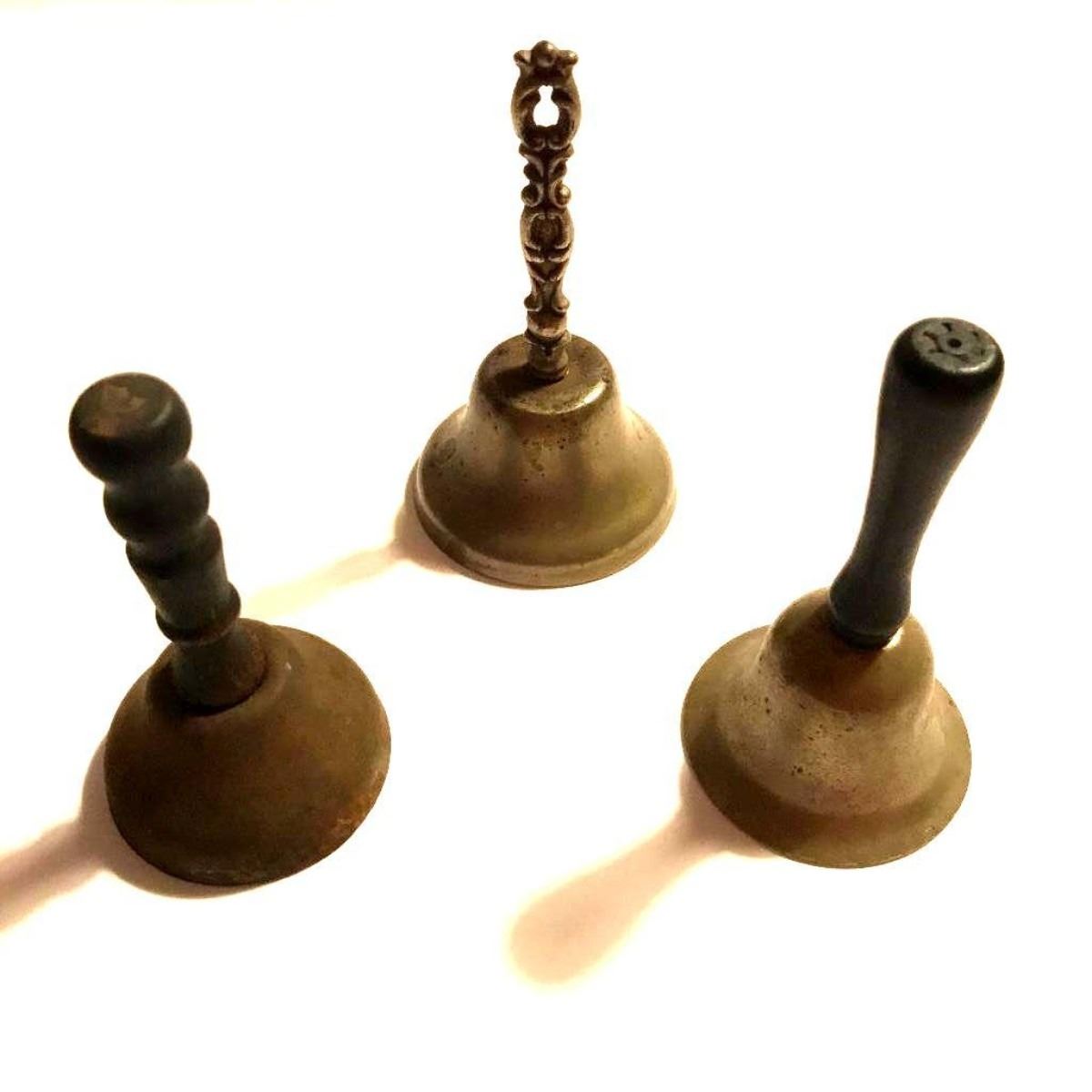 Set of three antique, Victorian Edwardian era bells for calling servants, butler. One with ornate pierced handle, the others with wooden handles. 3 3/4", 4", 4 1/2" H.Â