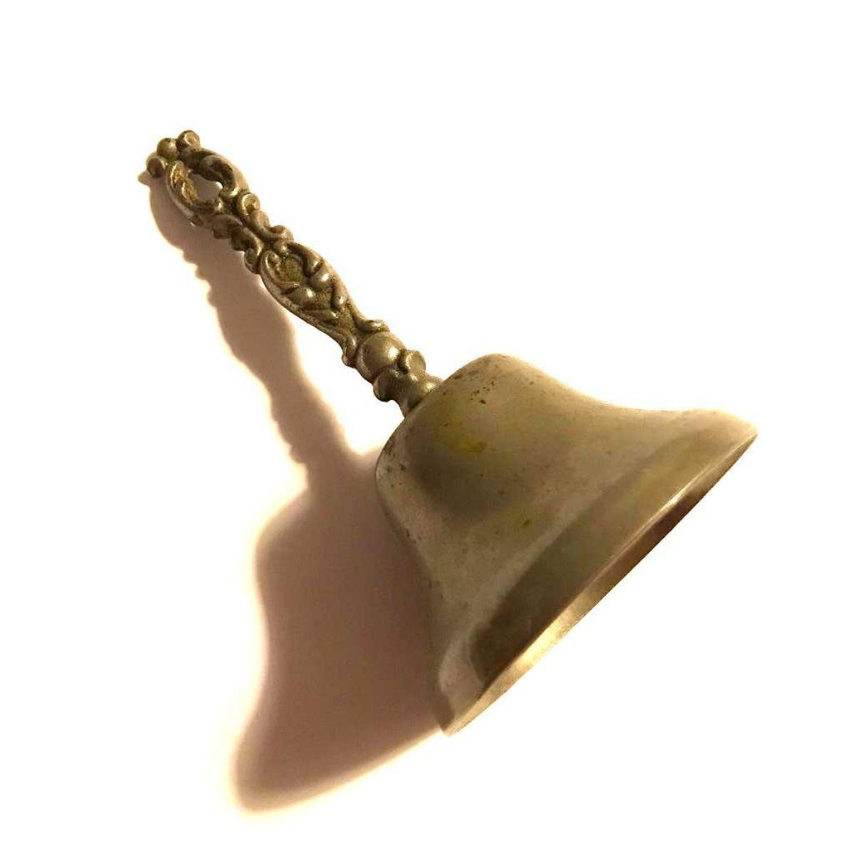 Set of three antique, Victorian & Edwardian era bells for calling servants, the butler. One with ornate pierced handle, the others with wooden turned handles. 3 3/4", 4", 4 1/2" H.Â