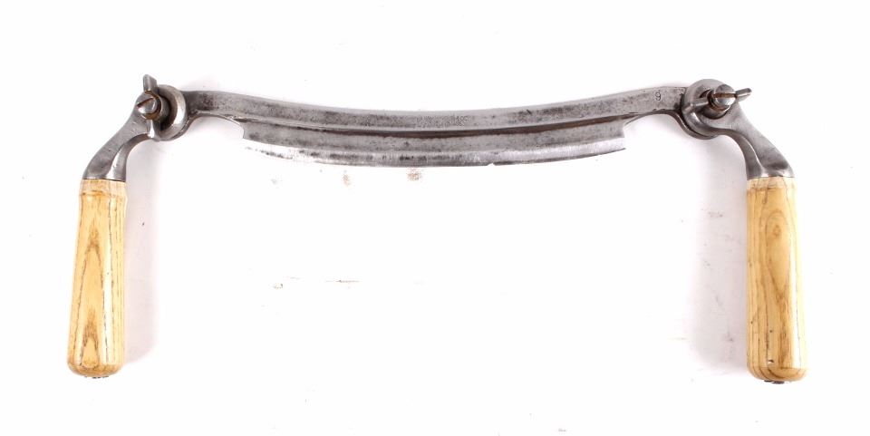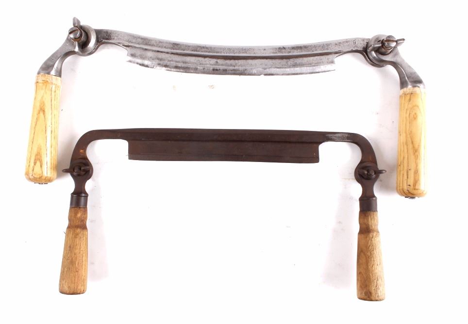 This lot features a set of two antique draw knives. First up is a A.J. Wilkinson & Co. 9" Draw knife with adjustable handle. Also in this lot is a Pexto 8" draw knife with adjustable handle. Both draw knives in this lot are in good condition. Measures: 9" Blade Length, 8" Blade Length