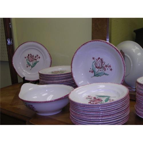 Very complete set of art deco dishes from Strasbourg, France. 48 dinner plates,24 soup plates, 24 dessert plates, 2 covered terrines, 2 round soup platters, 2 gravy boats, 4 small oval aperitif plates, 2 large oval platters, 2 large round platters, 2 large round vegetable platters.