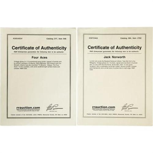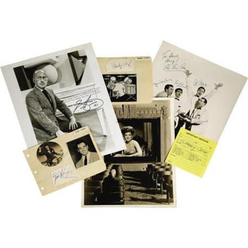 <B>Various Music Celebrity Autographs.</B></I> Included are b&w 8" x 10" photos signed by Sammy Cahn, Jack Norworth, and the Four Aces; as well as autograph cuts from Bobby Ricky and Gene Krupa. Items are in overall Very Fine condition with mild wear.<BR><BR><b>Shipping:</b> Flat Material, Small (<a target="_blank" href="http://www.heritageauctions.com/common/shipping.php">view shipping information</a>)