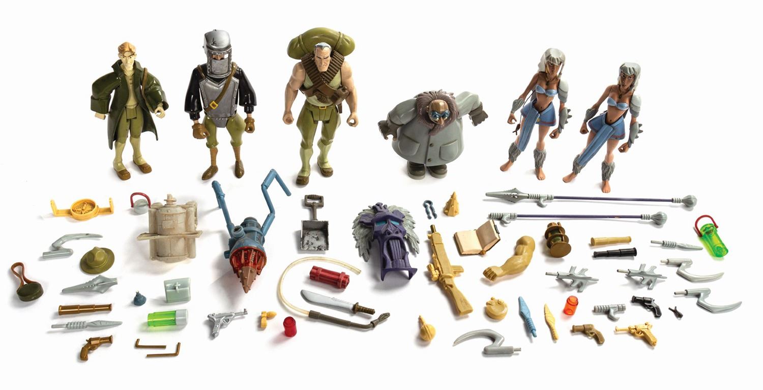 (Disney, c.2001) A collection of (6) toy prototypes for characters from Atlantis: The Lost Empire. These prototypes include Milo, Rourke, Vinny, Moliere, and two versions of Princess Kida. These figures come with a large variety of accessory pieces, both painted and unpainted. The characters range in size from 4.5" to 7" tall, and the condition is good overall with some scuffs and wear throughout from use. One of the accessory items is marked in ink with an approval date of 11/9/00.