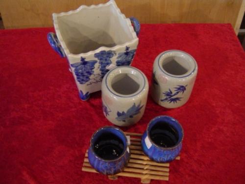 5 pots, assorted styles, 2.5" to 6", and bamboo stand
