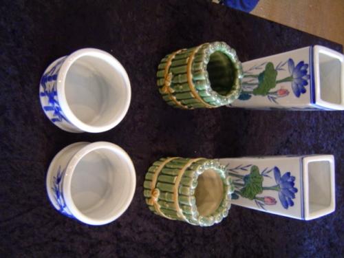 6 pots, assorted styles, 2" to 6.5", and one bamboo stand