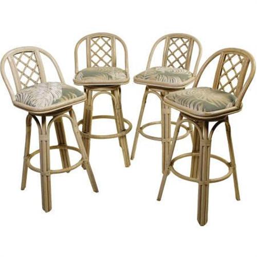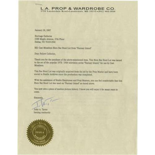 <B>Set of Bar Stools from "Fantasy Island."</B></I> A set of four island-themed bar stools from the beloved and long-running (seven seasons) television show. Though they each measure 30" high - 43" with the chairbacks - Tattoo had no problem joining "Boss" (aka Mr. Rourke, aka Ricardo Montalban) on the tall chairs to discuss the fantasies of their guests. "Smiles everyone. Smiles!" In Very Good condition with visible wear to the chairs' frames, but cloth seats all intact, and production marks on the seats' undersides. <I> Accompanied by COA from L.A. Prop and Wardrobe Co.</B></I><BR><BR><b>Shipping:</b> Requires 3rd Party Shipping (<a target="_blank" href="http://www.heritageauctions.com/common/shipping.php">view shipping information</a>)