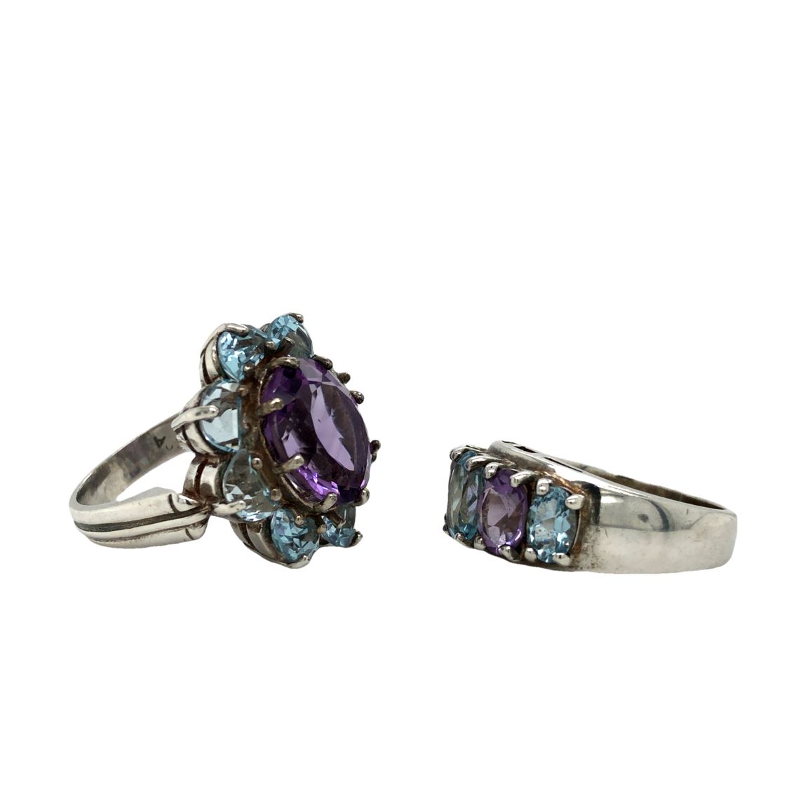 DESCRIPTION DETAIL: A set of Blue Topaz and Amethyst set rings, one in a floral design, the other an alternating color band, both in Sterling Silver.