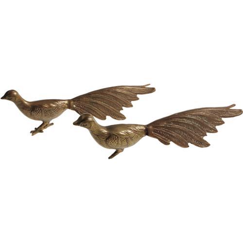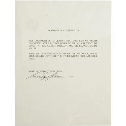 <B>Set of Brass Peacocks From Vernon Presley.</B></I> Elvis Presley liked peacocks. He wore a "Peacock" costume in his concerts. At Graceland there is a stained glass doorway by the grand piano, embellished with peacocks. And live peacocks roam free on the Graceland estate. In concert with the peacock motif, here's a pair of 11" ornamental brass peacocks given by Vernon Presley to close family friend, Aurelia Dupont. In overall Very Fine condition with some mild wear and tarnishing -- one of the peacocks is missing its feet. <I>From the Aurelia Dupont Collection</B></I>.<BR><BR><b>Shipping:</b> Miscellaneous Collectibles, Larg (<a target="_blank" href="http://www.heritageauctions.com/common/shipping.php">view shipping information</a>)