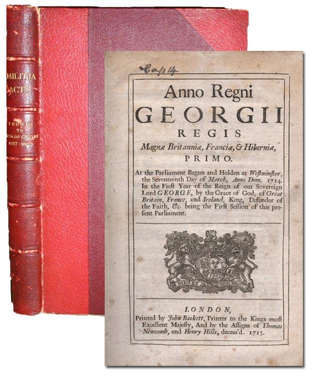 Bound collection of English acts promulgated from the 1300's to 1700's, most relating to the militia including those affecting the American colonies, during the reigns of Edward III, Mary I, Charles II, William III, Anne, George I, George II and George III. Printed circa 1800, with 236 total pages of acts, bound in an 8.5'' x 12'' book with marbled endpapers in half leather binding. Four spine compartments between five raised bands, titled in gilt: ''Militia Acts / I EDW III To 3940 GEO III / 1327-1800.'' Very good condition.