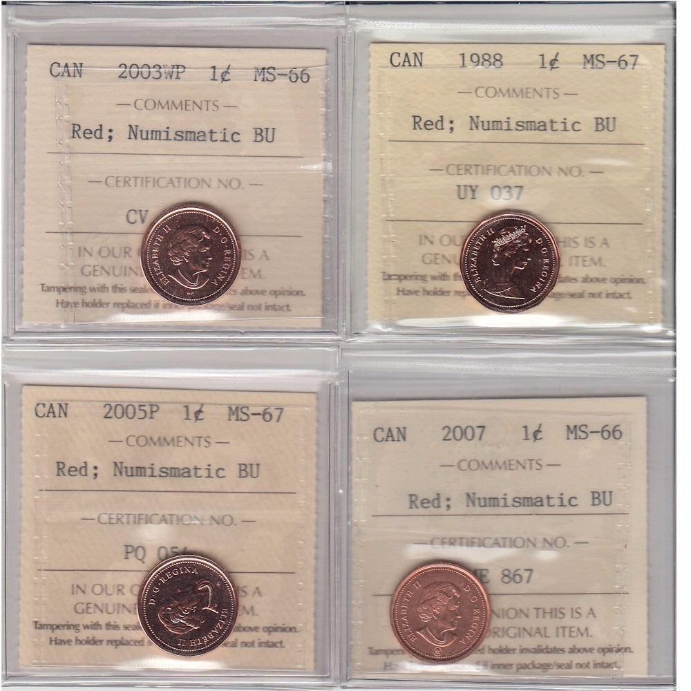 Set of Canada 1-cents ICCS Certified 1988 MS-67 NBU, 2003WP MS-66 NBU, 2005P MS-67 NBU & 2007 MS-66 NBU. 4pcs