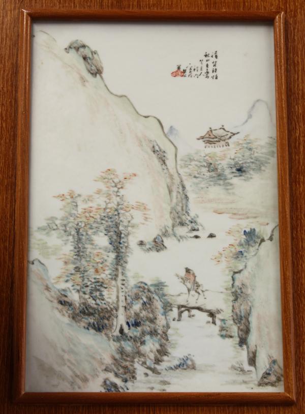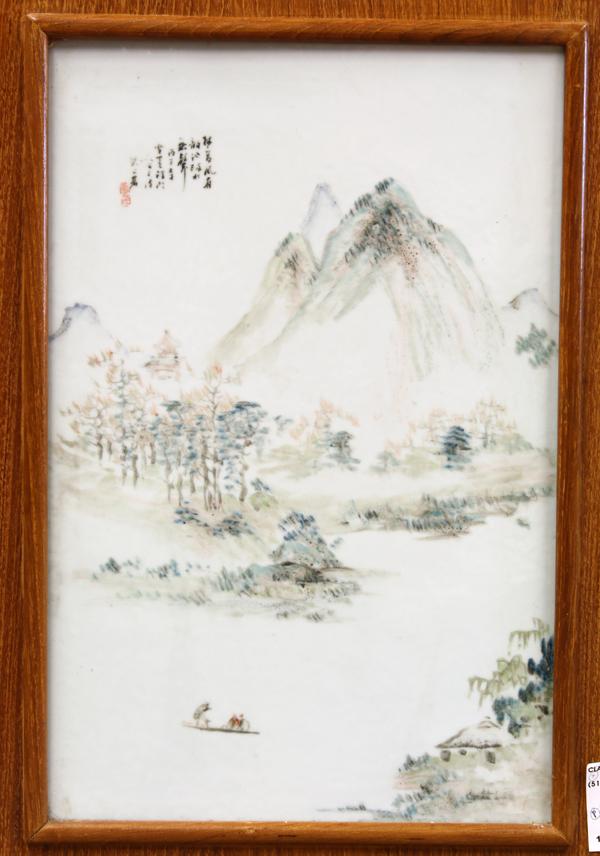 Pair of Chinese wooden panels with polychrome enameled porcelain plaques, late Qing dynasty, each of the four rectangular plaques expertly painted in pale colored enamels with figures in a landscape setting, one rendered in a rather impressionistic literati style, others with the landscape elements executed in a more traditional manner, each inscribed with a poetic colophon of varying length and signed 'Cheng Men' or 'Li daoren' (Cheng Men, 1833-1908) preceded by painted seals, all set into a natural and zitan-stained wood frame, overall: 72.25''h x 17''w, porcelain: 15''h x 9.75''w; Provenance: ex-collection of Mrs. Woo Chen Zon Yin, purchased at Sotheby Parke Bernet, Hong Kong, November 4, 1974, lot #337, by Reynold Tom of Oakland, now offered by his family